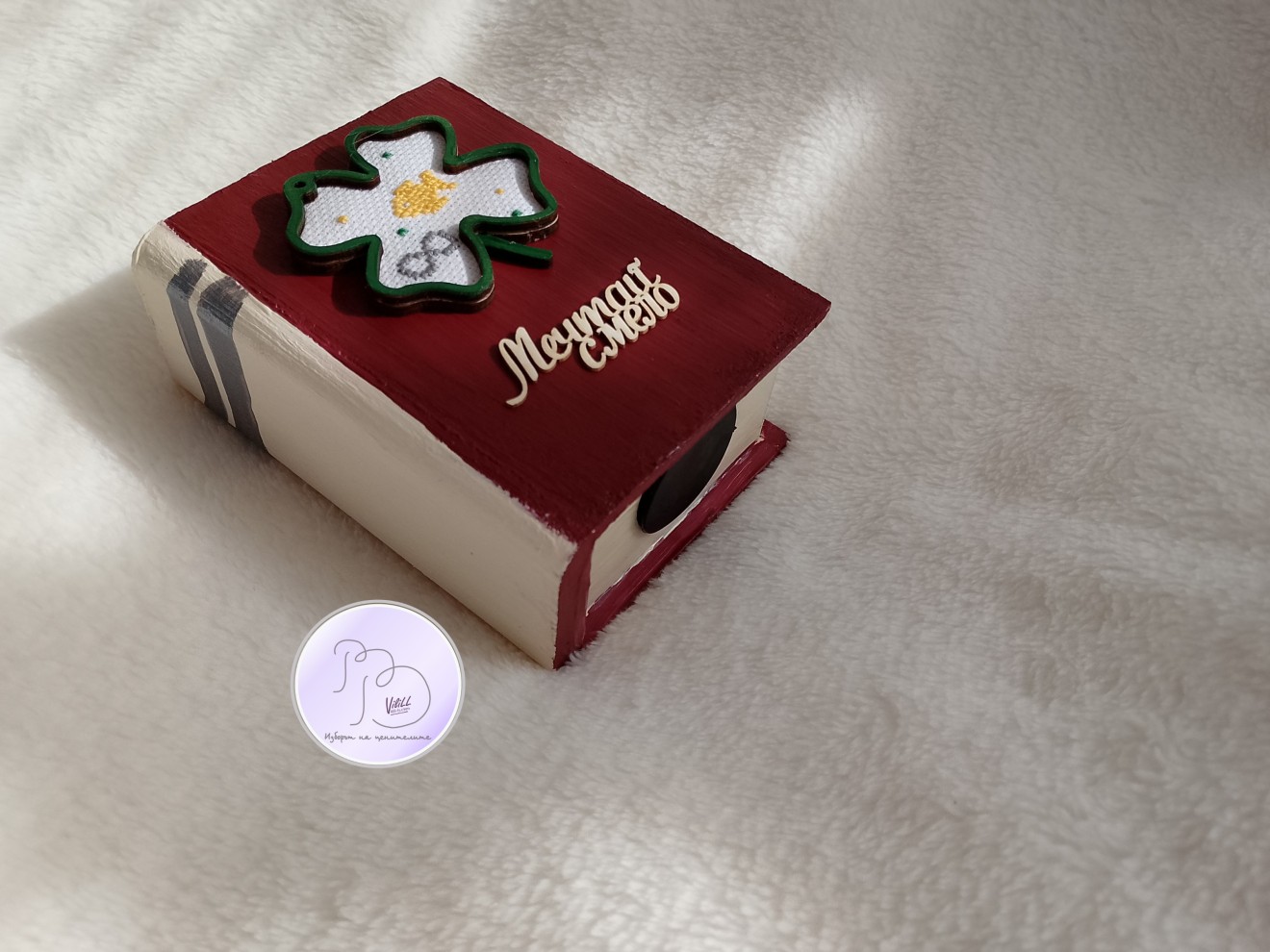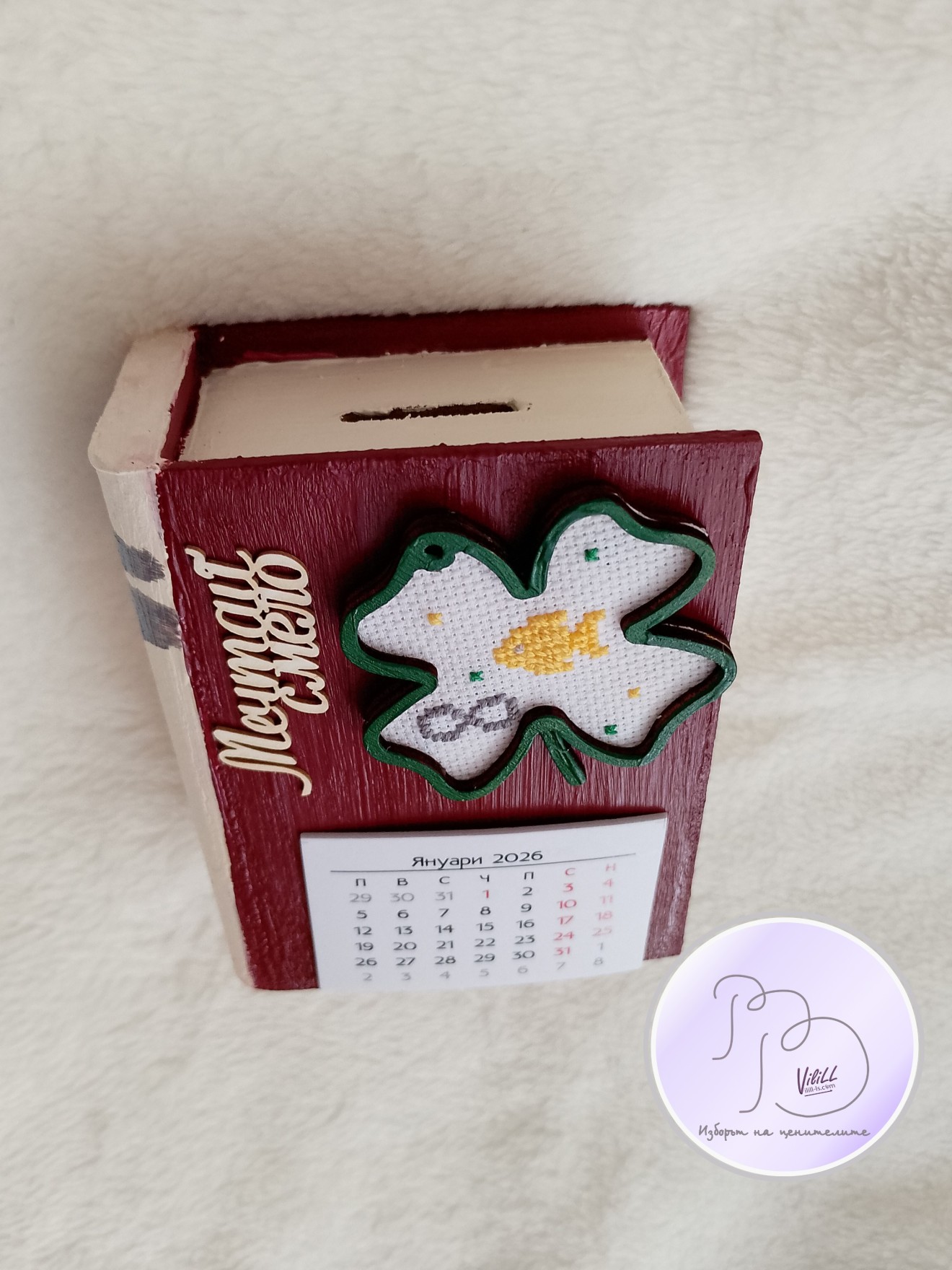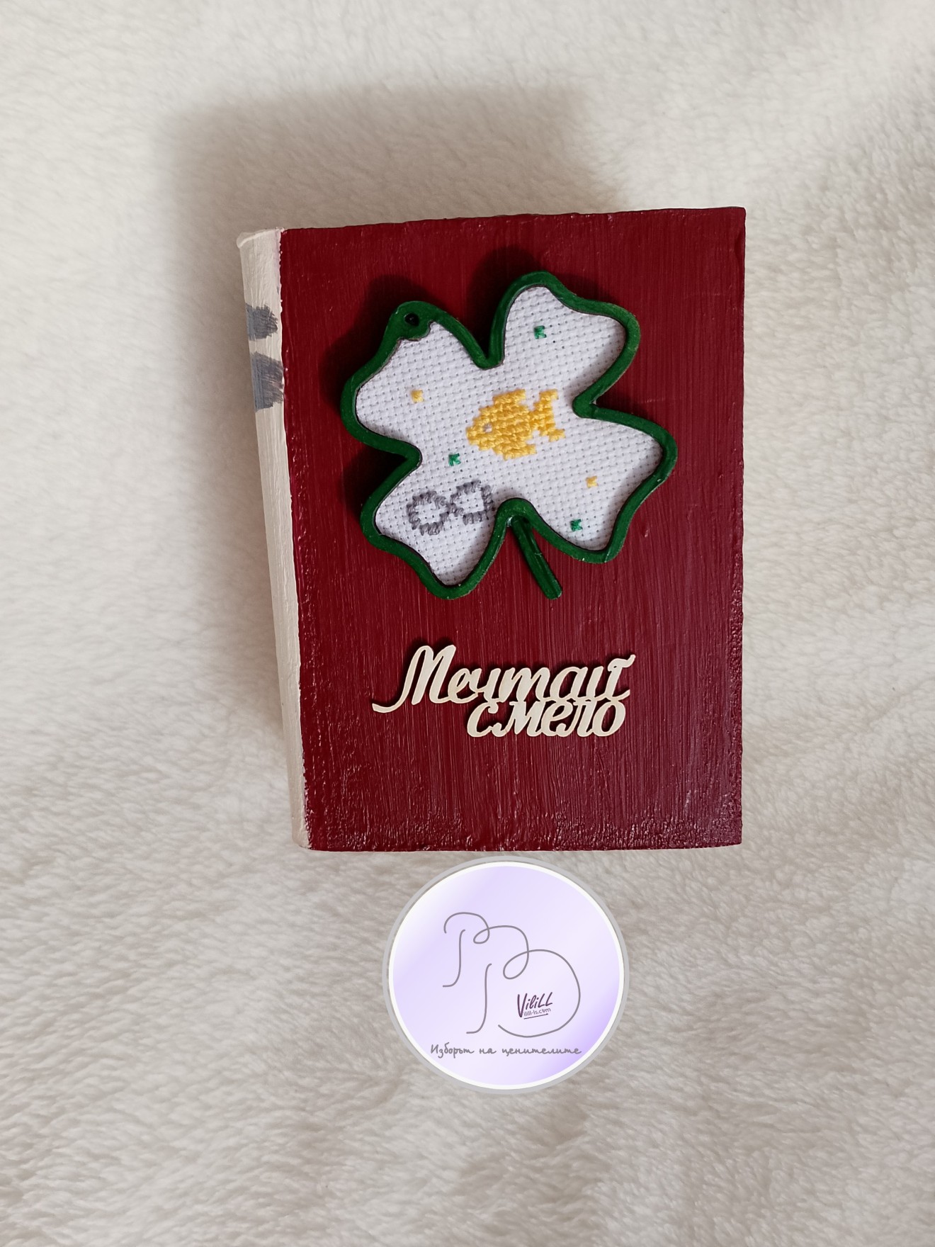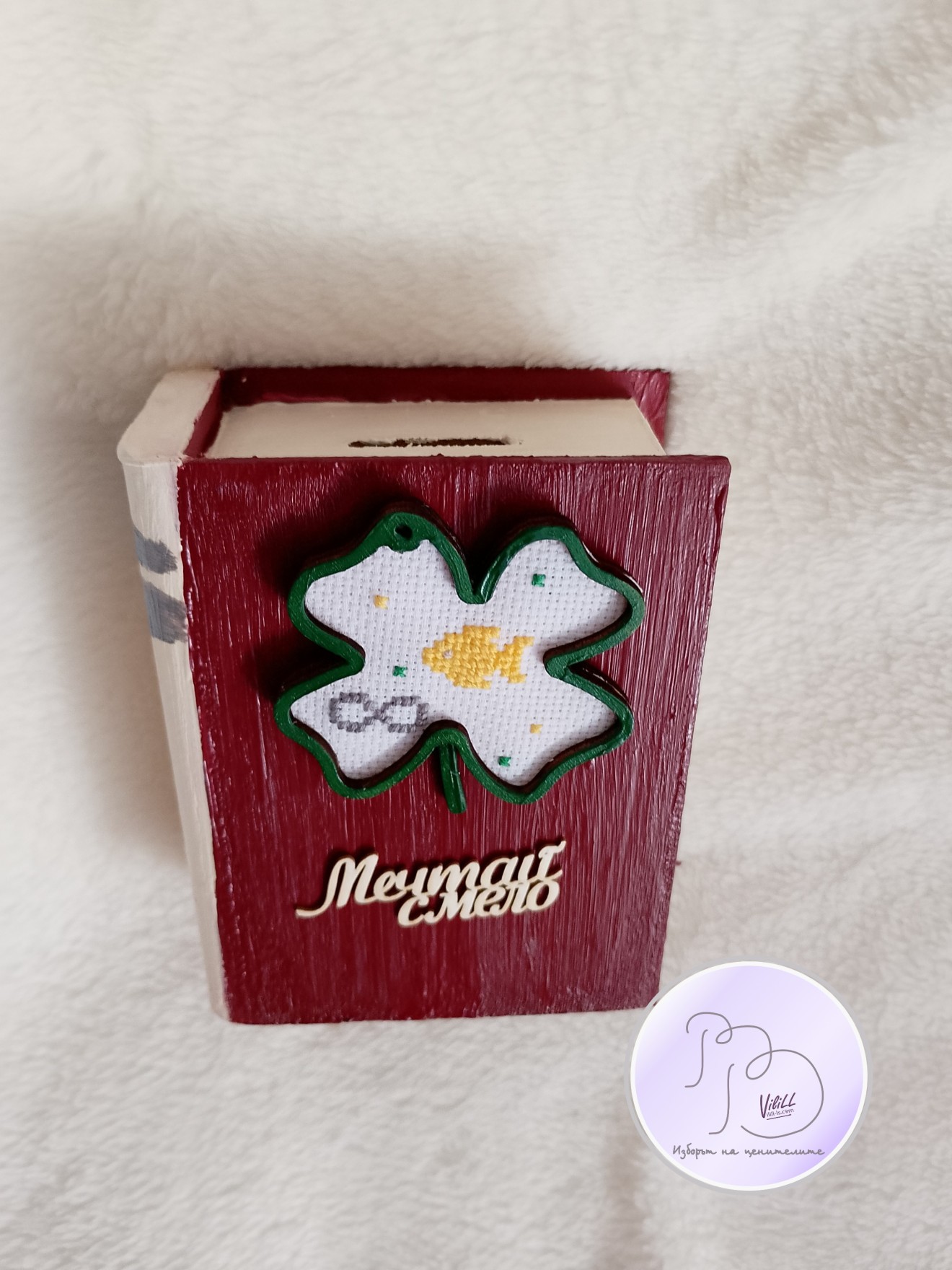Книга-касичка, декорирана с ръчно бродирана златна рибка е отлична идея за атрактивен и практичен подарък за наближаващите декемврийски празници. Спестете пари-осъществете мечти! Възможни комбинации разгледайте и изберете сред снимките. Може вариант касичка и касичка-календар. Приблизителни размери:12.4х9.5х5 см. Материал: -тяло касичка- МДФ. -акрилни бои. -надпис-бирен картон. -детелинка-шперплат. -ръчна бродерия- панама/плат и конци. -12 листчета с месеците. Цена: 20.00лв./10.23 евро/1 касичка. Доставка до офис на Еконт за сметка на получател. 10% от цената дарявам за развитието на платформата! При интерес- на Ваше разположение съм да обсъдим подробностите. Facebook-РъкоВелиеViliLL