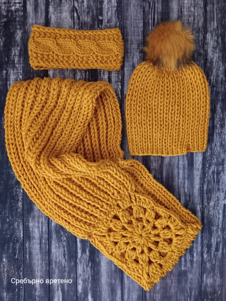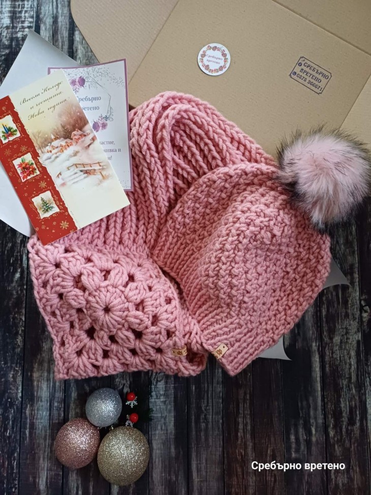 Не е ли чудесен тази комплект? Даааа! Шалът е идеален! Има и идеалната шапка за него! Всичко е съчетано. За теб! Или за чудесен подарък! А най-хубавото е, че е ръчно плетен на две игли, но за разкош и бутиков щрих е добавен красив акцент, изплетен на една кука. Изглеждат чудесно, топли са, здрави са, поддържат се лесно. С авторски кожен етикет. В подаръчна кутия със стикер Сребърно вретено. Висококачествена прежда: 30% Вълна, 70% Акрил. Шал с ширина 20 см и обиколка 150 см. Шапка с разкошен помпон. Машинно пране с програма и препарат за плетени и деликатни дрехи. Сигурна и бърза доставка с преглед преди плащане. Ако ни се доверите, ще отговорим с добро обслужване, оправдаване на очакванията и коректност. Последвайте Сребърно вретено във Facebook, за да научавате за намаления и нови изделия. Посетете албума Зимни шалове, шапки и ленти, за да се запознаете с нашата топла и комфортна колекция. Поискайте ги заедно или поотделно. Пишете ни! С поздрав, Ваша Стаси и семейството.