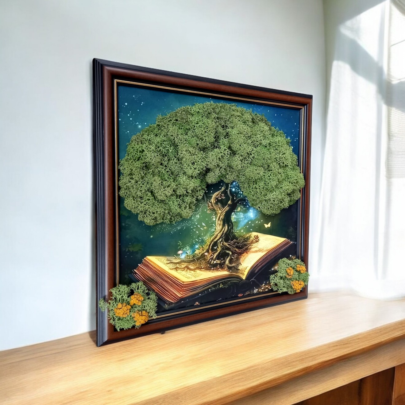 🌟 Картина „Дървото на историите“ 🌿📖 Комбинация, която носи спокойствие, уют и вдъхновение във всеки дом. Подходящ подарък за любители на изкуството, книги, фантазия и природа. ✨ ✨ Без поддръжка – запазва своя чар с години. 🌿 Жив, естествен мъх 🌼 Цветни акценти от сухи цветя 💫 Арт визия с магическо излъчване 🎁 Идеален подарък за всякакъв повод