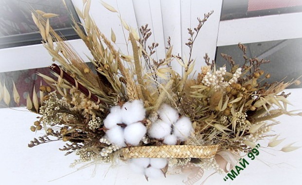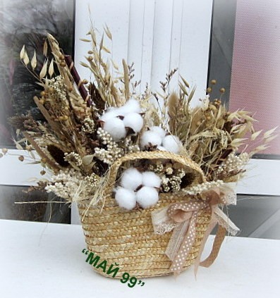 Сламена плоска кошничка 20/10/15 см. с памук и сухи треви и елементи и двуцветна красива панделка! Чудесен подарък!