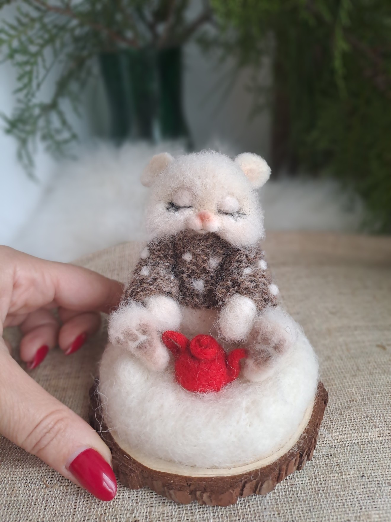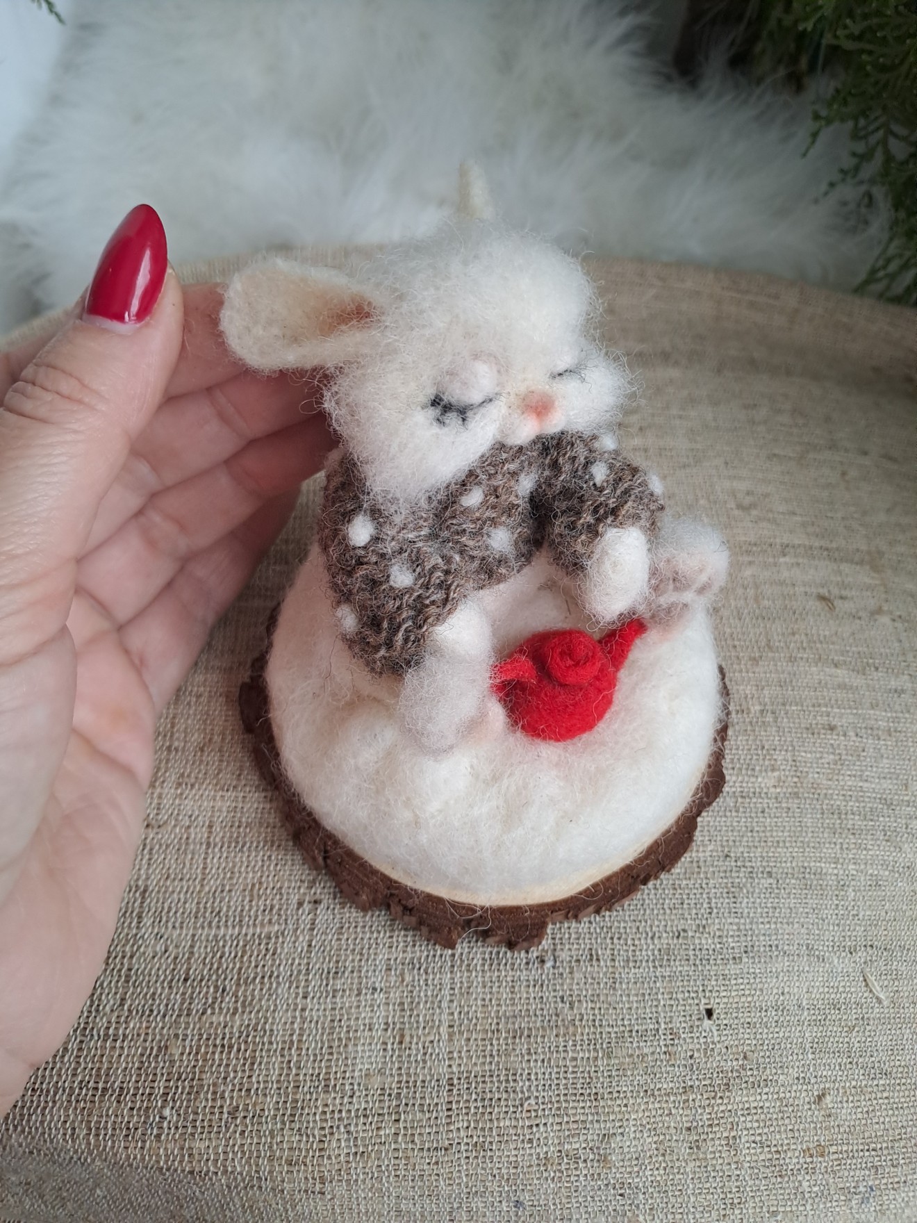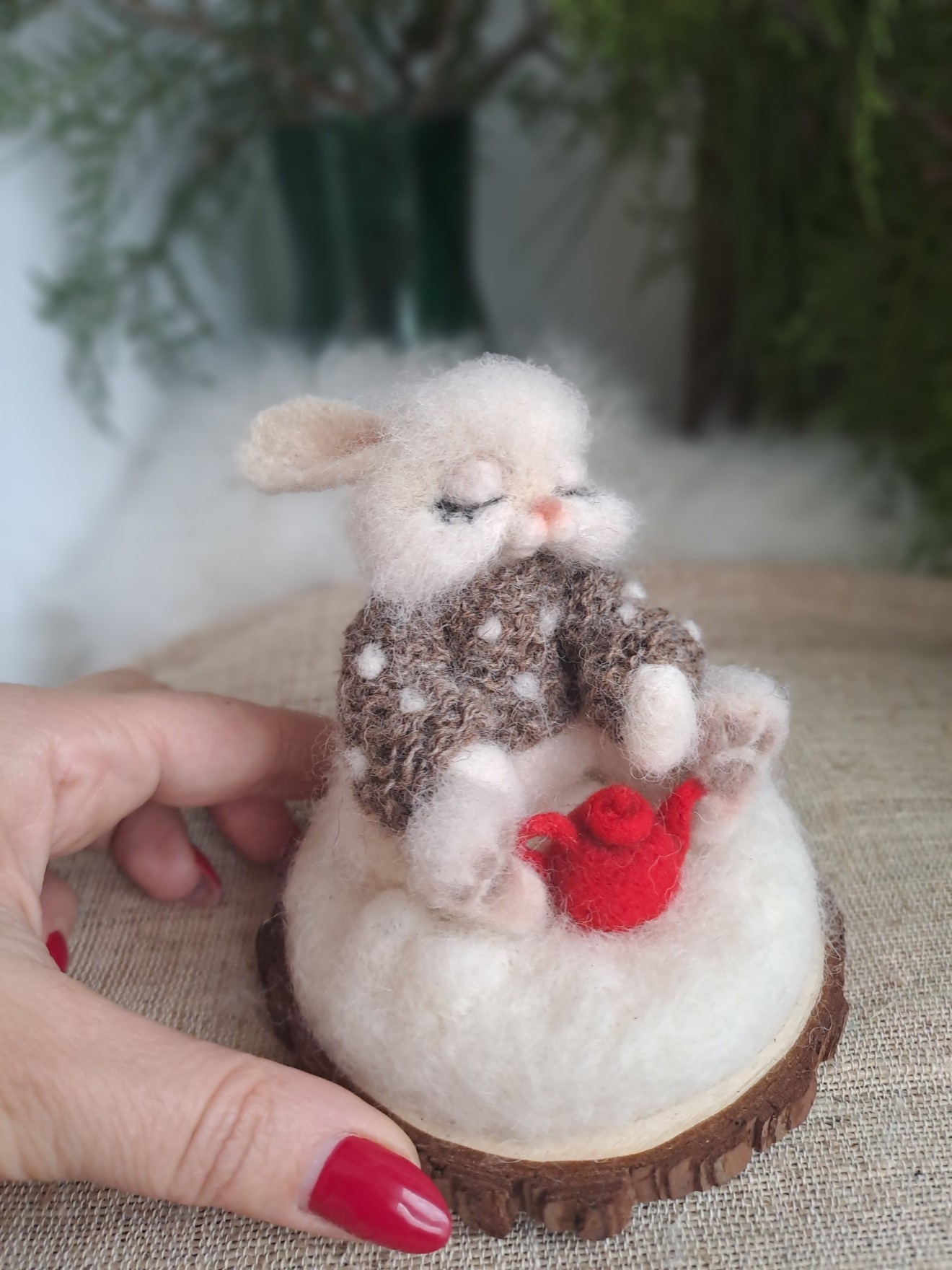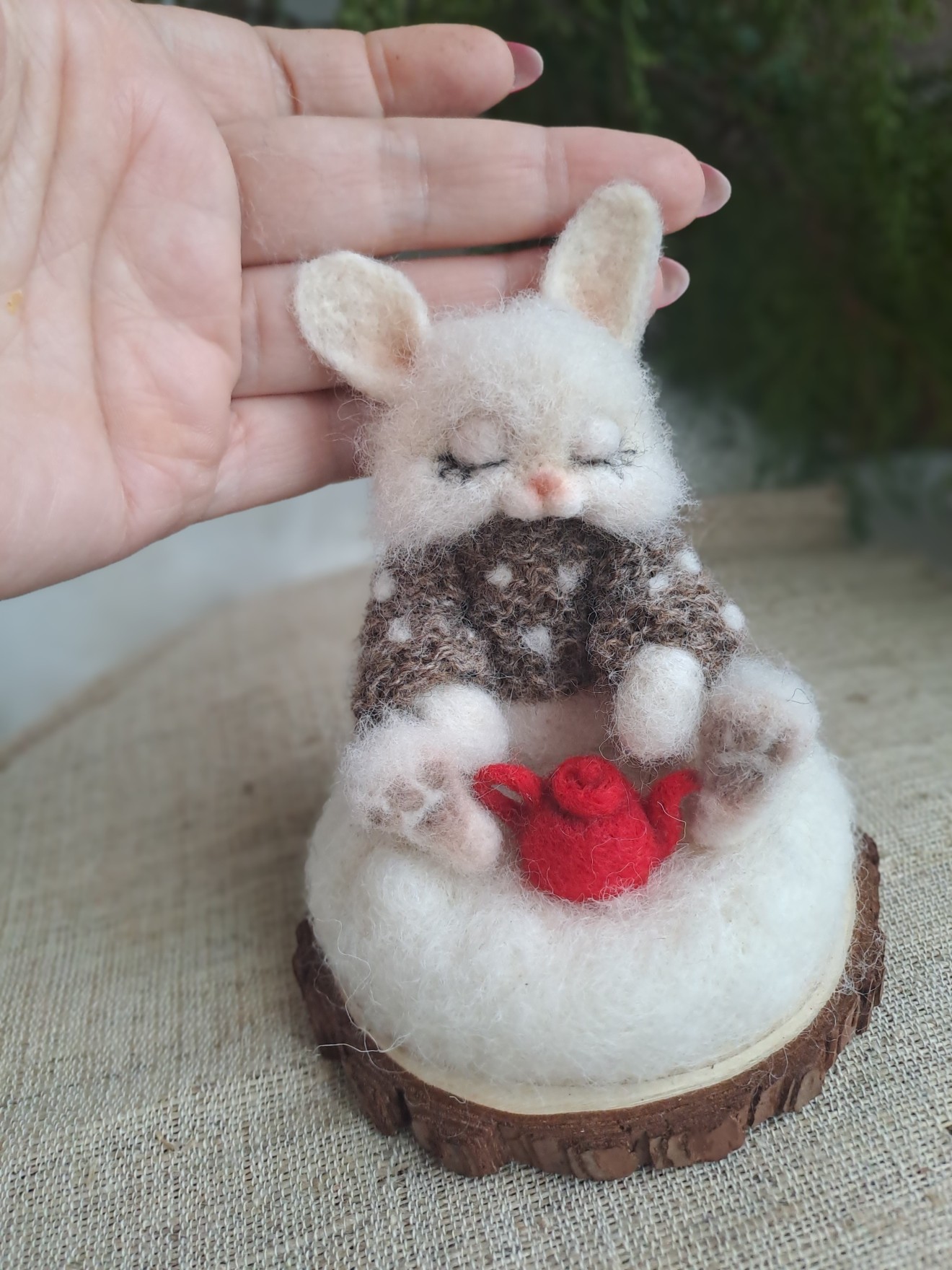 Бело, малко, пухкаво зайче с чайник. Изработени са от вълна. Закрепено върху дървена стойка.
