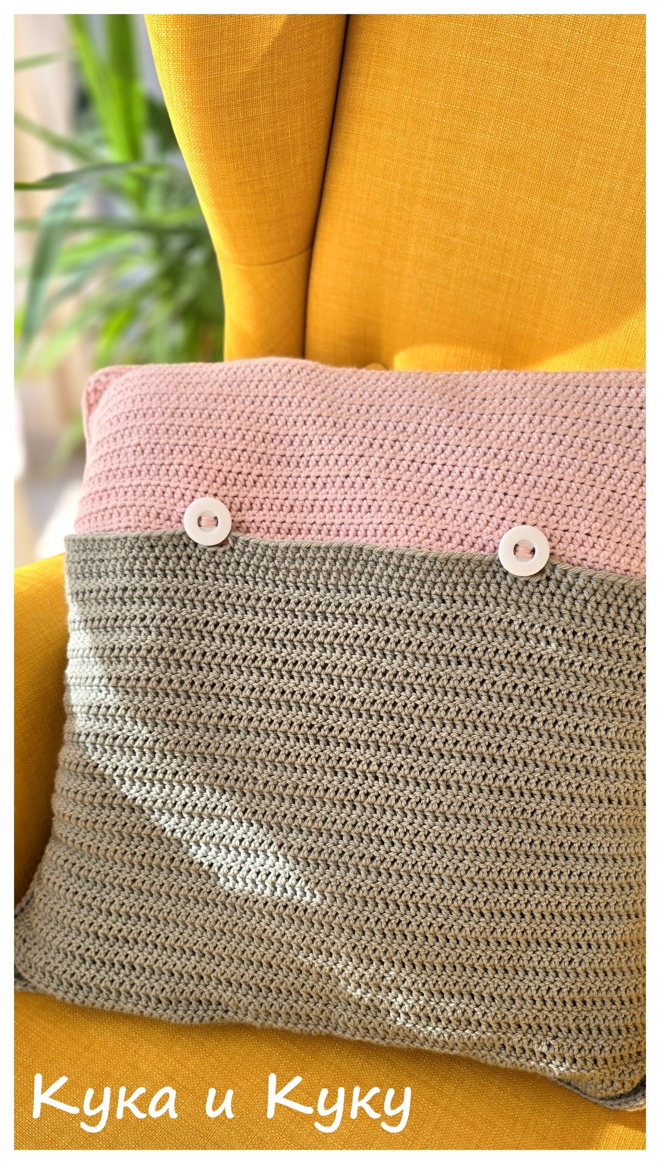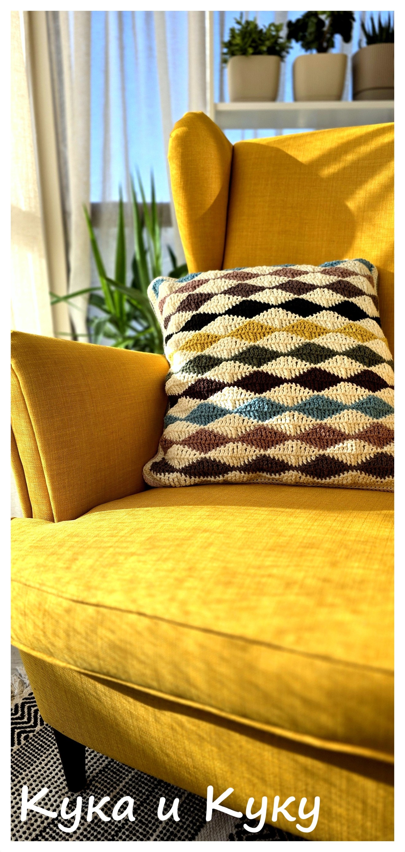 Ръчно плетена калъфка за възглавница с размери 50х50 см. Изработена от висококачествена прежда в състав мериносова вълна и алпака. Лице – основа от екрю и 9 цветни акцента. Гръб – зелено и розово. Калъфката се предлага без пълнеж. Пране – ръчно, с хладка вода, или машинно – на програма за деликатно пране, без центрофуга. Хоризонтално сушене.