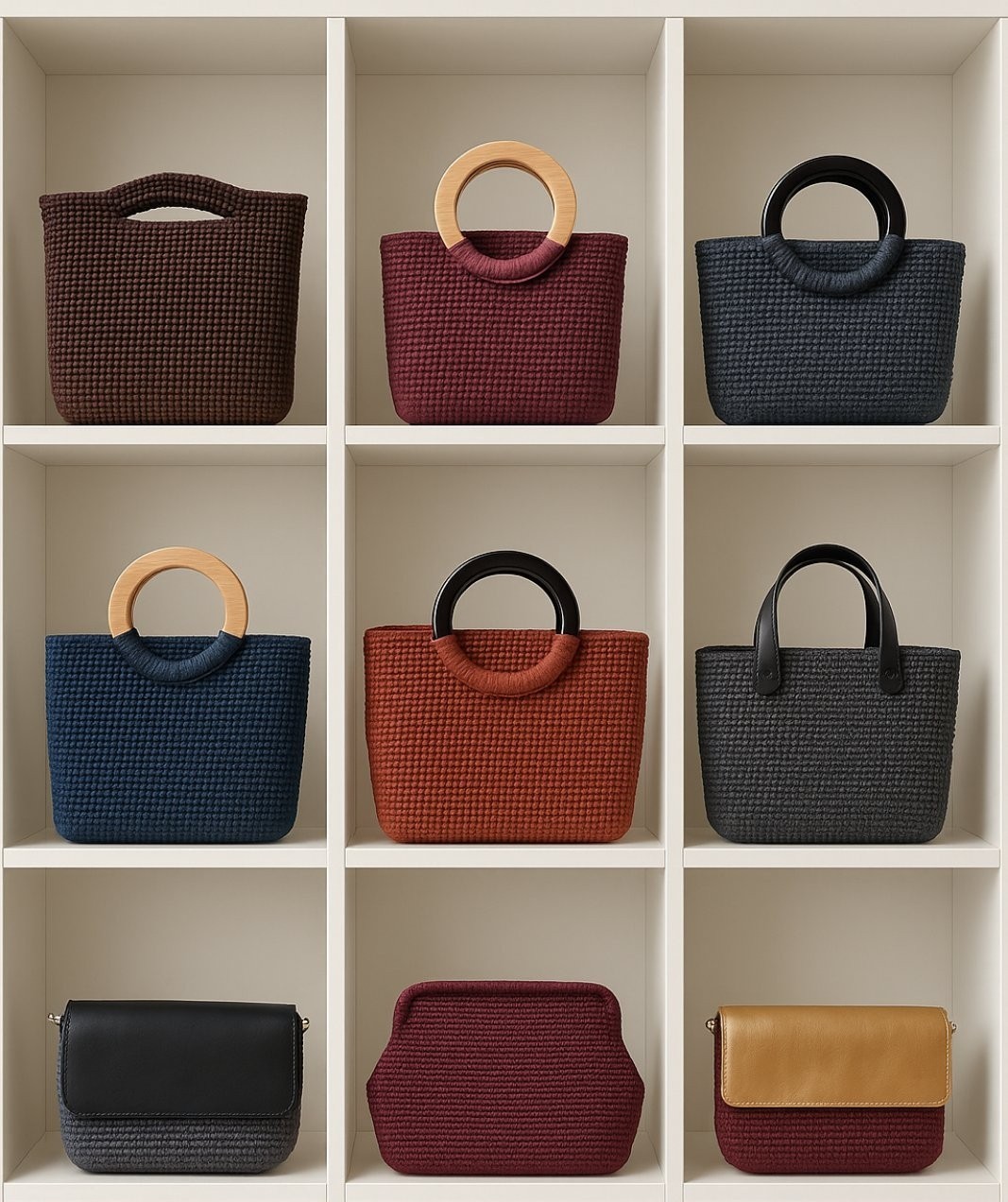 Открийте моята колекция от ръчно изработени макраме чанти от висококачествен полиестер, с дървени дръжки и детайли от естествена кожа. Всяка чанта е оформена внимателно, за да бъде едновременно стилна, функционална и удобна. Clutch – 14 × 16 × 4.5 cm Елегантен мини модел, подходящ за вечерни излизания и специални поводи. Compact – 16 × 18 × 7 cm Малка, но практична чанта за ежедневието и всички необходими дребни вещи. Everyday – 21 × 23 × 11 cm Среден размер, идеален за работа, срещи и разходки из града. Tote – 27 × 31 × 11 cm Голяма и просторна tote чанта, перфектна за работа, пътуване или шопинг. 🌈 Персонализация по ваш вкус Изберете от наличните модели или поръчайте чанта по ваш вкус — цвят, размер и вид дръжки.
