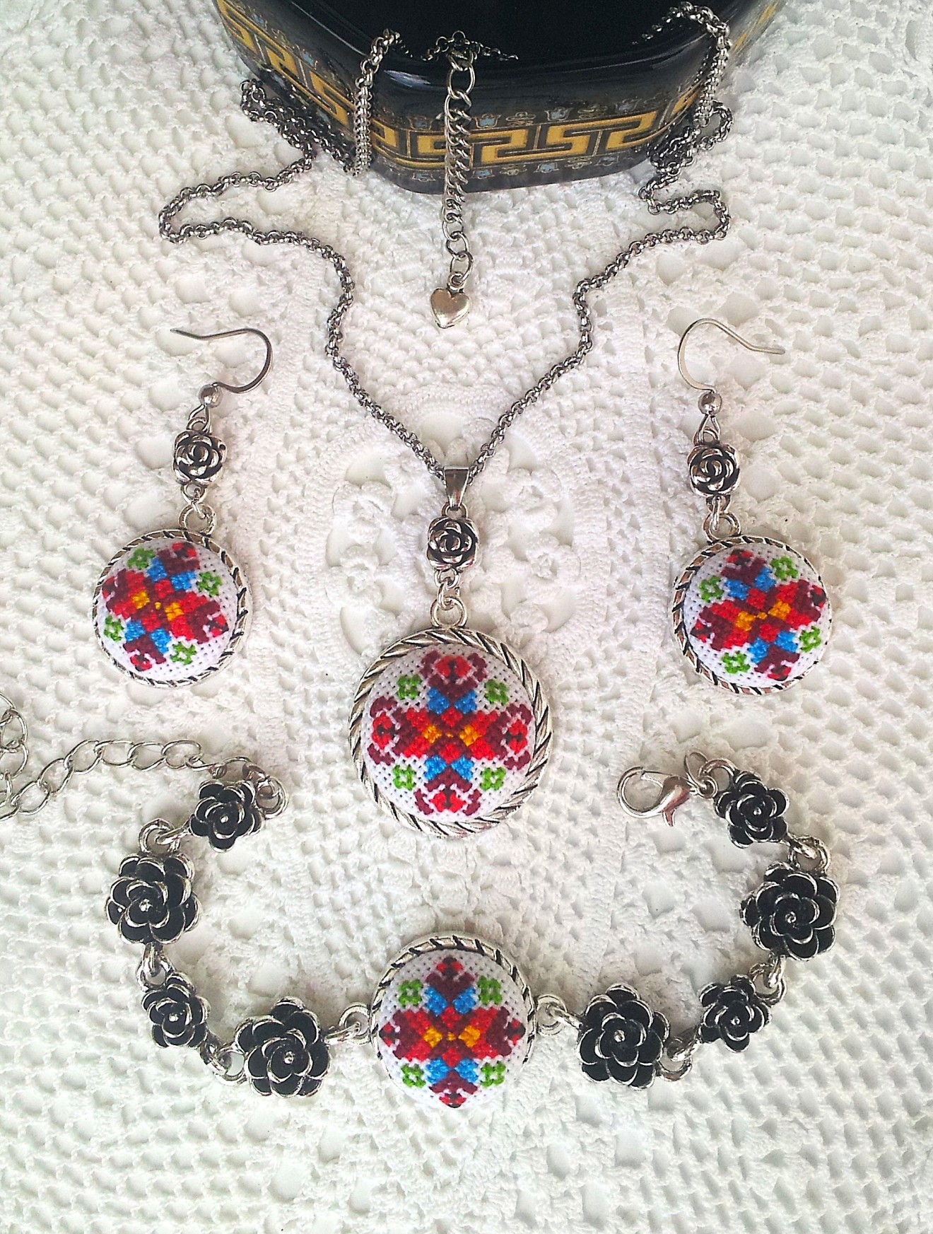 Комплект бижута с ръчно бродирани шевици. Обкова е от висококачествена бижутерска сплав, а верижката и кукичките на обеците са от медицинска стомана.