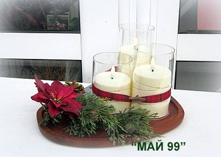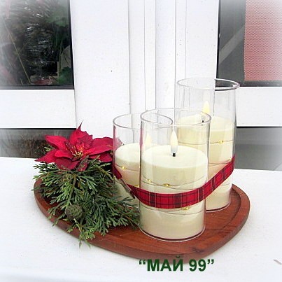 Елегантен коледен подарък / свещник на дървен поднос/издължена форма/ с 3 бр. свещи/батерии с дистанционно управление,,червена коледна звезда и коледна декорация с дължина 30 см.