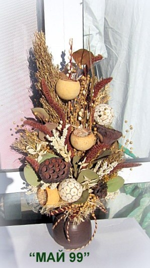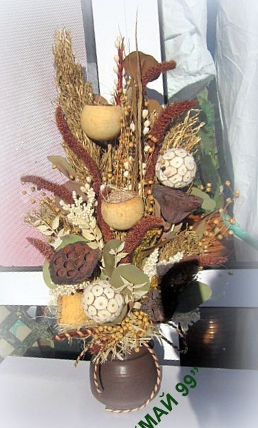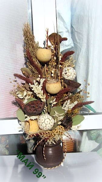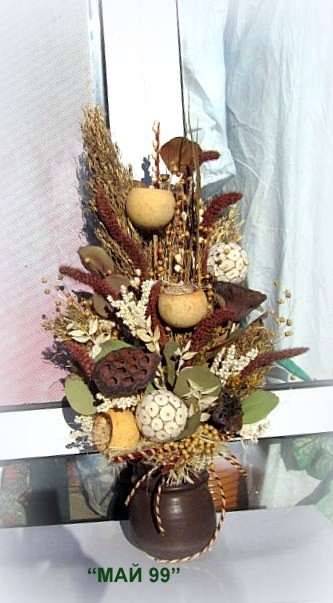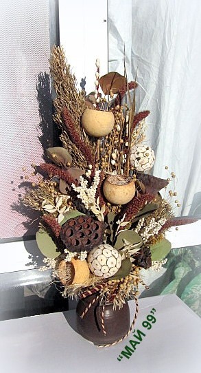 Суха аранжировка в керамичен,кафяв съд от сухи треви и елементи,лотос,бел къп и бели топки- 60 см. Уникална!