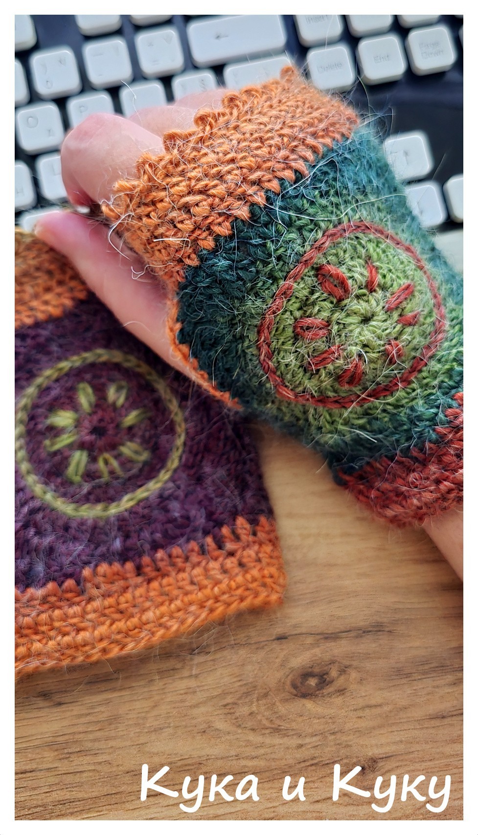 Плетените ръкавички без пръсти: - Ръчна изработка - Прежда в състав 75% акрил и 25% алпака - Поддръжка – ръчно пране с хладка вода Изработени от мен, по дизайн на Crochet Jewels. Цветовете са уникални и неконтролируеми, така че мога да гарантирам единствено, че ще са различни :)