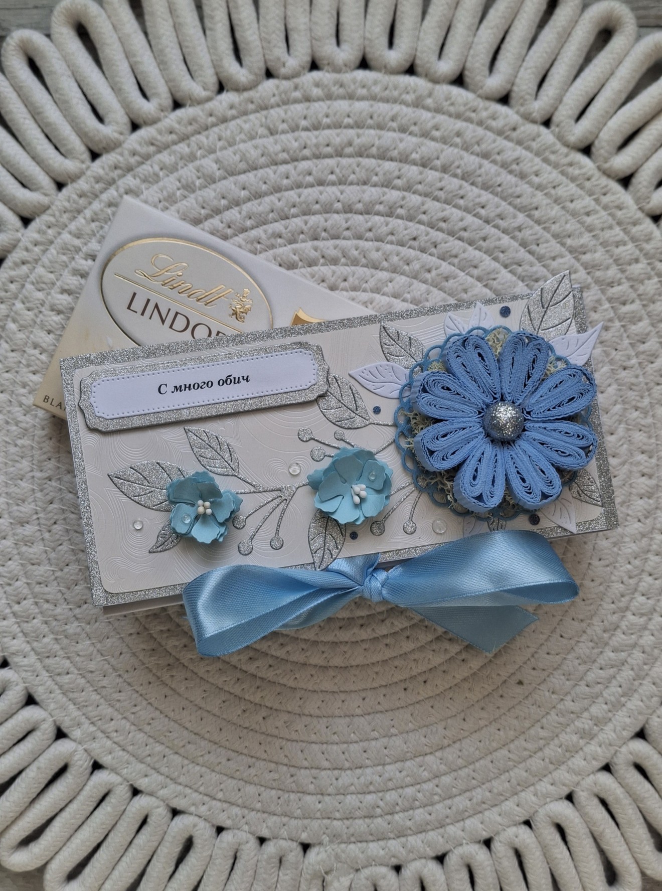 Ръчно изработена квилинг картичка шоколад. За всички, които обичат да подаряват нещо различно и с настроение! Включено пожелание – подходящо за всеки повод: - рожден ден - имен ден -благодарност -или просто така – без повод, за усмивка. Красив, неувяхващ „шоколад“, изработен с внимание и любов. Подходящ за подарък или допълнение към букет/изненада.