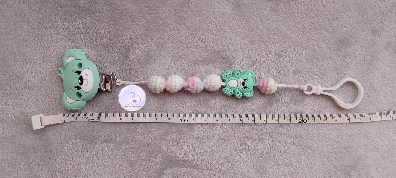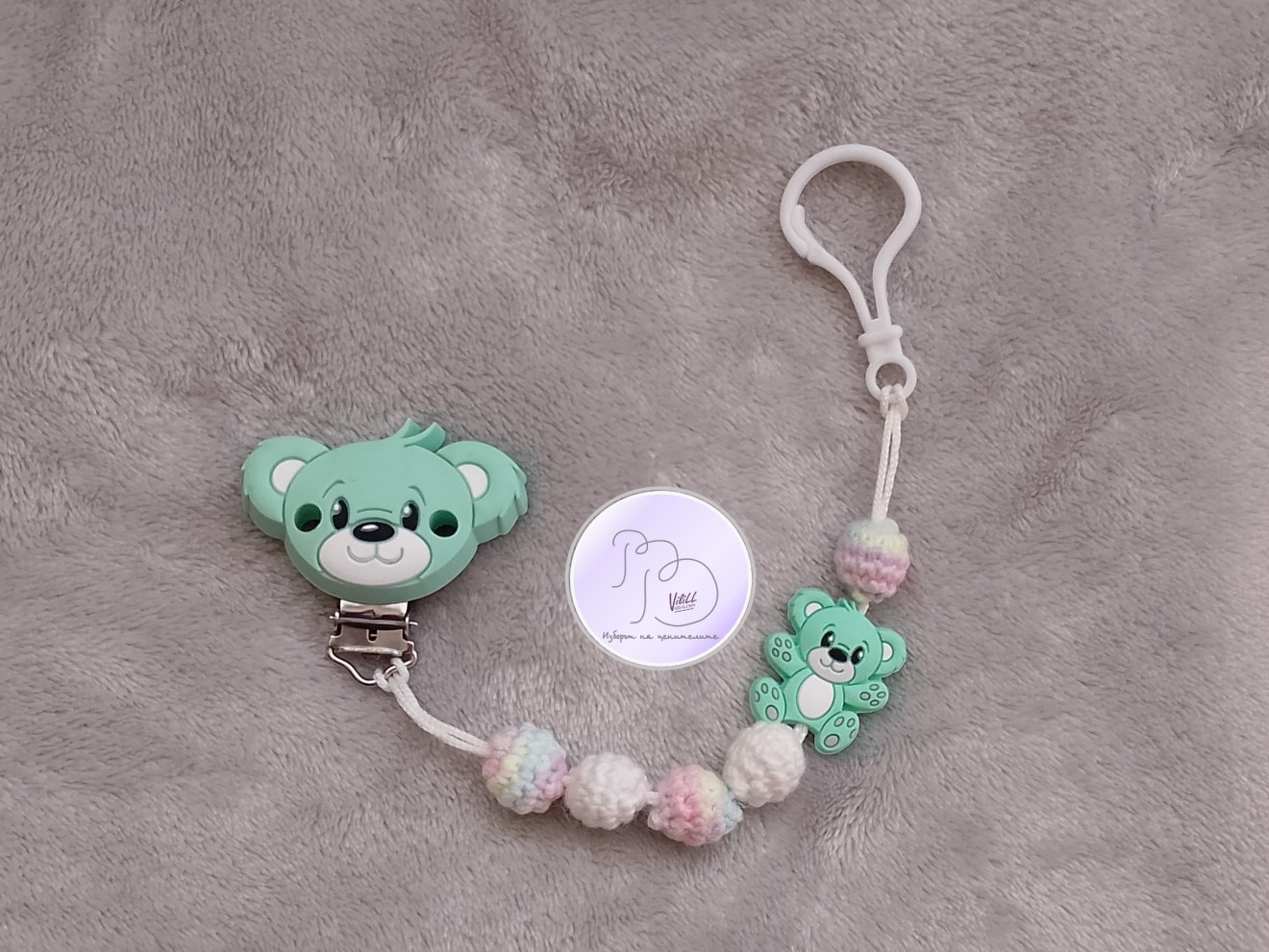 Изберете за малкото съкровище специално ръчно изработена с внимание към детайла щипка/клипс за биберон/залъгалка и гризалка. Аксесоарът във форма на сладурско мече в ментово-зелен цвят, запазва биберона на разположение, без да пада по земята, да се цапа или загуби. Щипката се прикрепя стабилно. Практична и символична идея за подарък на мъниче. Подходяща и за момиченце, и за момченце. Приблизителни размери: - дължина: около 25 см. Материал: 1. прежда: -топченца-смес от акрил и памук. -основа-полиестер. 2.щипка/клипс- метален елемент, силиконов елемент (мече). 3.силиконов пълнеж. 4.силиконово мънисто-мече. 5.пластмасова щипка за захваще на биберон и гризалка. Предлага се само клипс с верижка, БЕЗ биберон и залъгалка. Те се добавят от потребителя и според неговите предпочитания! Цена:20.00лв./10.23 евро/1 клипс. Доставка до офис на Еконт за сметка на получател.