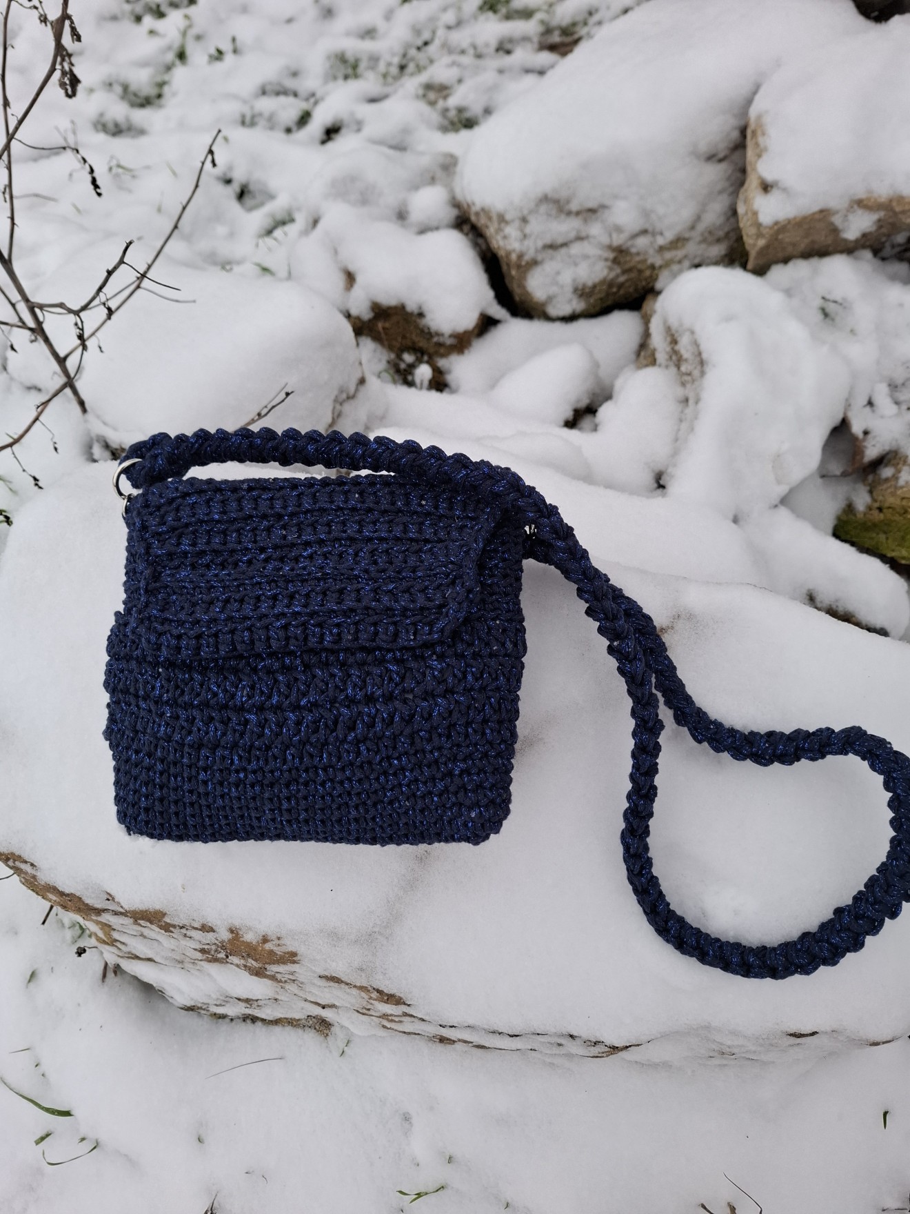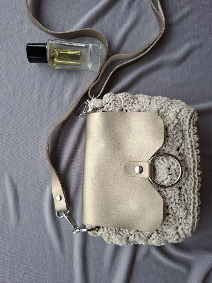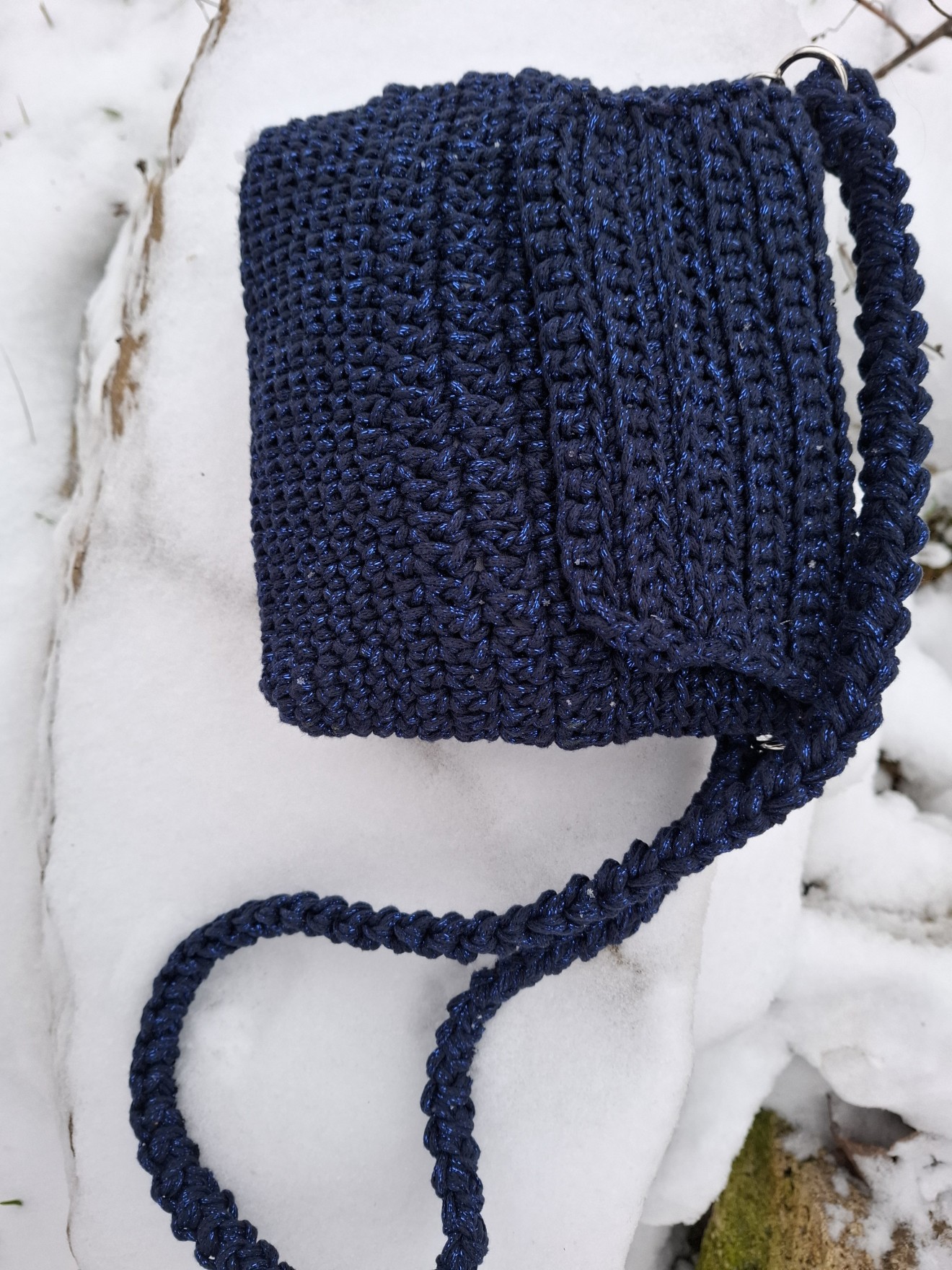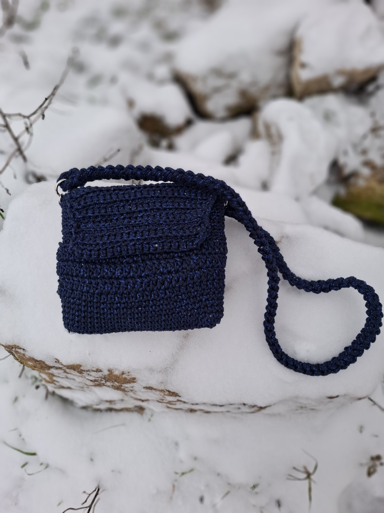 Малка плетена чанта с лъскава нишка. Изплетена от тънко памучно въже с метална нишка. Плетен капак със закопчаване с магнитни копчета. Събира мобилен телефон и други дребни неща, които ежедневно взимаме с нас. Има си подплата. Приблизителни размери: Височина: 19 см. Ширина: 21 см. Всички чанти пристигат опаковани в кутия с панделка. Възможност за добавяне на лично пожелание, когато е за подарък. И разбира се, с инструкции за пране и почистване. Напишете съобщение, ако сте я познали за себе си или за подарък. Поздрави, Пълноцветни дарове