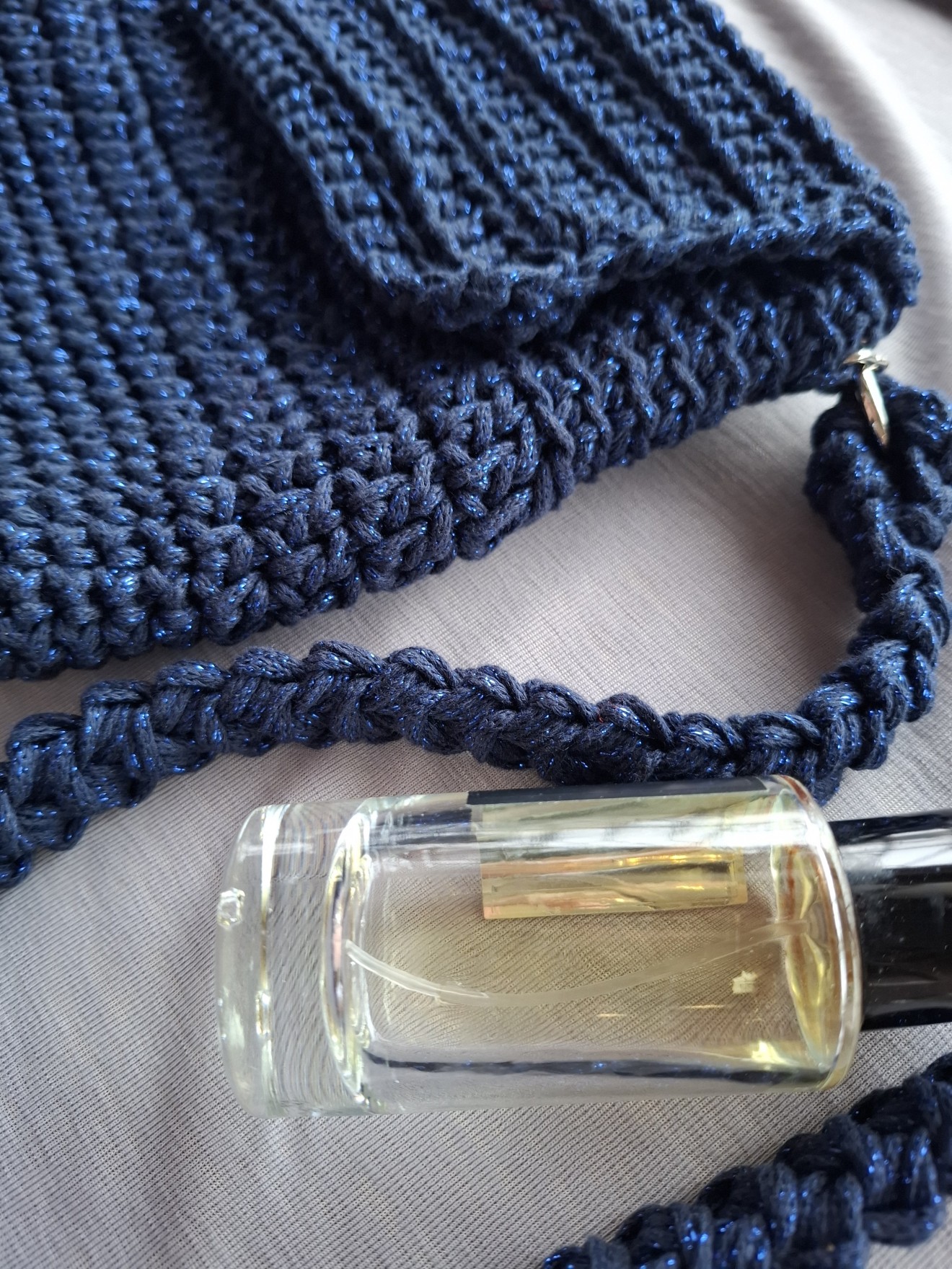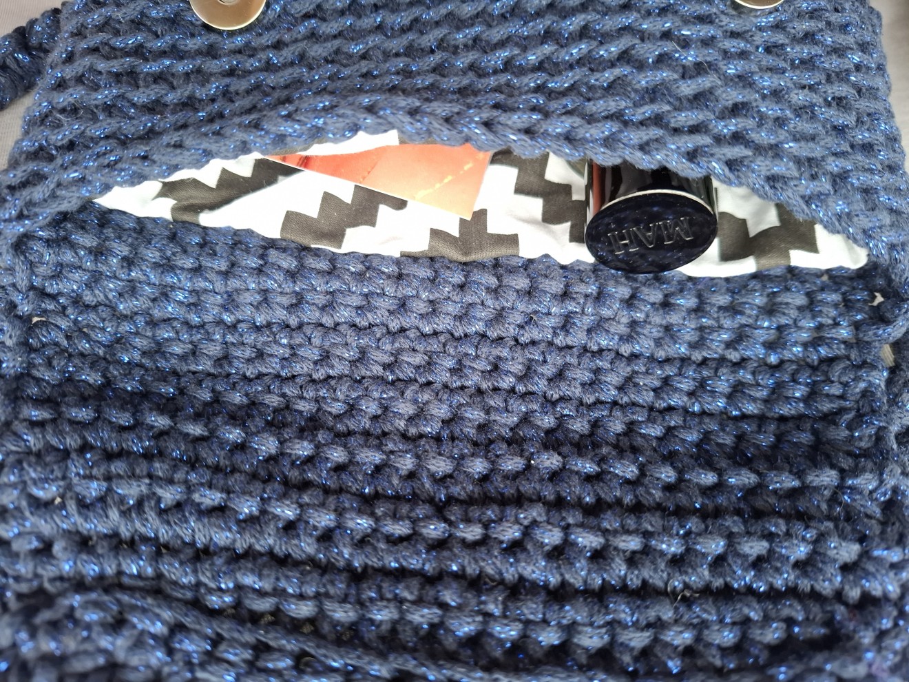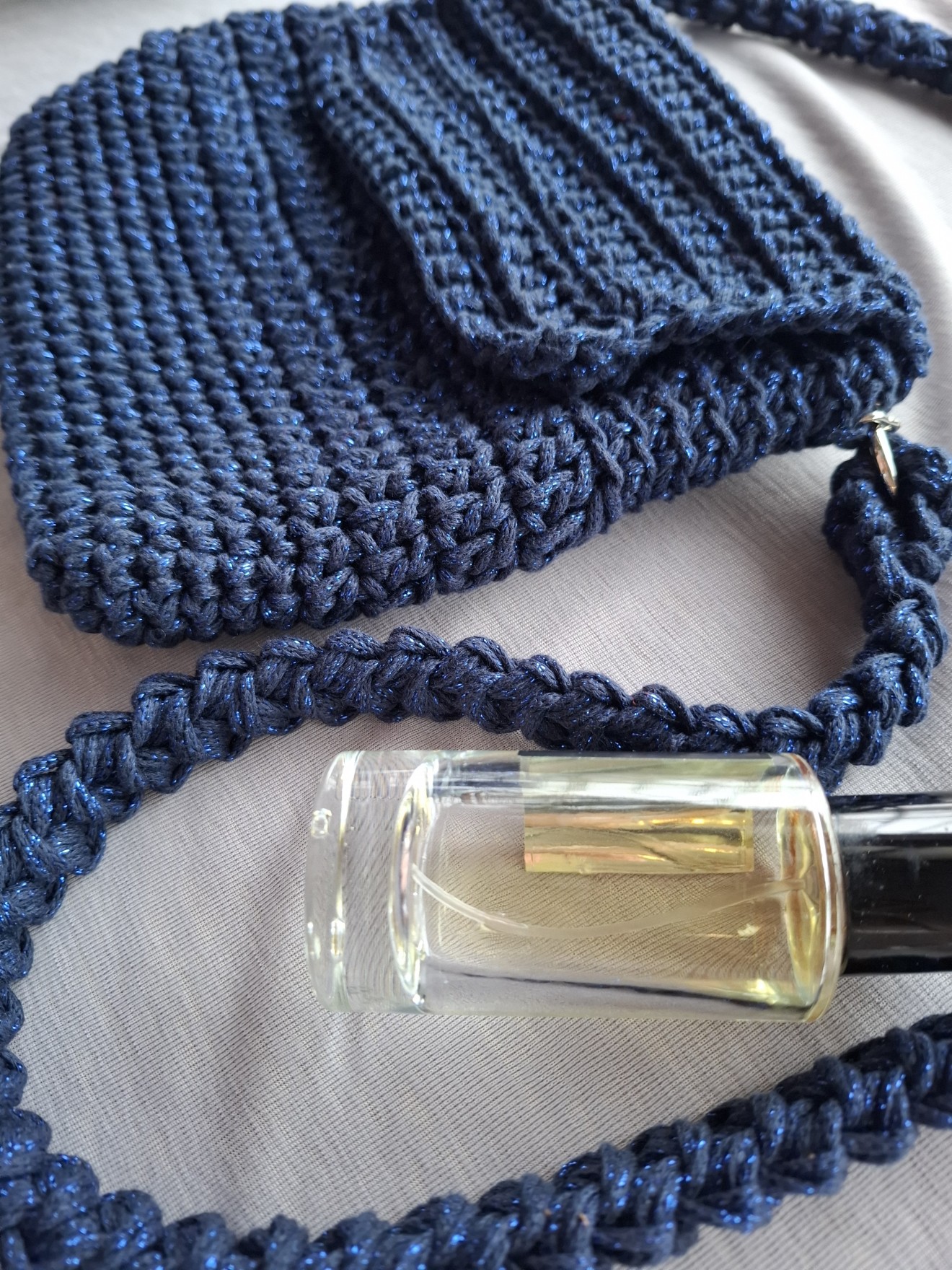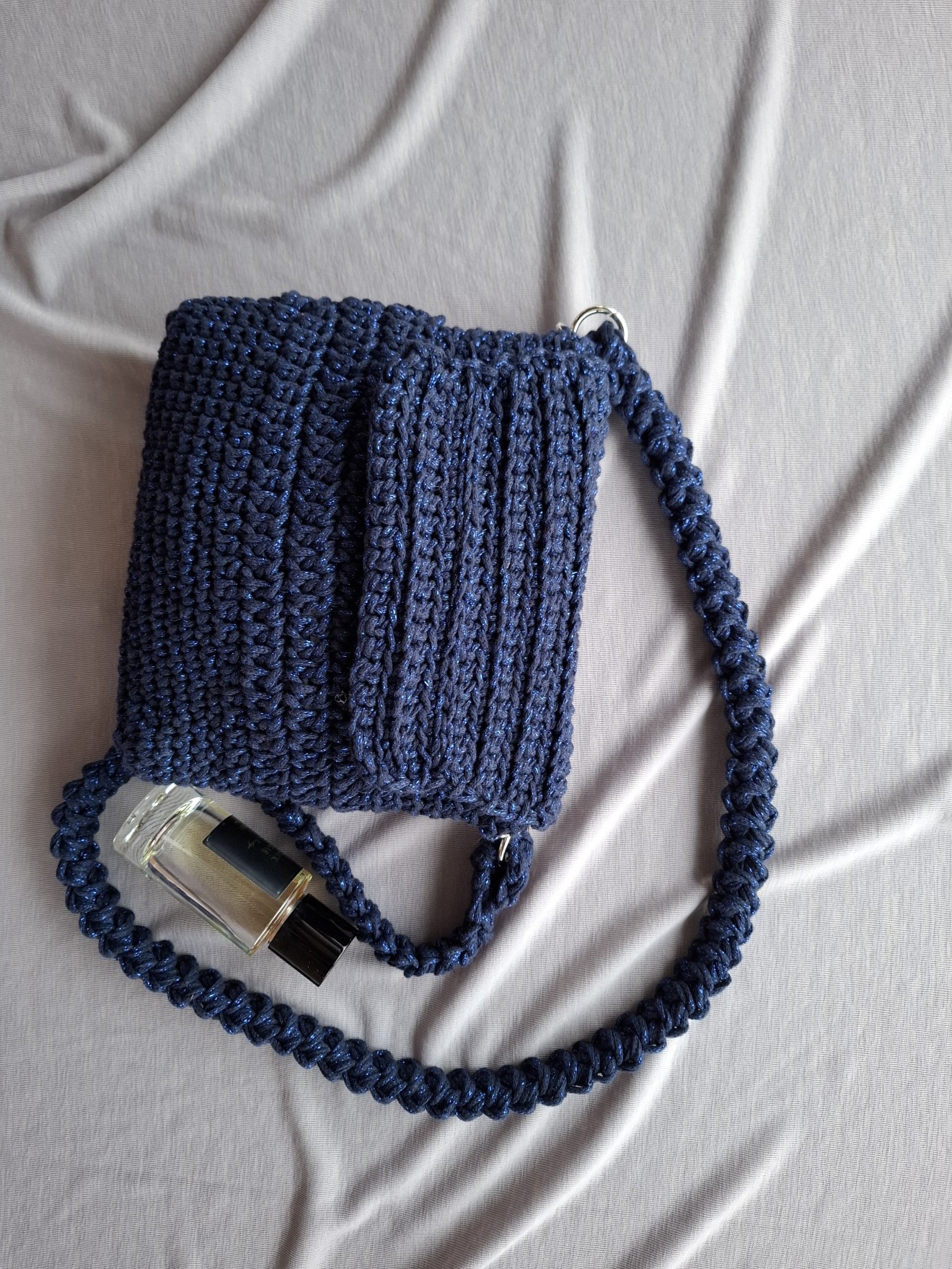 Малка плетена чанта с лъскава нишка. Изплетена от тънко памучно въже с метална нишка. Плетен капак със закопчаване с магнитни копчета. Събира мобилен телефон и други дребни неща, които ежедневно взимаме с нас. Има си подплата. Приблизителни размери: Височина: 19 см. Ширина: 21 см. Всички чанти пристигат опаковани в кутия с панделка. Възможност за добавяне на лично пожелание, когато е за подарък. И разбира се, с инструкции за пране и почистване. Напишете съобщение, ако сте я познали за себе си или за подарък. Поздрави, Пълноцветни дарове