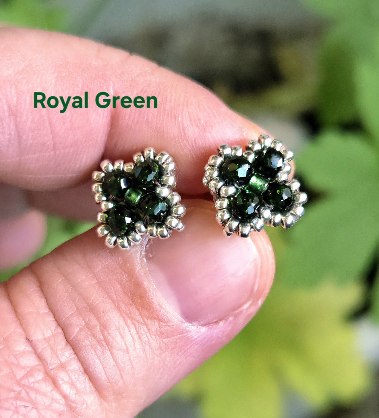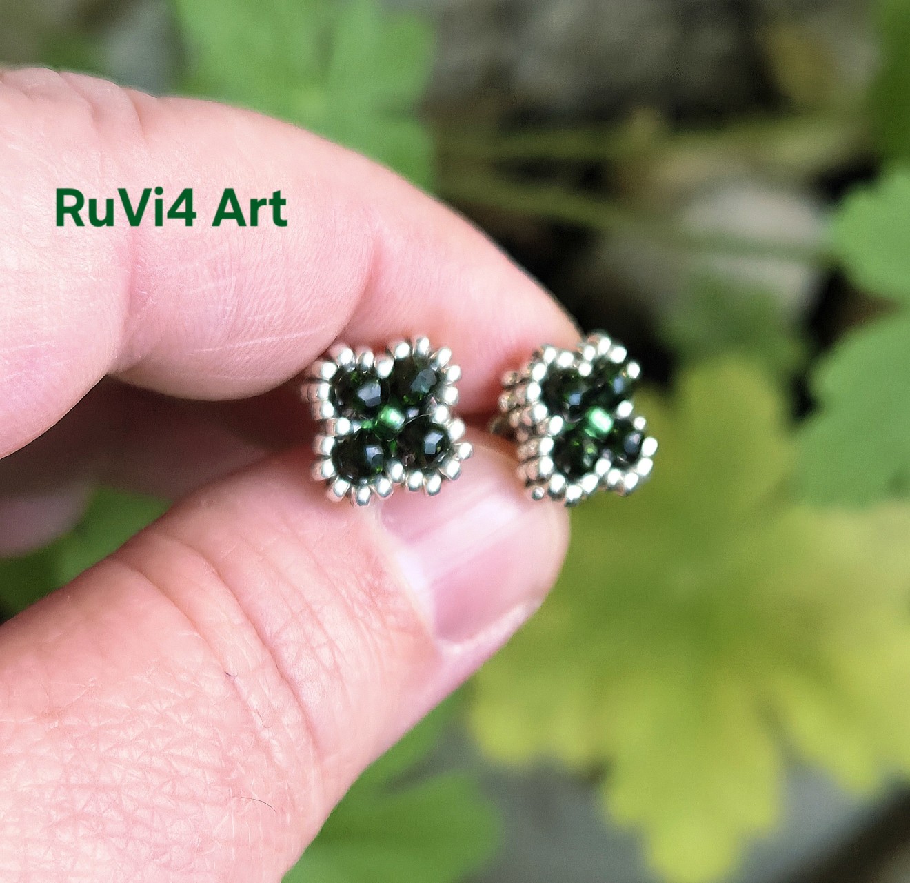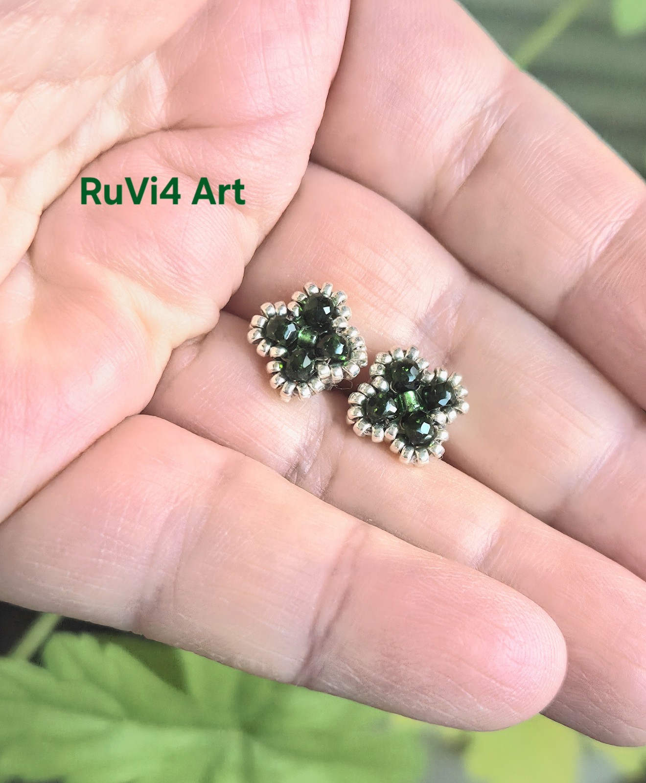 Обеци, изработени от мъниста Miyuki, зелен слънчев камък и стоманени пинчета.