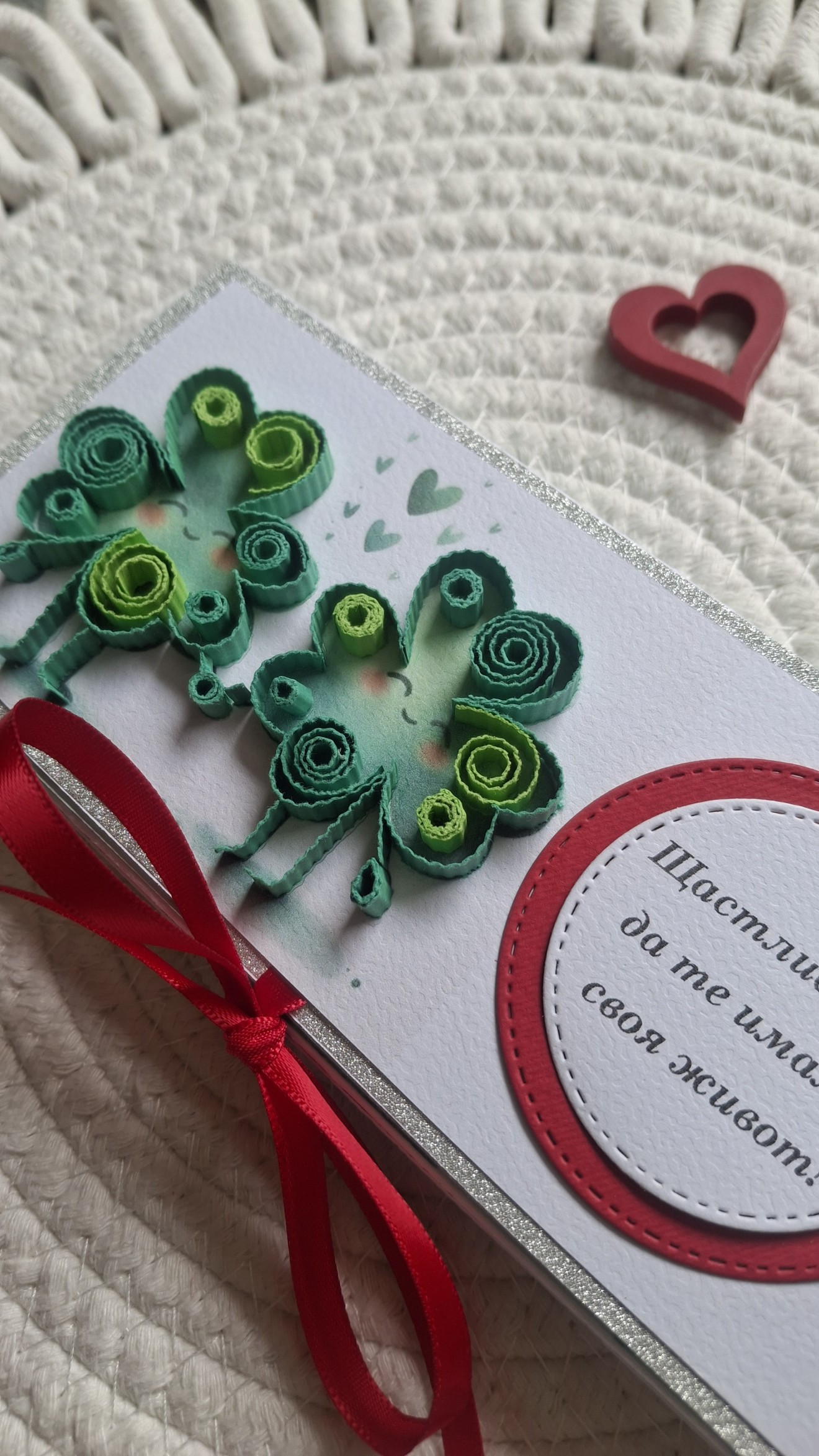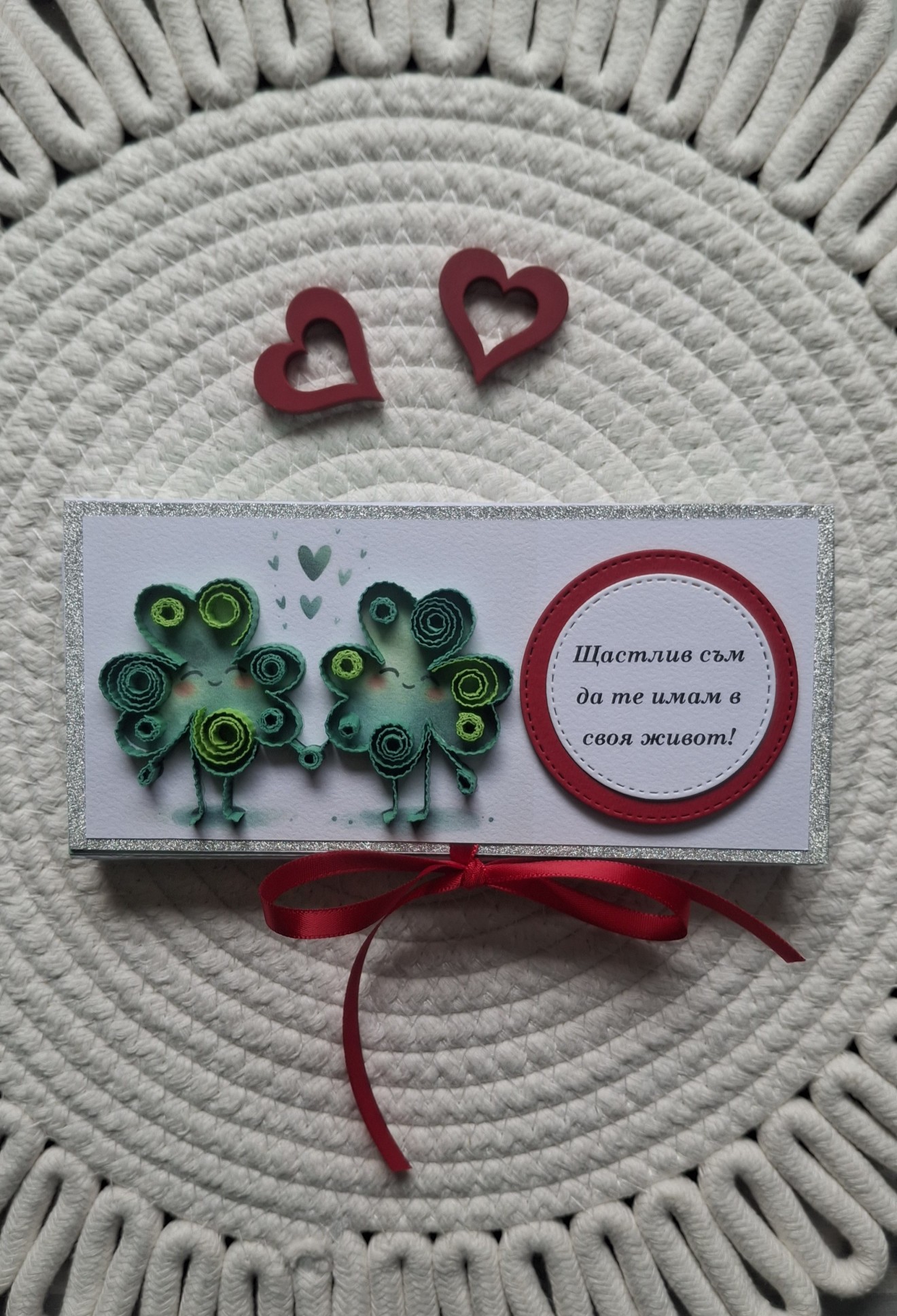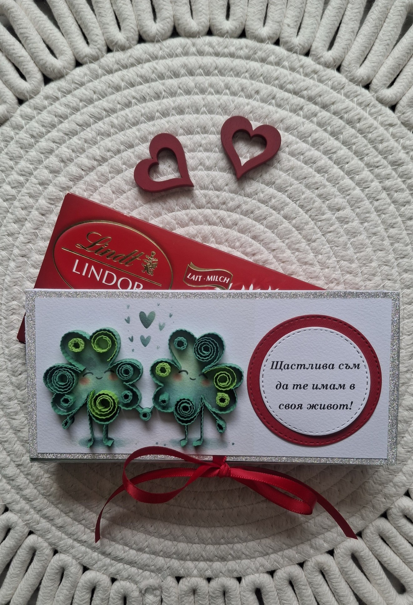 Квилинг картичка за Свети Валентин с шоколадово настроение – сладка, романтична и точно на място, когато думите трябва да са малко, но с вкус. Подходяща за половинката, за таен обожател или за човек, който вярва, че любовта и шоколадът винаги вървят ръка за ръка. 🖐️ Ръчна изработка 💌 Стилен дизайн ✍️ Възможност за персонализация Защото има чувства, които най-добре се поднасят… с шоколад.