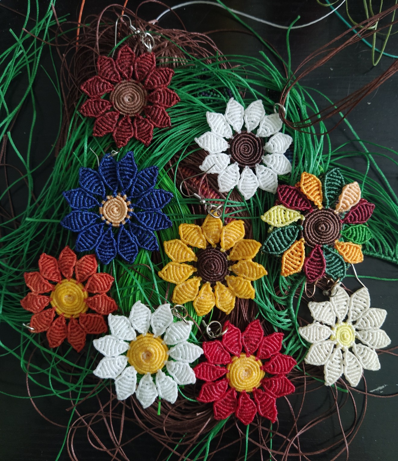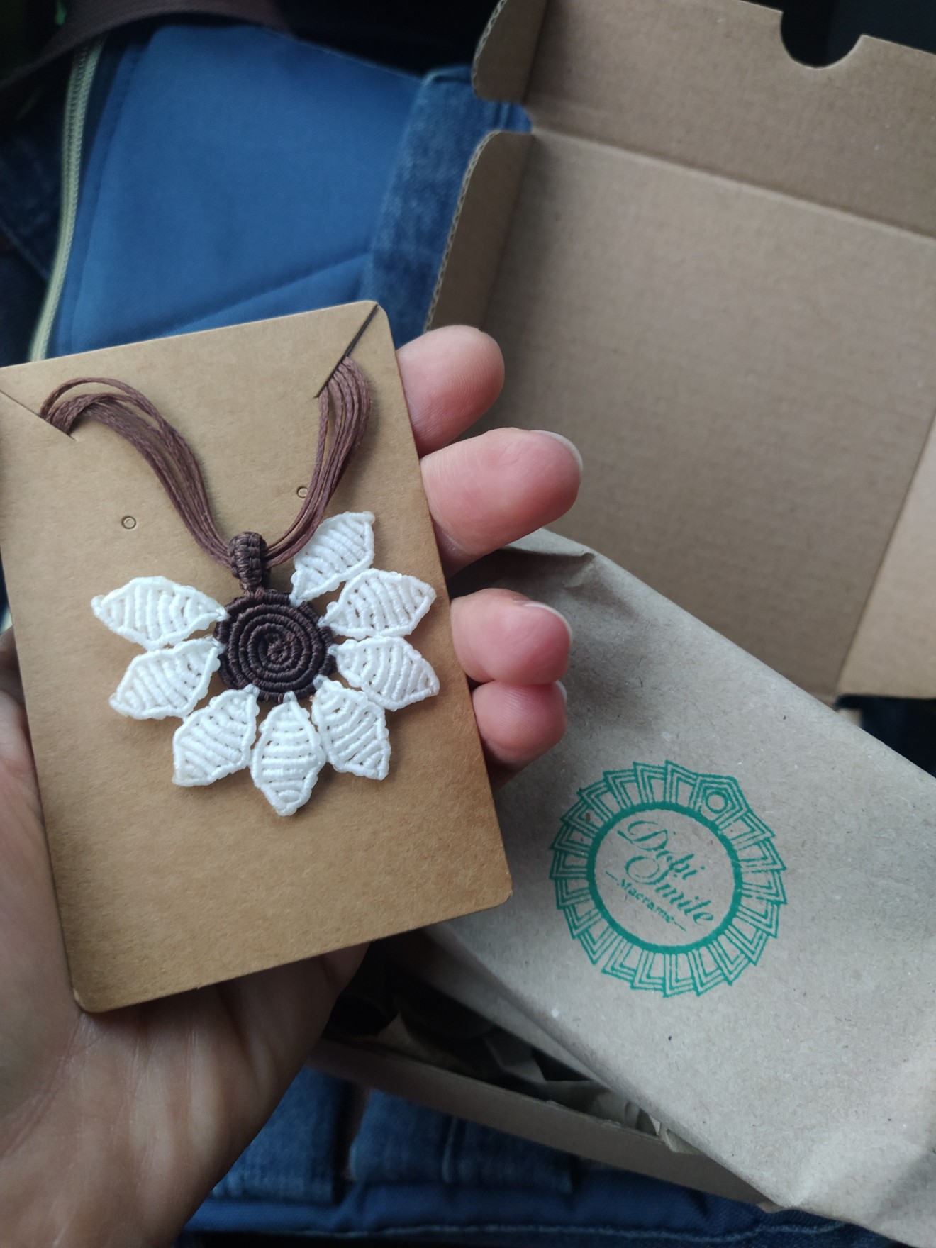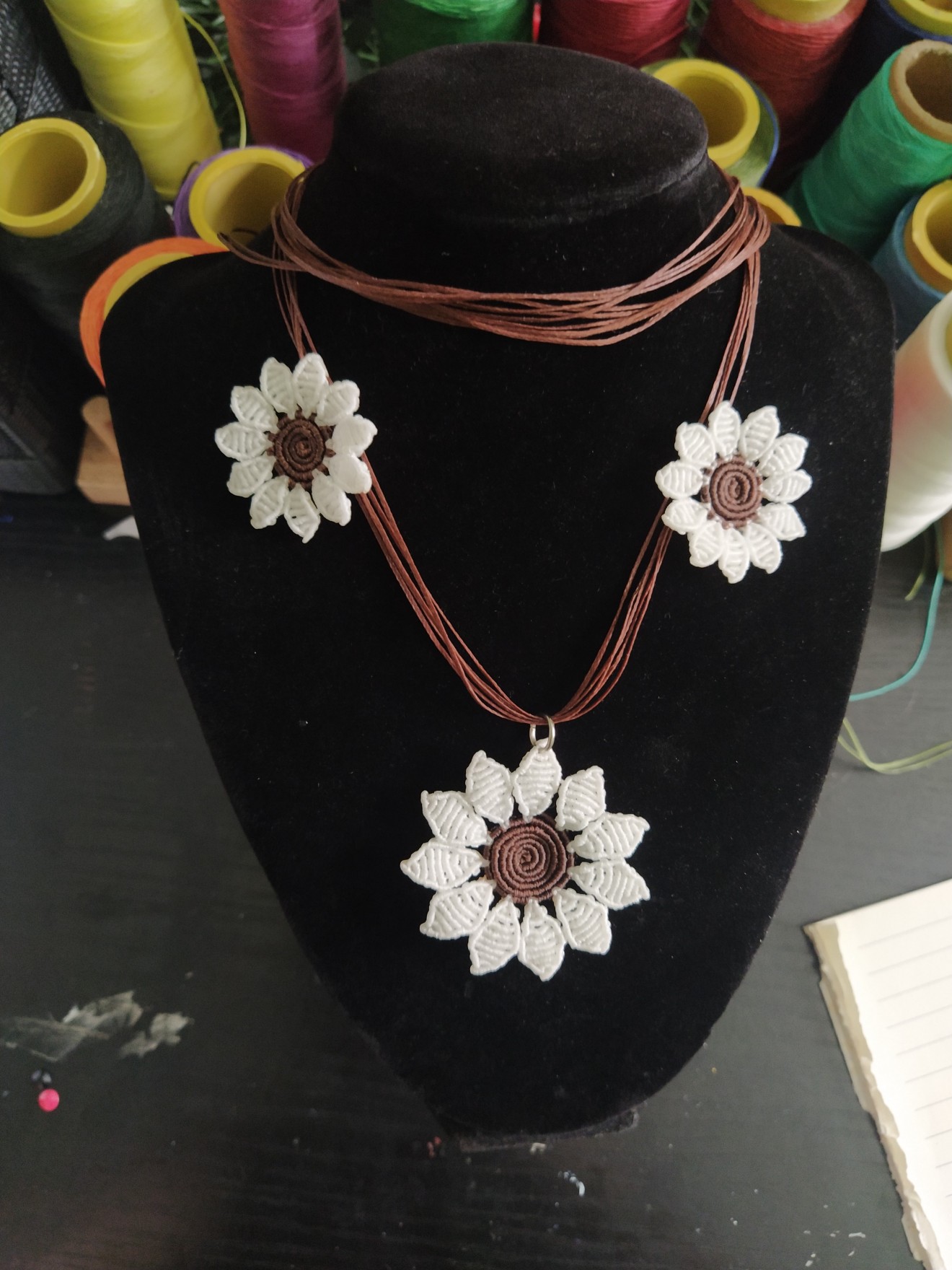 Комплектът съдържа макраме колие цвете и чифт обеци цветя. Цветята предвидени за обеци са по-малки. Колието може да е с цяло цвете или с такова с липсващи листена. (виж снимките). Аксесоарите са изработени изцяло на ръка с восъчни конци и вид плетене чрез възли - техника макраме. Артикула идва опакован и готов за подарък. Може да се изработи в желани от Вас цветове. За повече информация или индивидуални поръчки, моля, не се колебайте да се свържете с мен.