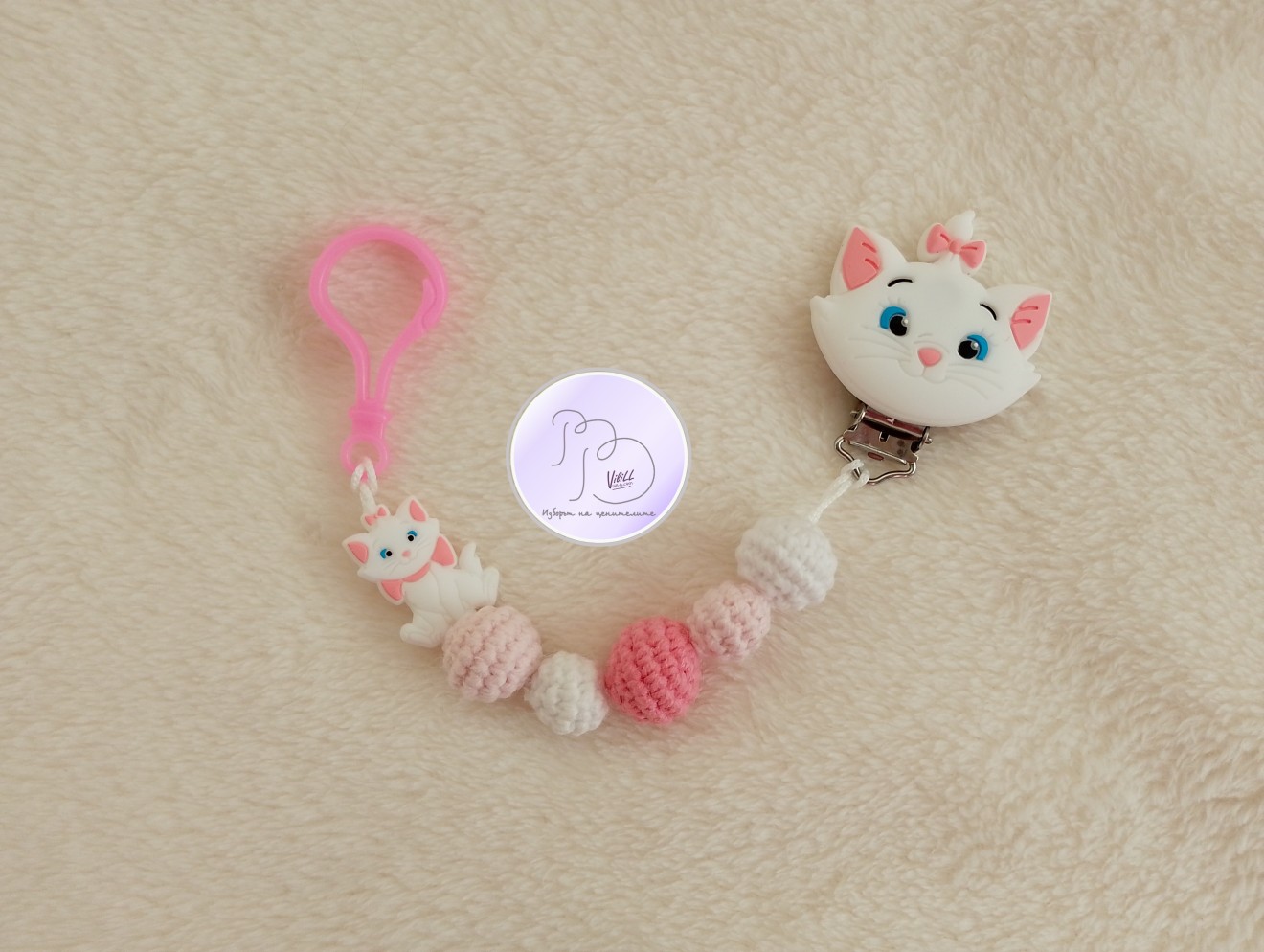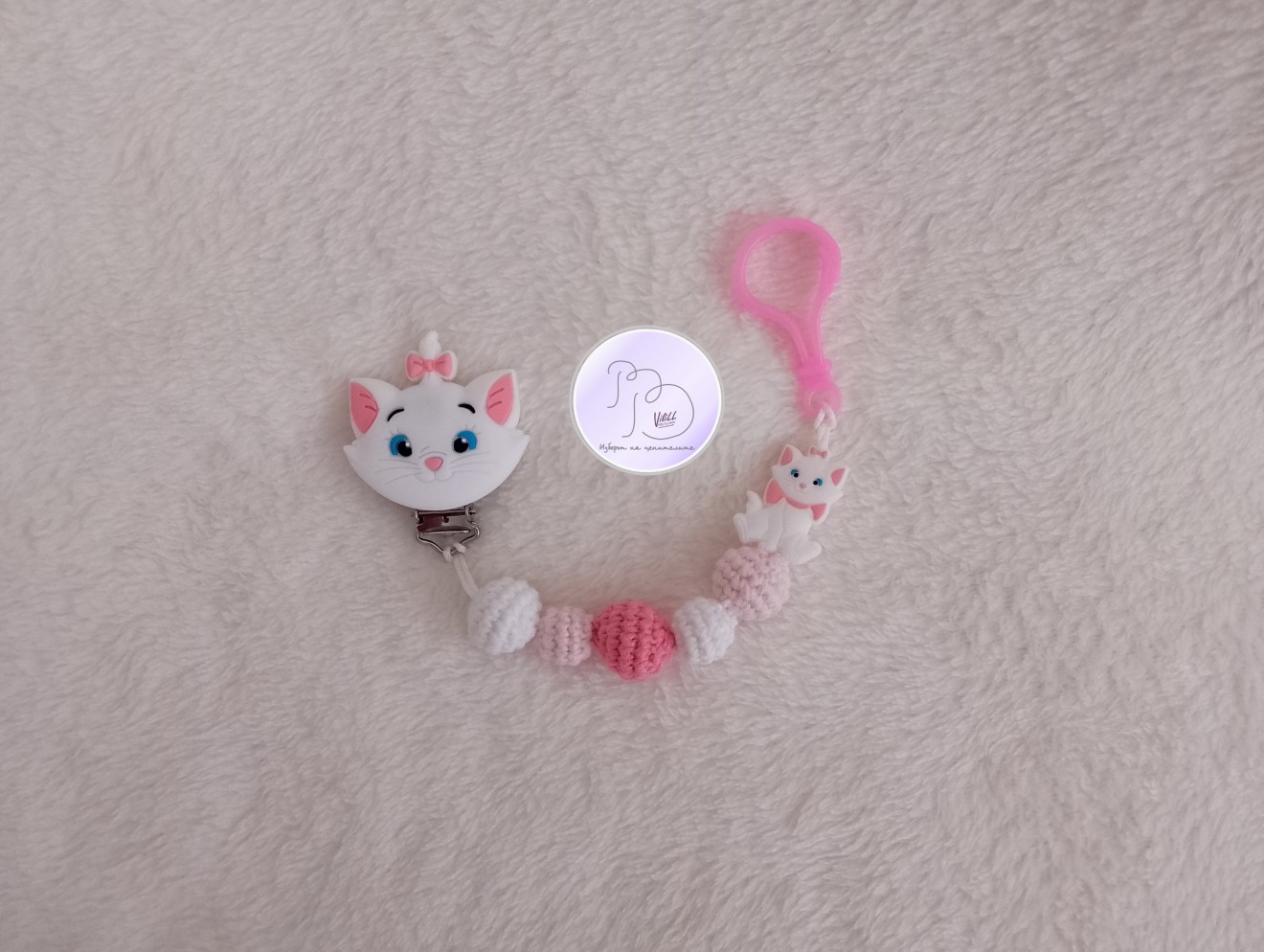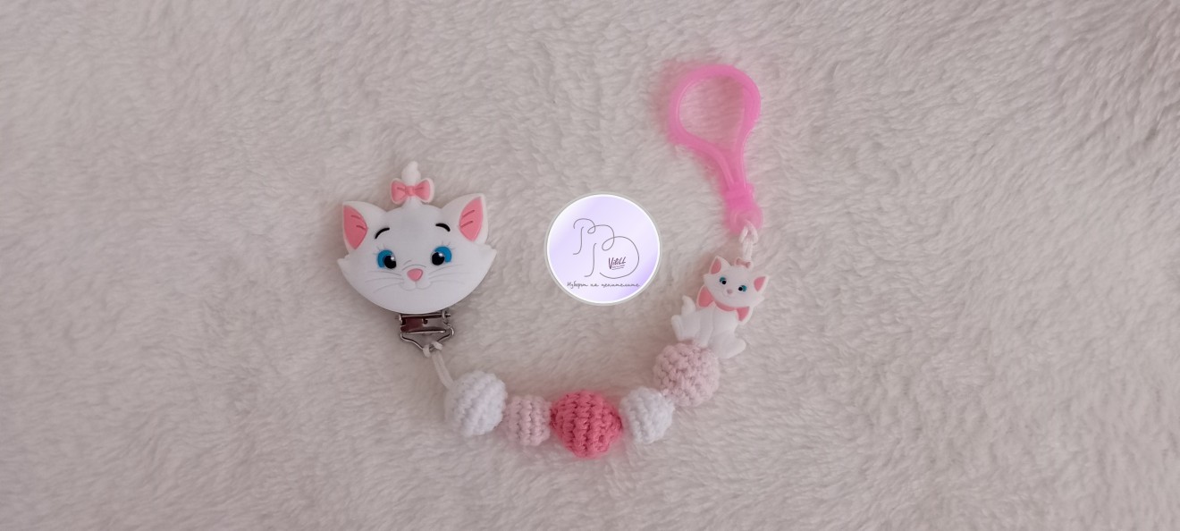 Елегантна щипка/клипс за залъгалка и гризалка с анимационен герой- котето Мари от "Аристокотки", запазва биберона на разположение, без да пада по земята, да се цапа или загуби. Нежна като Мари една малка дама от най-ранна възраст ще бъде ценител на ръчната изработка.Щипката се прикрепя стабилно.Практична и символична идея за подарък на новородено, за погача или друг повод. Приблизителни размери: - обща дължина: около 24 см. Материал: 1. прежда: -топченца-смес от акрил и памук. -основа-полиестер. 2.щипка/клипс- метален елемент, силиконов елемент (Мари). 3.силиконов пълнеж. 4.силиконово мънисто във формата на Мари. 5.пластмасова щипка за захваще на биберон и/или гризалка. Предлага се само представения в снимките клипс с верижка, БЕЗ биберон и залъгалка. Те се добавят от потребителя и според неговите предпочитания! 📌Цена:10.23 евро/20.00лв./1 клипс. Доставка до офис на Еконт за сметка на получател.