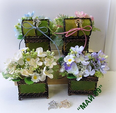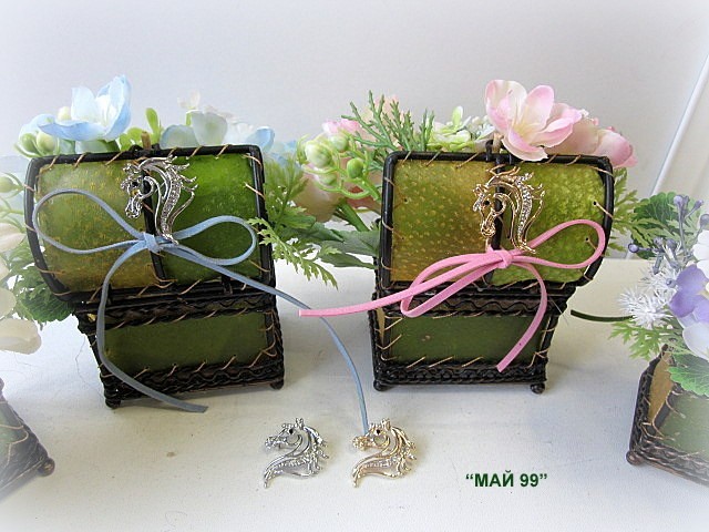 Метално ковчеже общито с 2 нюанса зелена кожа 7/13 см. с изкуствени,нежни малки цветчета + подарък брошка/глава на кон 2/3 см.сребро и злато/ и панделка. Чудесен подарък за 8-ми март