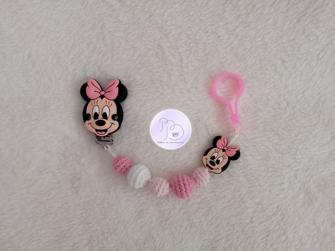Елегантна щипка/клипс за залъгалка и гризалка с анимационен герой-Мини Маус, запазва биберона на разположение, без да пада по земята, да се цапа или загуби. Практична и символична идея за подарък на малка госпожица, ценител на ръчната изработка. Щипката се прикрепя стабилно.Практична и символична идея за подарък на новородено, за погача или друг повод. Приблизителни размери: - обща дължина: около 24 см. Материал: 1. прежда: -топченца-смес от акрил и памук. -основа-полиестер. 2.щипка/клипс- метален елемент, силиконов елемент (Мари). 3.силиконов пълнеж. 4.силиконово мънисто във формата на Мини Маус. 5.пластмасова щипка за захващане на биберон и/или гризалка. Предлага се само представения в снимките клипс с верижка, БЕЗ биберон и залъгалка. Те се добавят от потребителя и според неговите предпочитания! Цена: 10.23 евро/20.00лв./1 клипс. Доставка до офис на Еконт за сметка на получател.