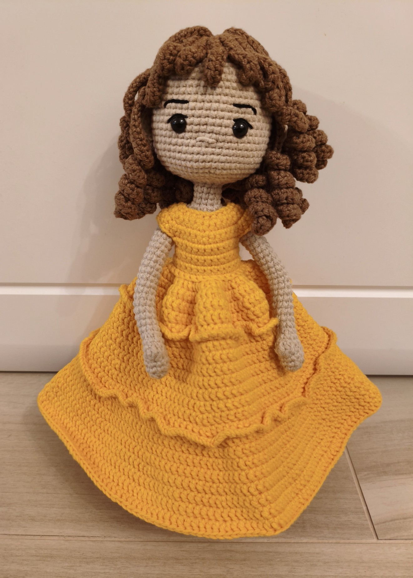 Представям Ви кукла Бела - изплетена на една кука, с дълги кестеняви къдрици и обемна принцеска рокля в ярко жълто - готова за всички тържества, на които ще я води детето Ви. Изработена е от памучно-акрилна прежда, с очи на винт, с гранулиран силиконов пълнеж. В ръцете има телена обезопасена телена конструкция, която й позволява да държи позиция. Роклята се сваля, като на гърба има копчета.