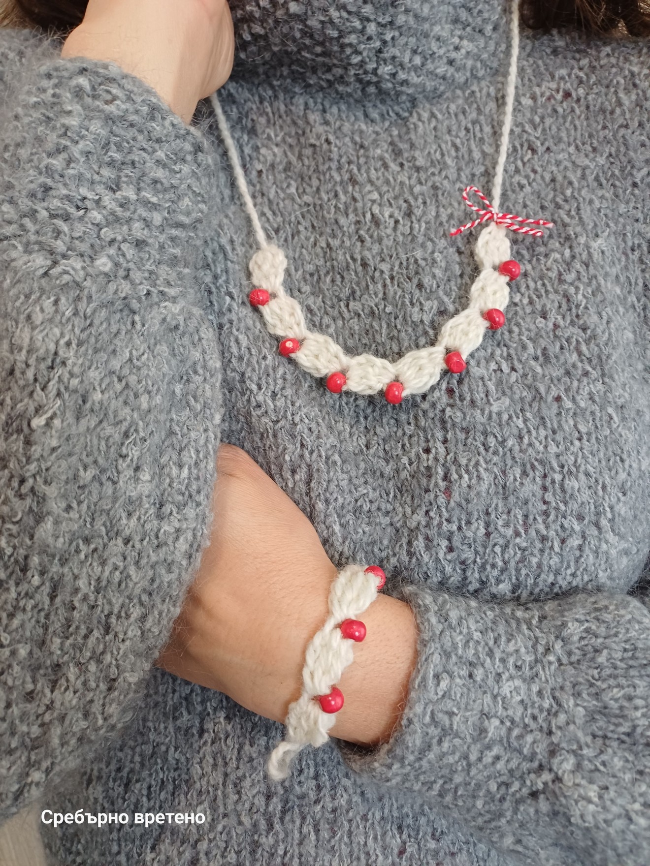 Бяло, червено, вълна и мъниста. Тихи мартенички, които оставят следа в сърцето, не в природата. 🌿 Едно и също усещане, нов прочит. Гривната е модел от миналата година. Носен, обичан, върнат като идея. Тази година продължих нишката. Така се роди колието: същият ритъм, същите материали, ново място върху тялото. Мека бяла вълна и червени дървени топчета. Ширина 1,5 см. Регулиращи се. Двете заедно оформят комплект. Подходящи са и за подарък. Поднасят се в кутийка. Работя в ограничени количества. Нашите мартеници са грижливо опаковани с авторски етикет и кратко описание на първомартенски обичай. Доставка 1-2 работни дни с преглед преди плащане. Последвайте Сребърно вретено във Facebook, за да научавате за намаления и нови изделия.Разгледайте албума с мартенички. Налични са дизайнерски и нискобюджетни модели за всеки пол, възраст и повод. С поздрав, Стаси и помощници – семейството