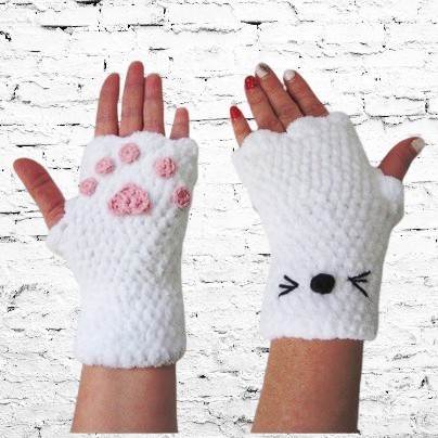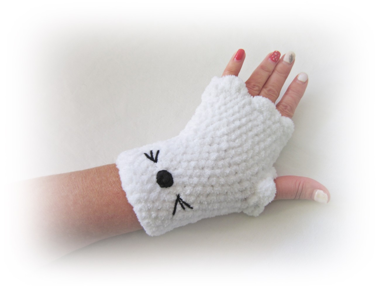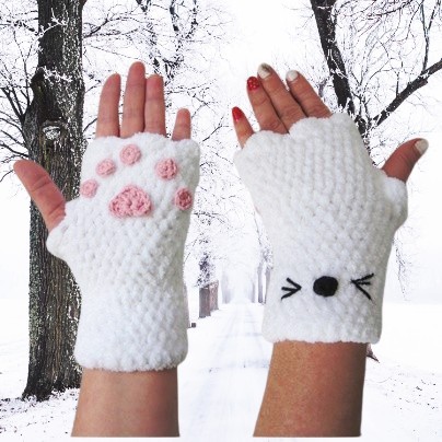 Сладки и уютни ръкавици без пръсти в бял цвят с котешки мотив – лапичка от едната страна и закачливо котешко лице от другата. Меки, топли и удобни, те осигуряват свобода на пръстите, докато пазят ръцете от студа. Подходящи за ежедневието, подарък за любителите на котки или като акцент към зимната визия.