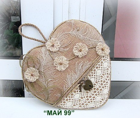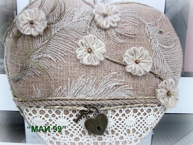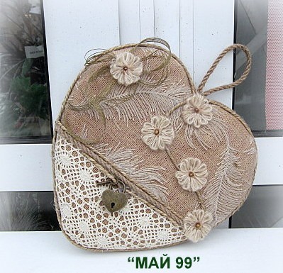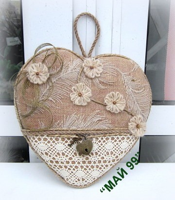 Голямо,обемно сърце в стил винтидж - обвито със зебло и дантела,въже и пресукан шнур,цветя от вълна/прежда/ и метално катинарче 26/26 см. Чудесен подарък за св.Валентин и влюбени!
