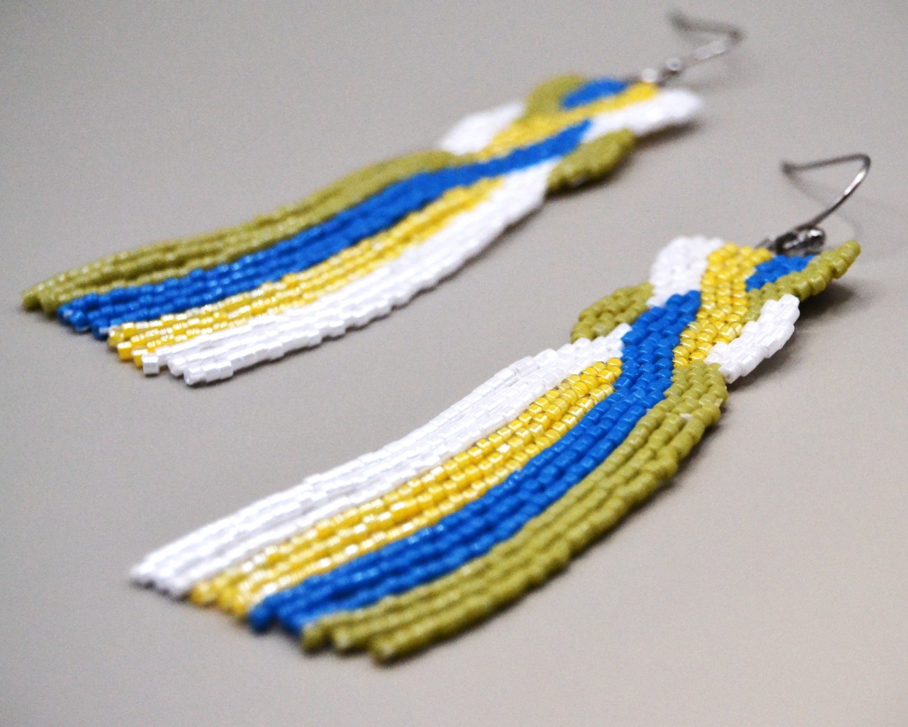 Висящи обеци, изработени от японски стъклени мъниста и медицинска стомана. Леки и много удобни за носене.