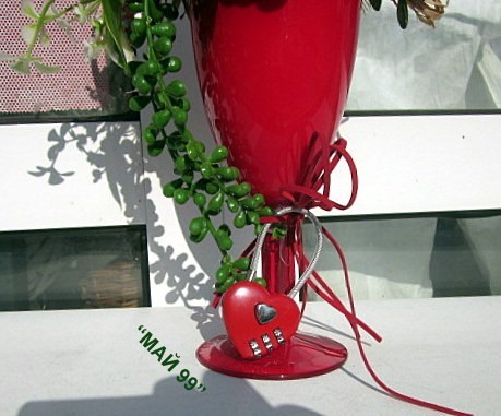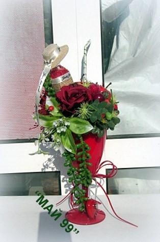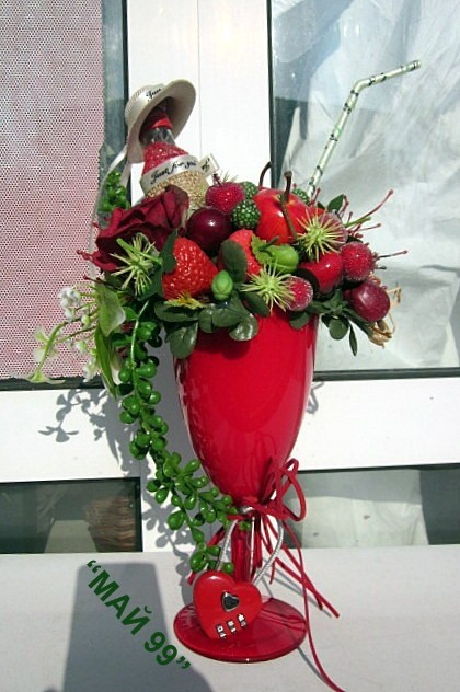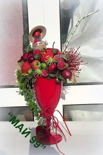 Романтичен подарък в червена чаша на столче +облечена мини бутилка с капела+изкуствени плодове и захаросани,червени рози,зеленина и катинарче с код във формата на сърце с височина 30 см. Пищен и елегантен,закачлив подарък за влюбени!