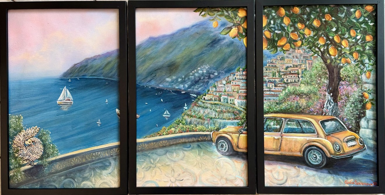 Amalfi coast’, acryl on 3 canvases * 25/40cm, tryptich; framed: 82/42 cm