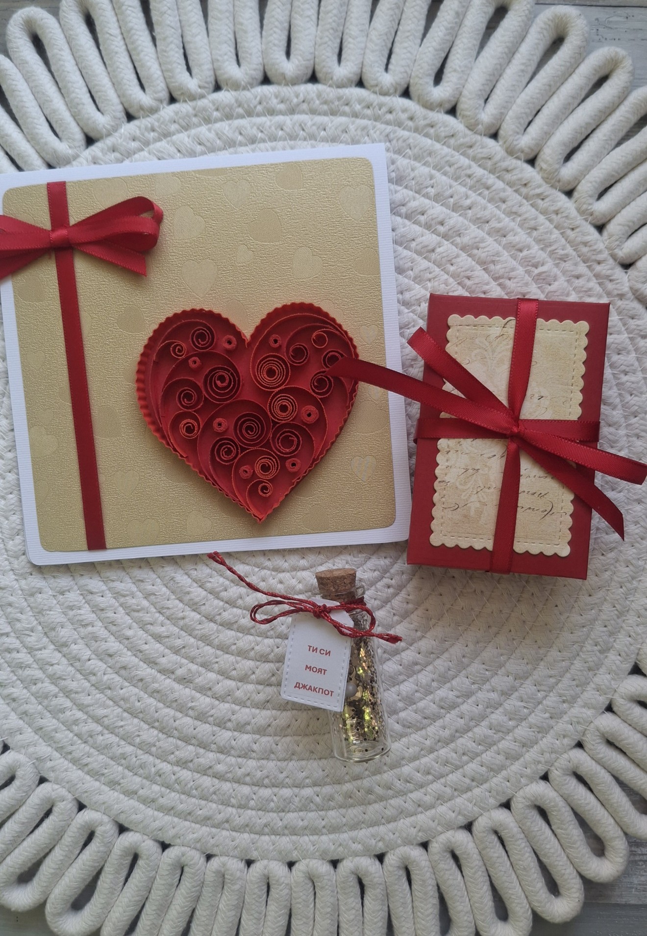 Подаръчен комплект за Свети Валентин, който съчетава нежна квилинг картичкаи малко шишенце с висулка и послание вътре - онези дребни неща, които казват „обичам те“ без много думи. Подходящ подарък за любим човек - романтичен, мил и различен. Възможност за избор на послание и персонализация според повода и човека, за когото е. Ако търсите нещо лично и направено с душа за Свети Валентин - това е един от любимите ми варианти. 💌