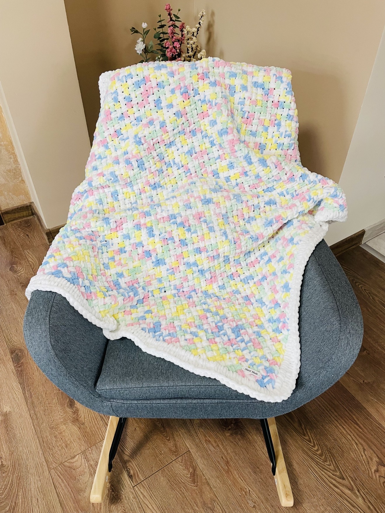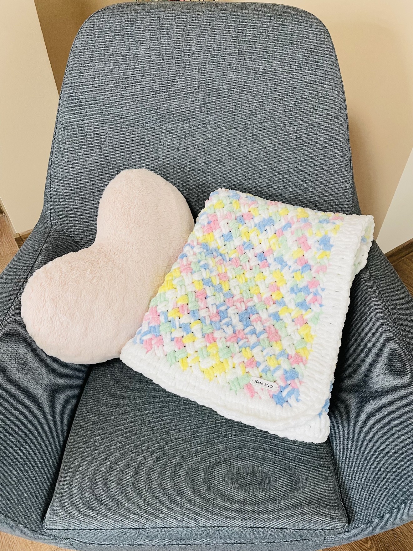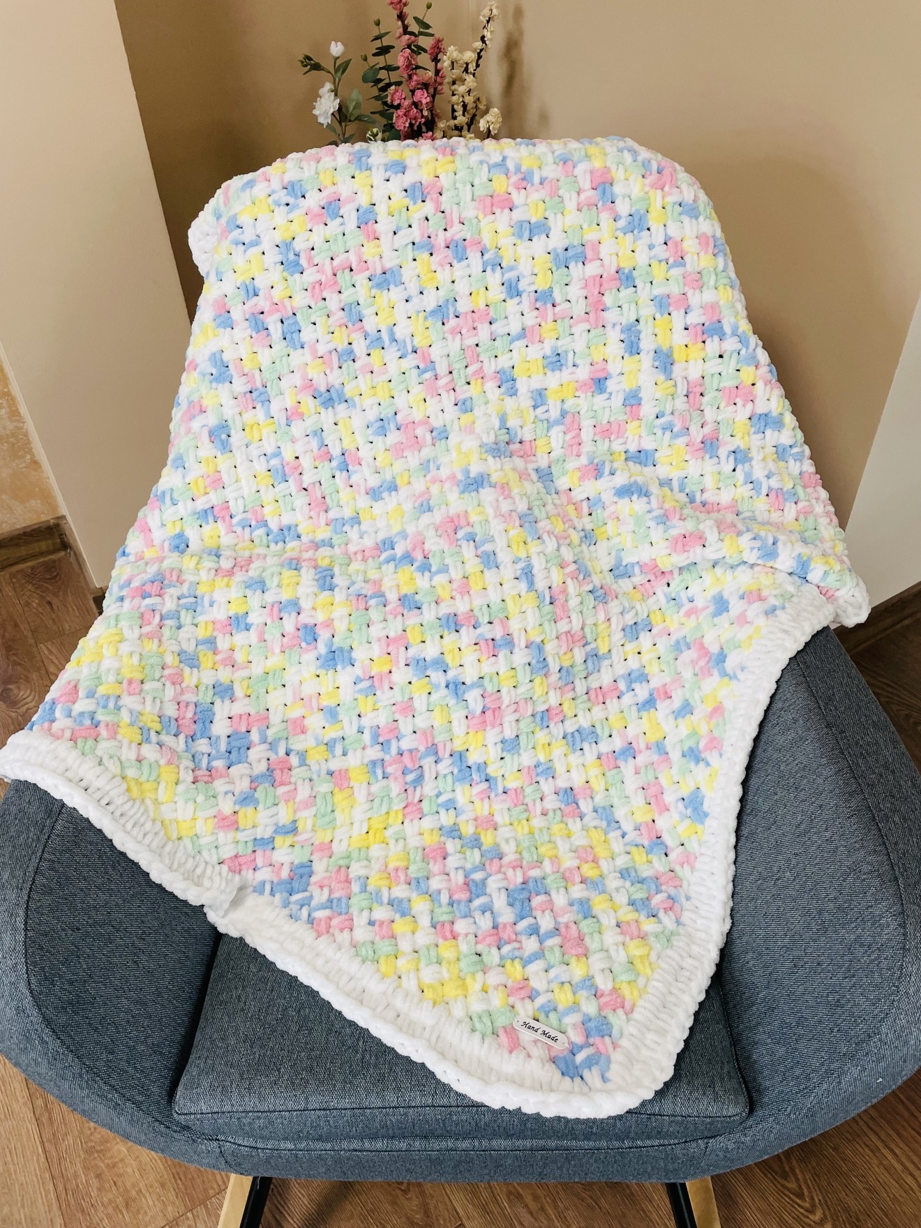 Нежност, топлина и уют - всичко това е вплетено в това меко одеялце, изработено на ръка от пухкавата прежда Alize Puffy Fine. Всяка бримка е направена с внимание и усмивка, за да донесе спокойствие и комфорт на вашето мъниче. Одеялцето е идеално за количка, легълце или като мил и личен подарък за новородено. Не боцка, не запарва и е изключително меко на допир - като прегръдка! Размер: 95x115см Цвят: меланж Материал: Alize Puffy Fine - хипоалергенна и лесна за поддръжка Всяко одеялце е уникално - изработено с любов, специално за най-малките съкровища.