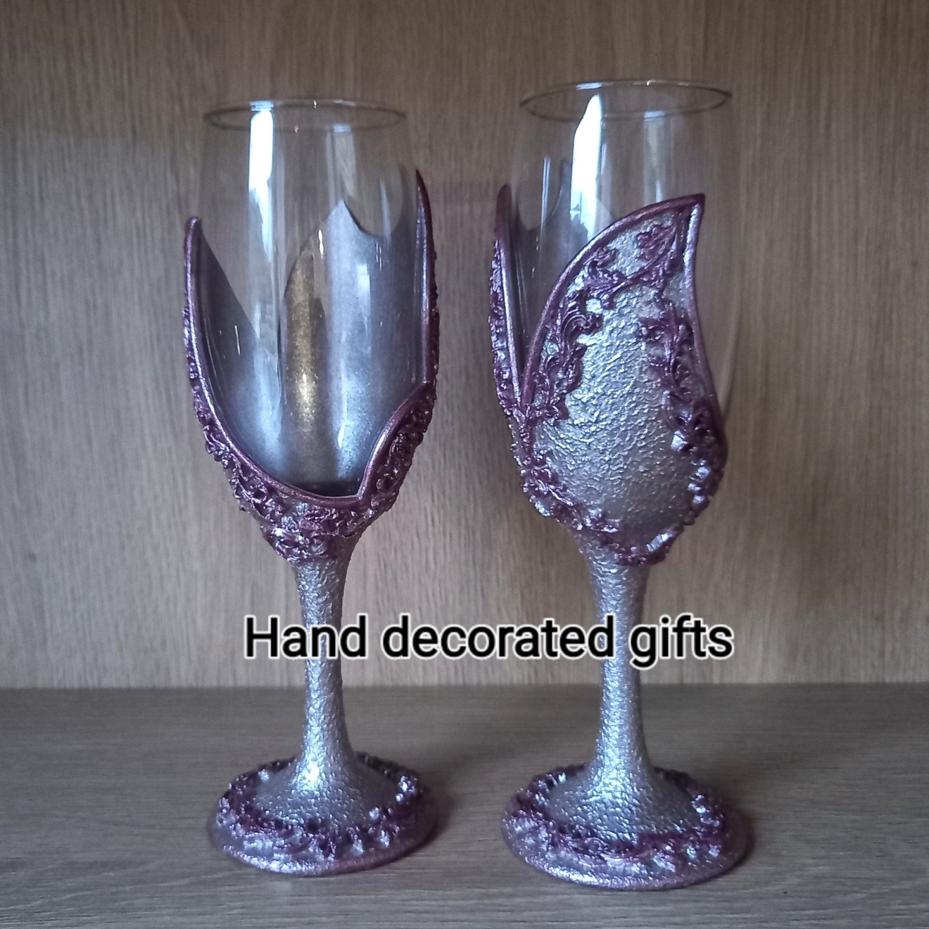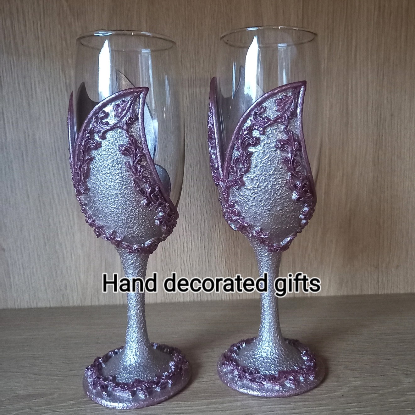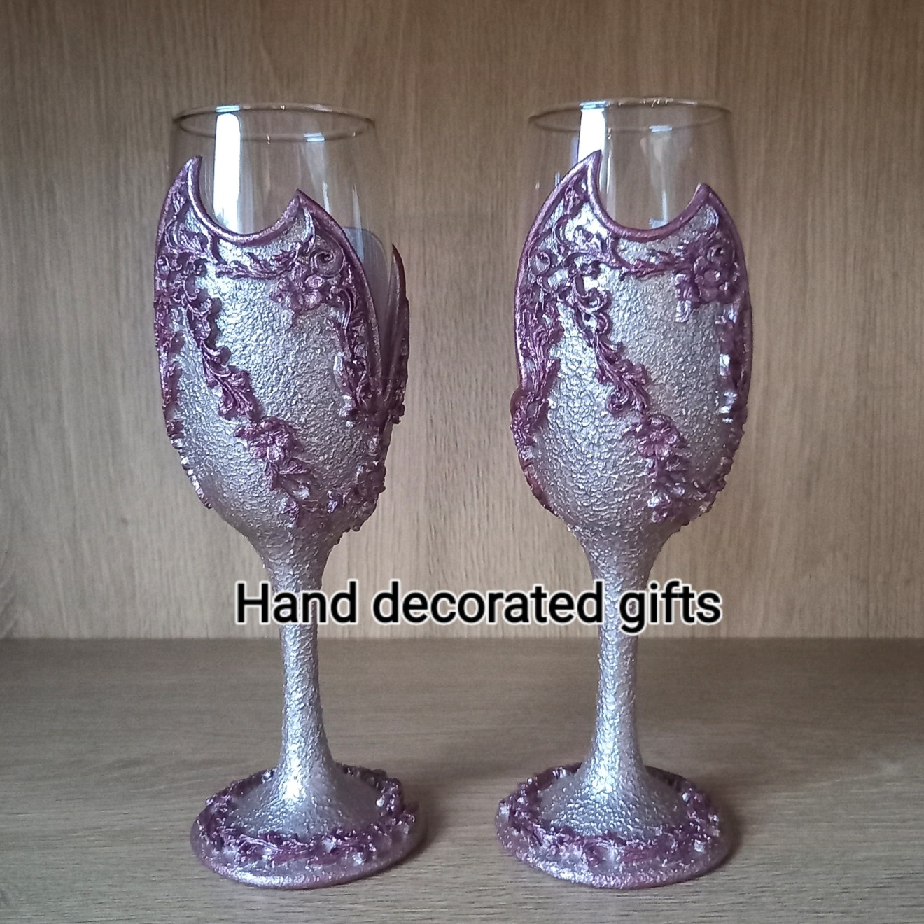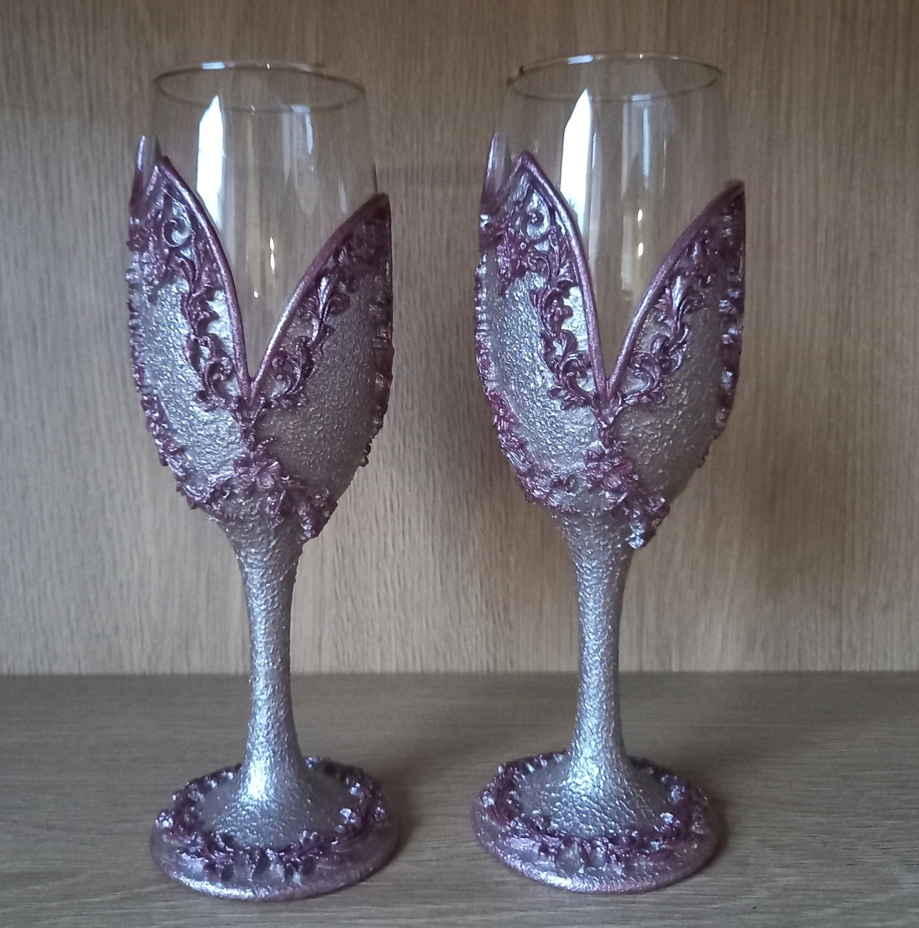 Сет от две чаши за бяло вино, декорирани с бои за стъкло, глина, обемни елементи, лак. Препоръчвам само ръчно миене с хладка вода.