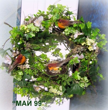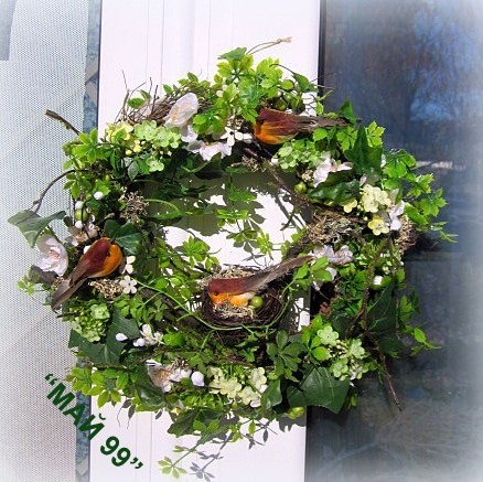 Пролетен венец ф 36 см. на основа натурални пръчки,зеленина,изсъхнал мъх,клон с мъх,пролетни цветчета и топчета,гнездо и 3 врабчета. Чудесена пролетена/ може и всесезонен/ украса за вашата врата!