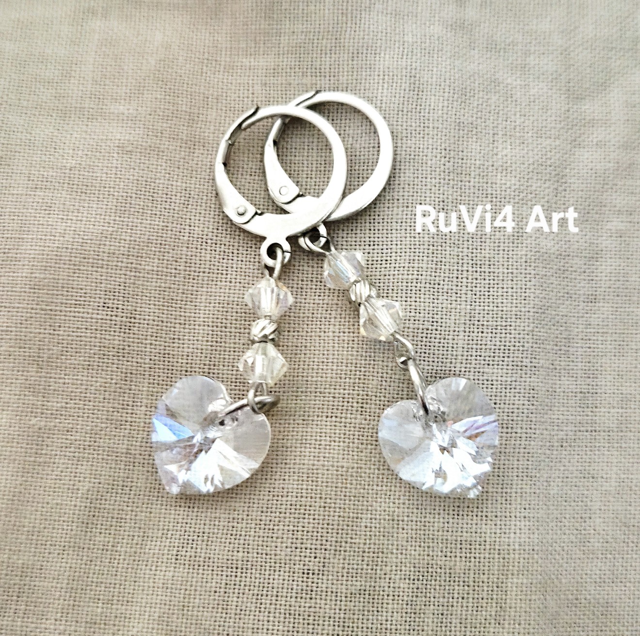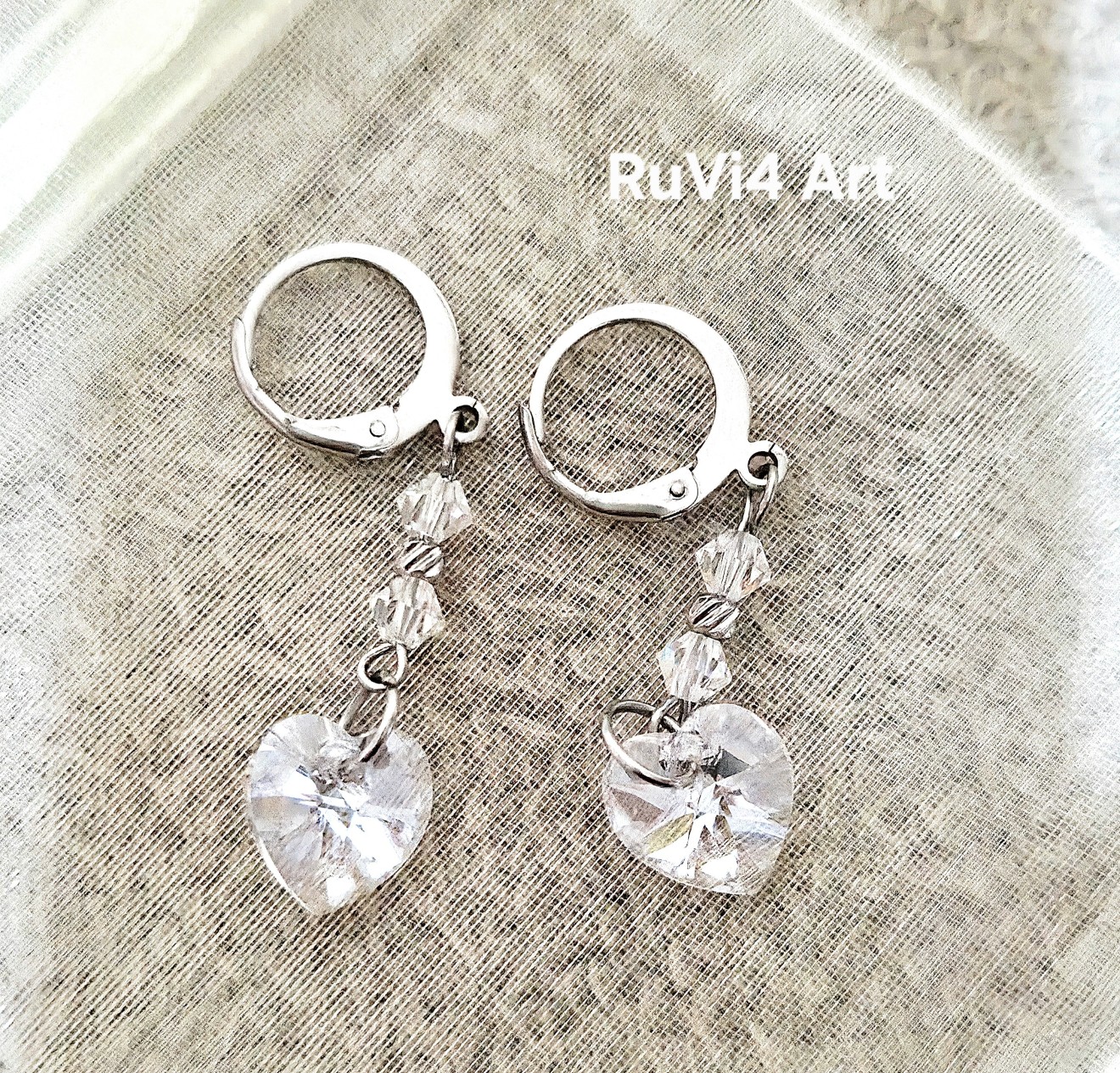 Обеци, изработени от сърца Swarovski, кристални биконуси Preciosa и стоманени елементи.