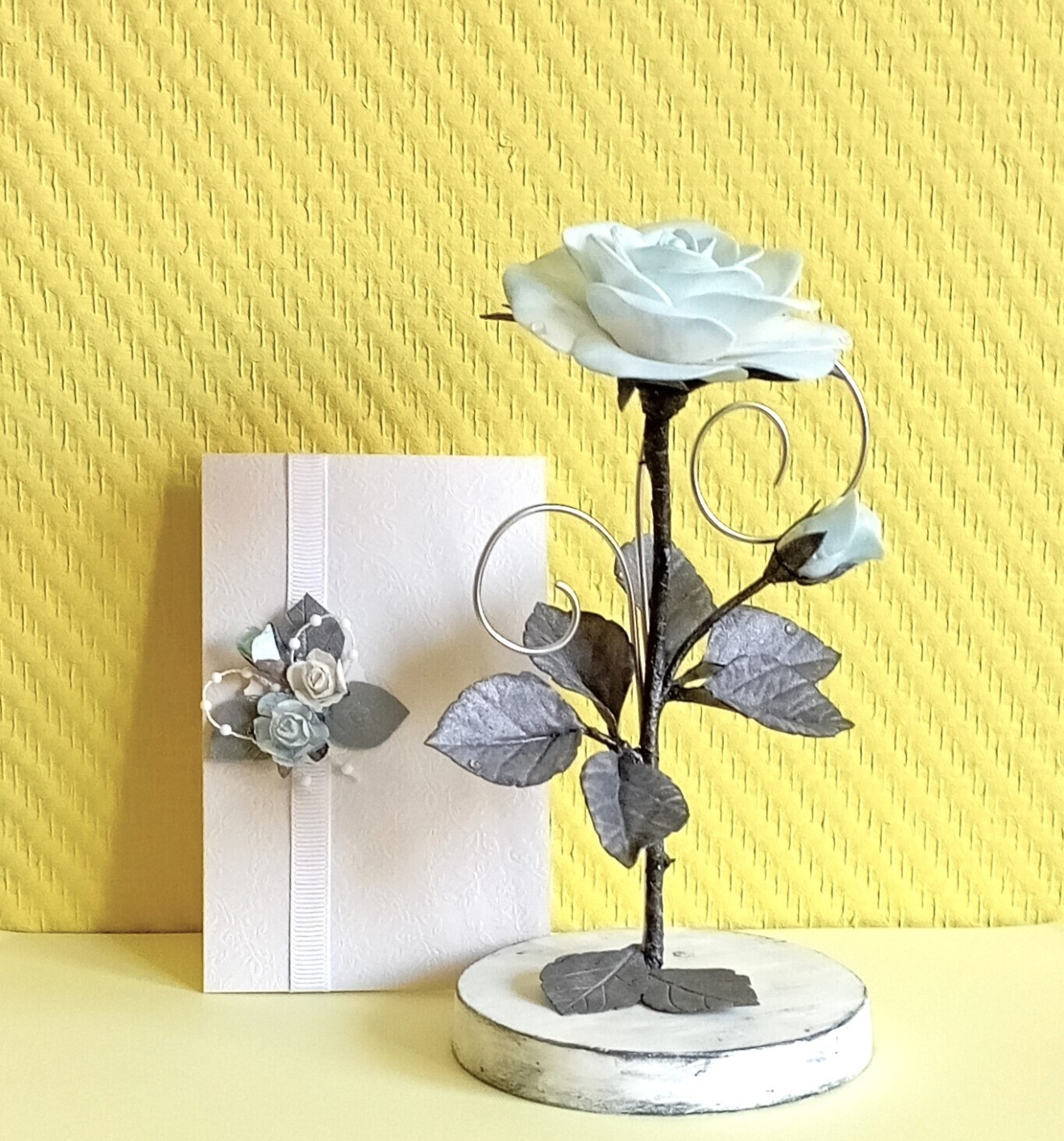 Декорация - основа от дърво,алуминиева тел цвят сребро,роза - тел,силиконова тръбичка,фоамиран. Картичка с размери 14/9 от релефен перлен картон,ширит сатен рипс,хартиени рози и др. Използвани са бои и лак на водна основа. Цена само за декорацията с роза - 21 лв., в комплект - 25 лв. Налични и друг цвят рози .