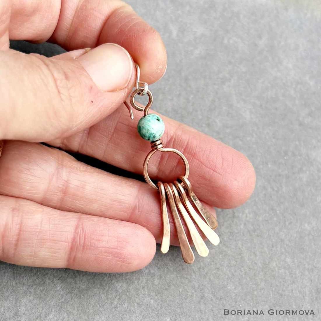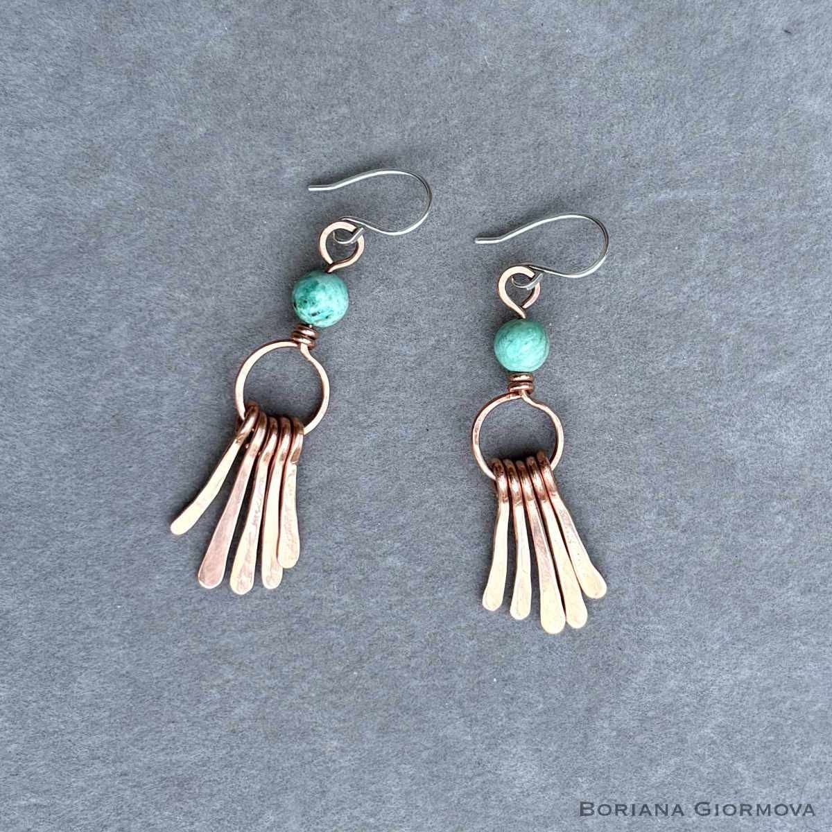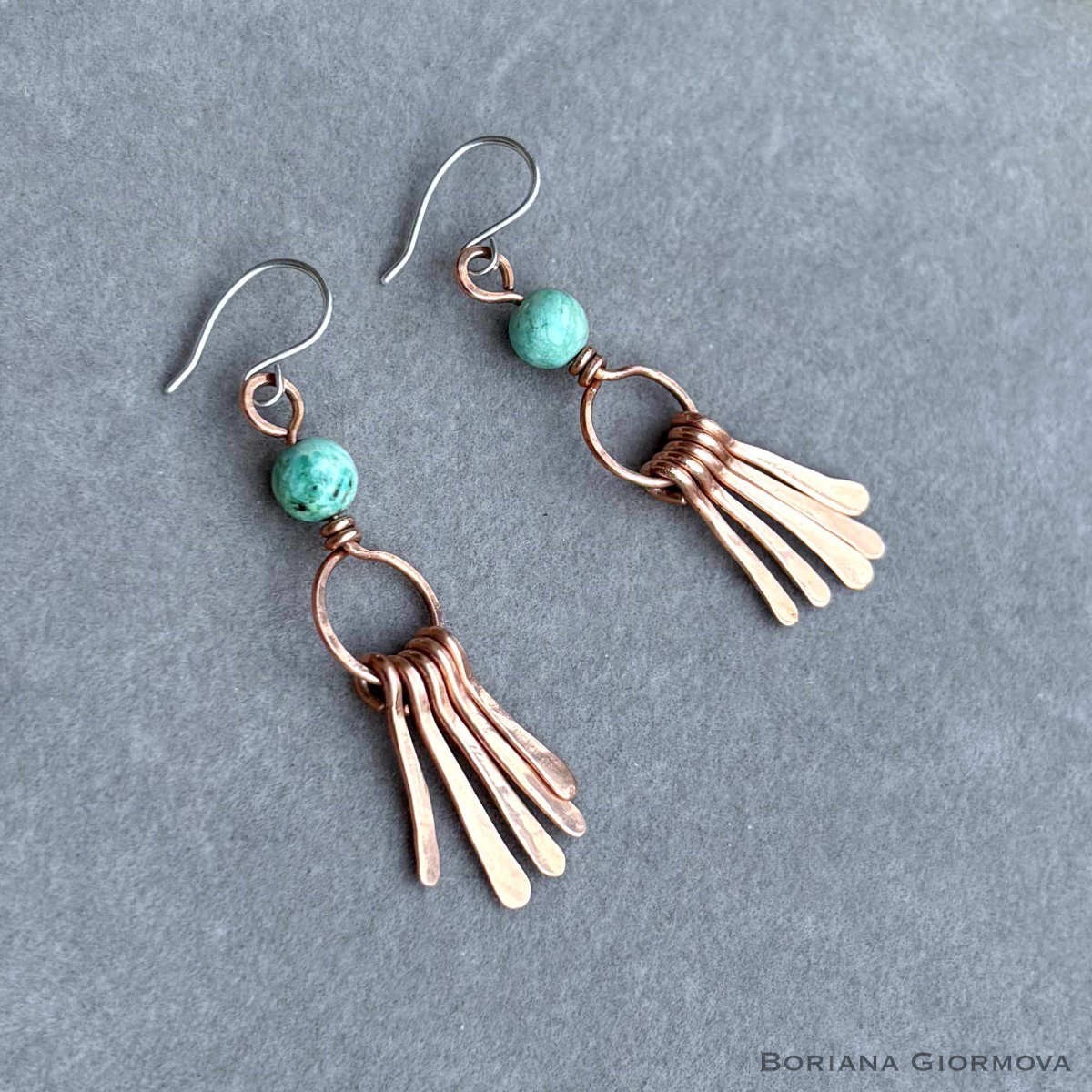 Тези ръчно изработени висящи обеци с тюркоаз са създадени като изразително statement бижу с бохо характер. Изцяло ръчно изработени. Имат динамична конструкция, която отразява светлината и създава красиво движение при носене. Полираната мед придава топъл блясък, а естественият тюркоаз добавя свеж син акцент. Тюркоазът е рожден камък на родените през декември. Той се асоциира със защита, късмет и безопасно пътуване. Смята се още, че носи спокойствие и баланс и подпомага комуникацията и себеизразяването. Детайли: • Ръчна изработка от начало до край • Полирана мед • Кукички от сребро проба 925 • Пет дълги висящи медни елемента с форма на капка на всяка обеца • Естествен тюркоаз - син, 6 мм • Изцяло ръчно изработен, уникален дизайн • Приблизителна обща дължина: 56 мм • Приблизителна дължина на висящата част: 46 мм • Приблизителна ширина: 15 мм • Пристигат в кутия за бижута - готови за подарък Подходящи за любителите на артистични, смели и автентични ръчно изработени бижута.
