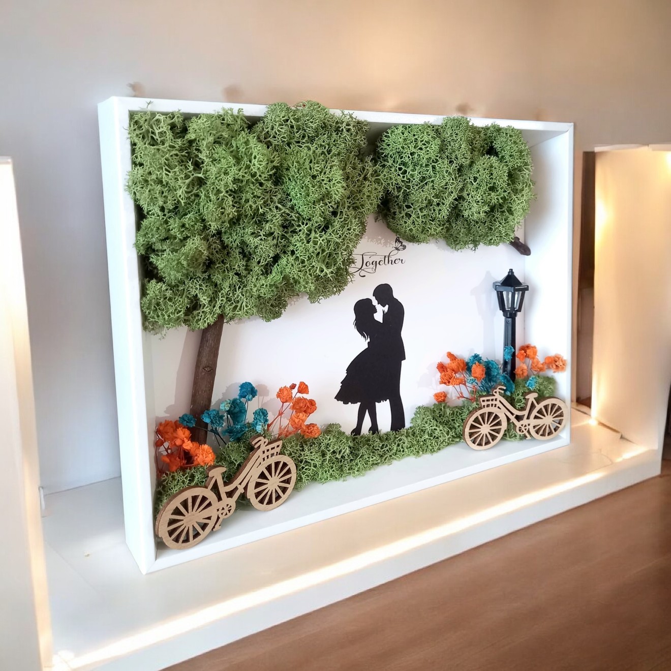 💖✨ Любов, уловена в картина… ✨💖 🎁💝 Перфектният подарък за Свети Валентин, който говори вместо думи и остава завинаги. 🌿 Ръчно изработена картина със скандинавски мъх, стабилизирани цветя и клонки, носещи романтика и уют. 🏡 Композицията е малък свят с истински умалени фигурки – колела и фенер, които разказват нежна любовна история. 💌 Различен и емоционален подарък, който не увяхва, както истинската любов. ✍️ Персонализация по желание: ❤️ Надпис ❤️ Имена на двойката ❤️ Специално послание 🎁 Подходящи за Свети Валентин, годишнина, годеж или друг специален повод. Размери 22/17 см.