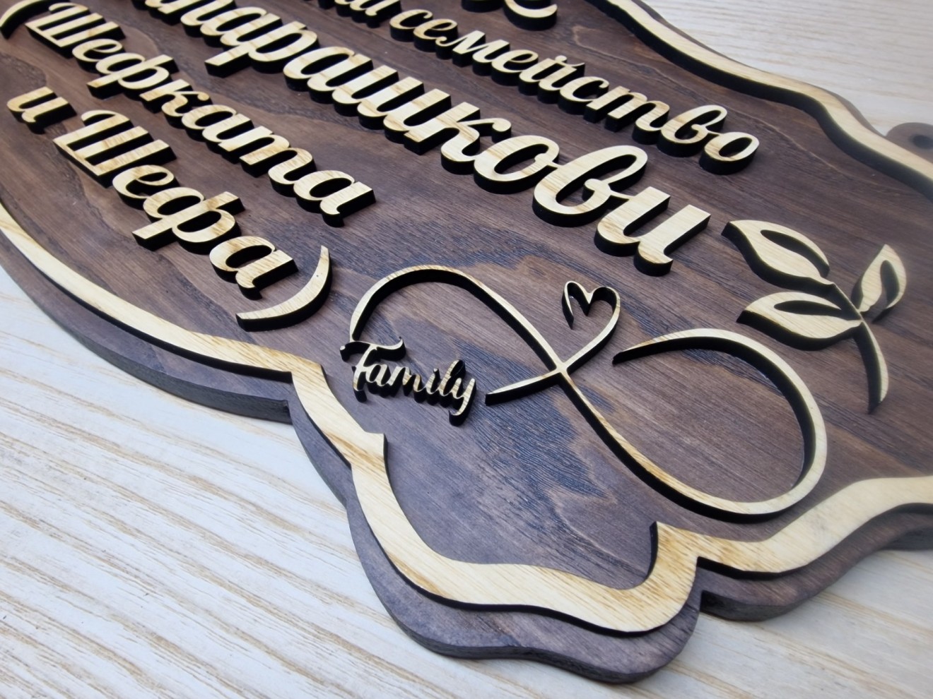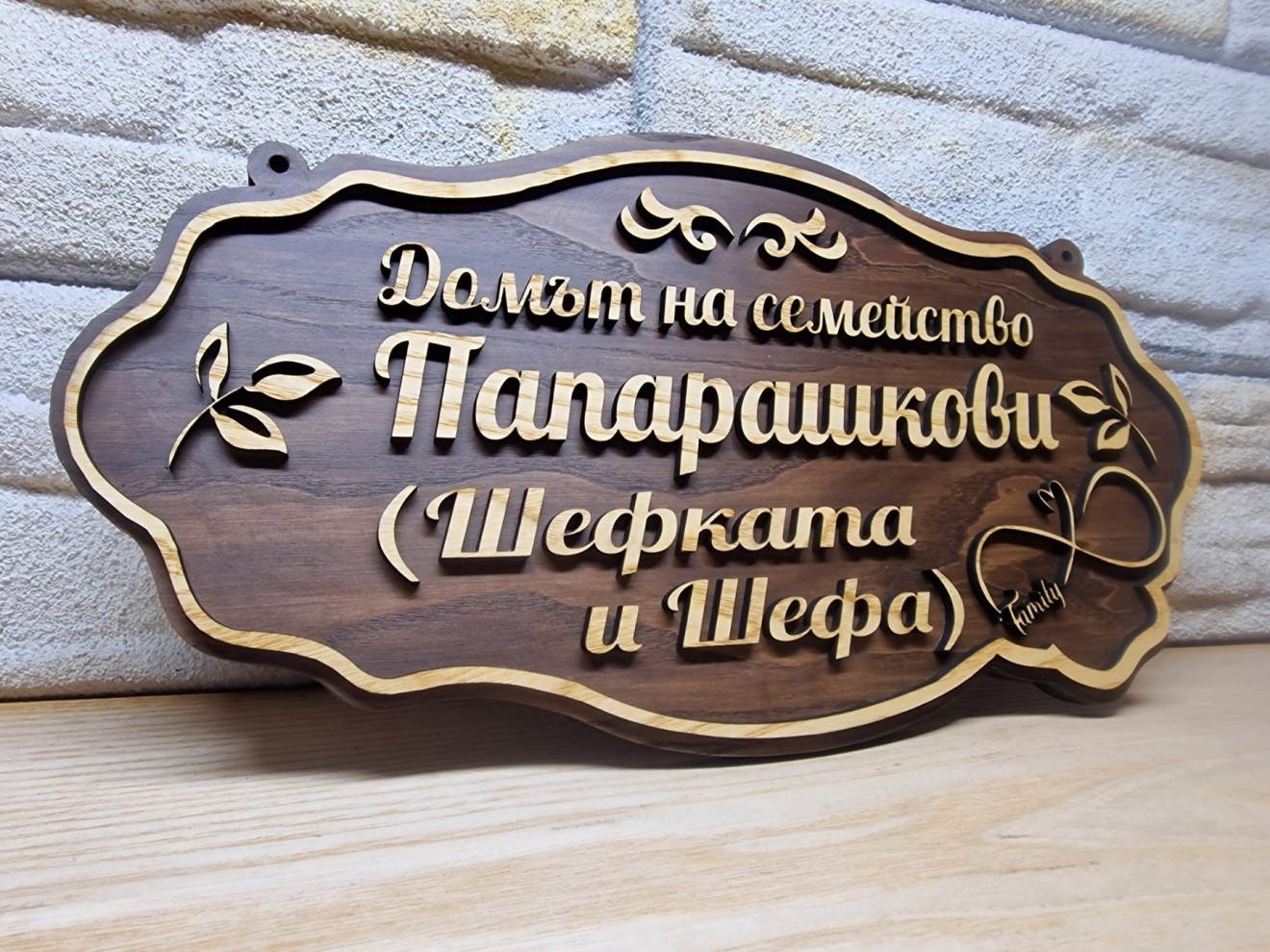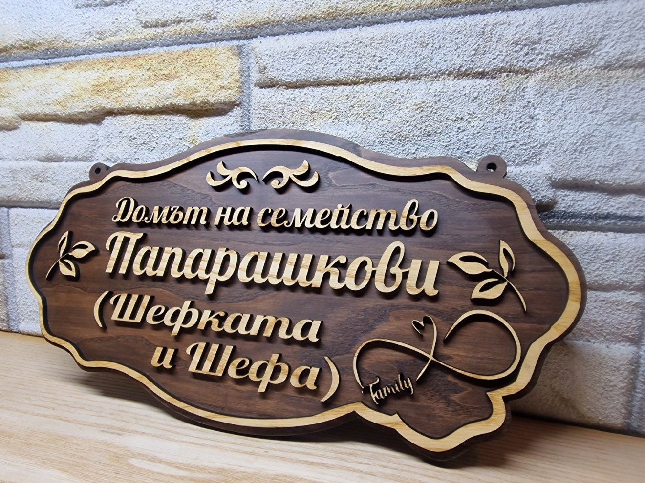 ✴️Персонализирана табела с вашите имена за врата по поръчка. ✴️Табелата е ръчно изработена и направата ѝ може да се съобрази със желанията на клиента - с Ваш текст. ✴️Предлагаме изработка на персонализирани табели по наш проект, или ваша идея! ✴️Табелата се състои от релефни надписи с имена и флорални елементи в рамка. ✴️Чудесен специален подарък! ✴️Можете да зададете конкретен проект, който ние да изпълним специално за Вас! ✴️В зависимост от надписа върху табелите, те могат да се използват за входна врата, пощенска кутия, офис, врата на стая, декорация, за веранда, градина, забавни и смешни табелки, подходящи за ресторанти , заведения , бирария и всичко, което пожелаете! 📌Размери: ▶️Дължина: 38 сантиметра ▶️Широчина: 20 сантиметра 🔆В нашата работилничка можем да изработим за вас: ✅Дървена табелка за врата ✅луксозни табелки за врата ✅оригинални табелки за врата ✅табелка за входна врата ✅забавни табелки за врата ✅ръчно изработени табелки за врата ✅табелка за врата на детска стая