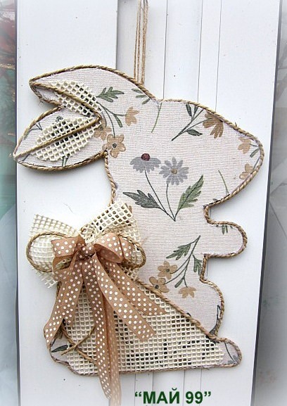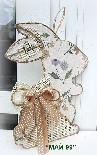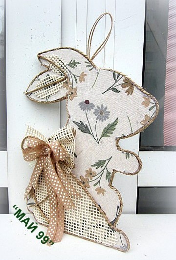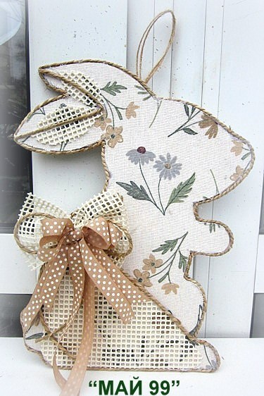 Висяща великденска украса - плосък дървен заек с височина 30 см. обвит в лен на цветя и бяла мрежа и многоцветна панделка и натурален шнур! Чудесен великденски декор за вашия дом!