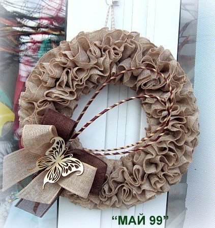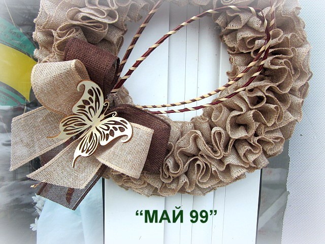 Ръчно изработен,пищен венец от зебло от фин мек тектил ф 40 см.с голяма двуцветна панделка,дървена пеперуда и натурални пръчки/бежево кафяво/ Чудесен всесезонен венец за вашата врата или офис!