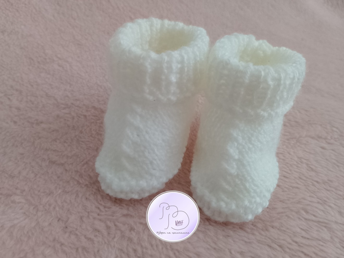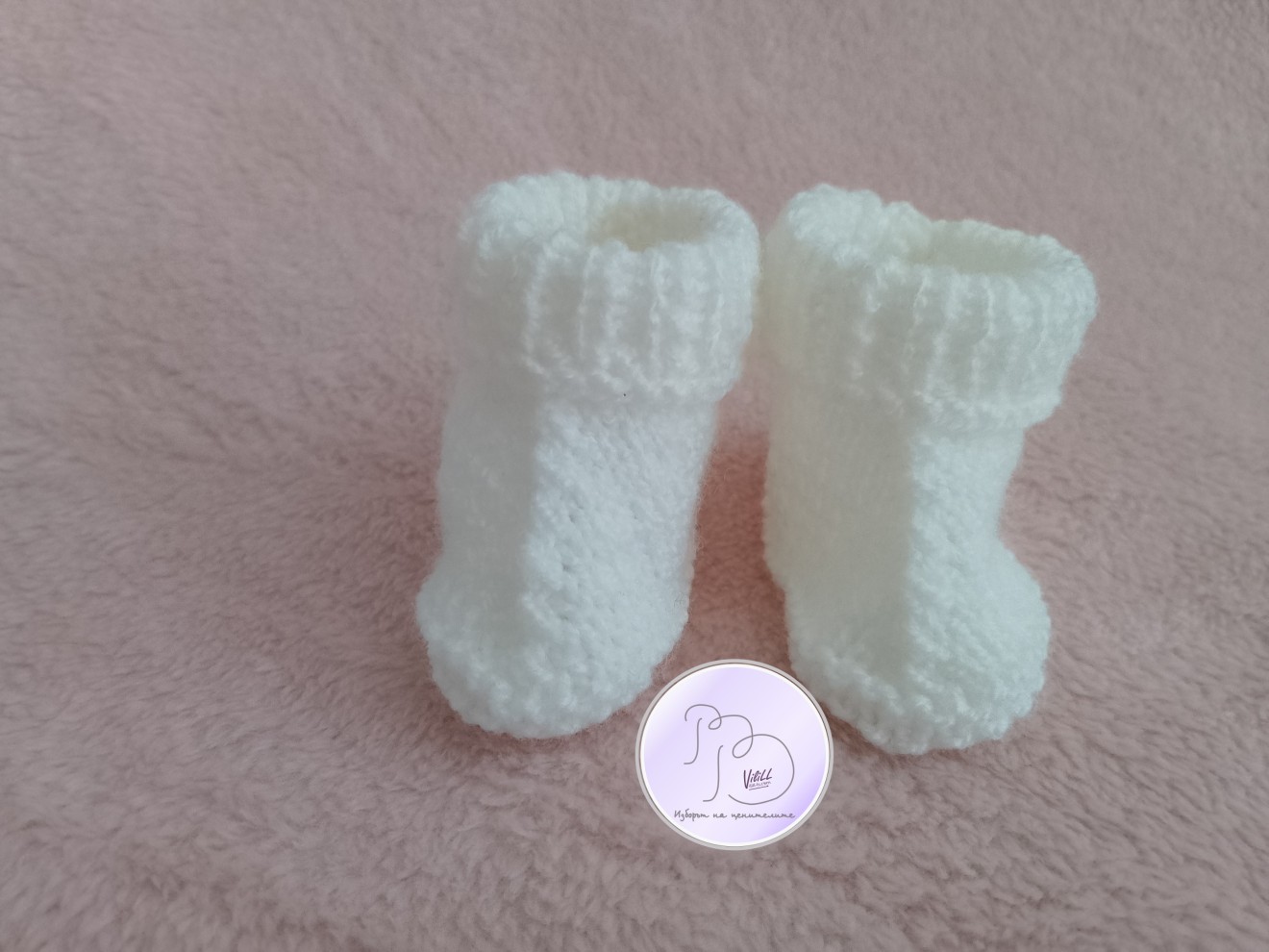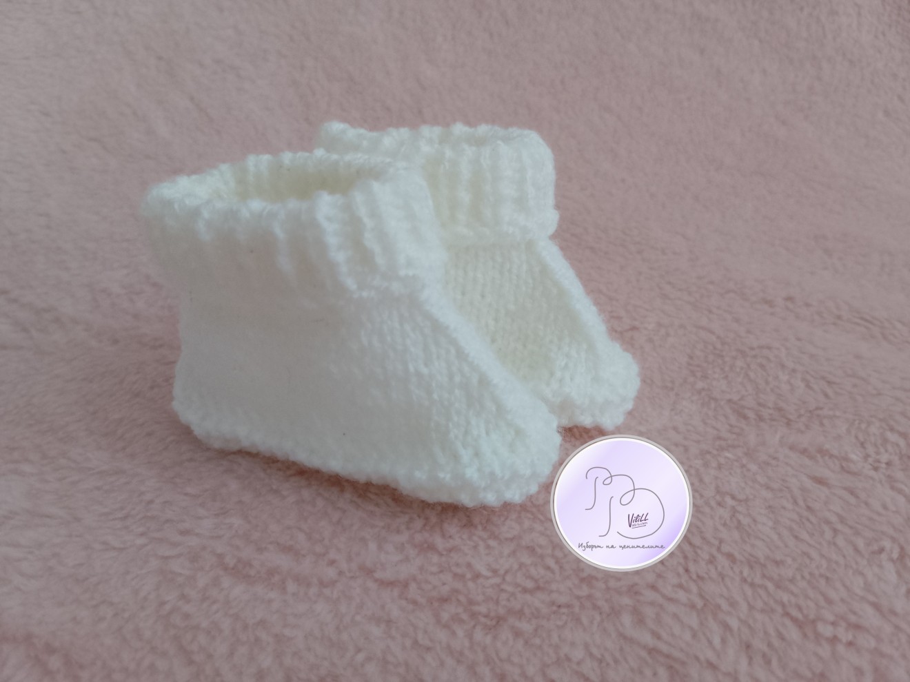 Бебешки терлички за 0-3 месечно мъниче. Приблизителни размери: -височина- разгърнат маншет- около 7 см.При сгънат маншет- около-5.5-6 см. дължина около 8см. -широчина-около- 4см. Материал: прежда- 100% акрил, подходяща за бебета и хора с чувствителна кожа. Може да се изработят и в друг цвят и съдържание на преждата (памук, памук+акрил, акрил+вълна);цената ще е различна от тази на представения модел. Цена: 8 евро/15.65 лв./1 чифт. Ддоставка до офис на Еконт за сметка на получател.