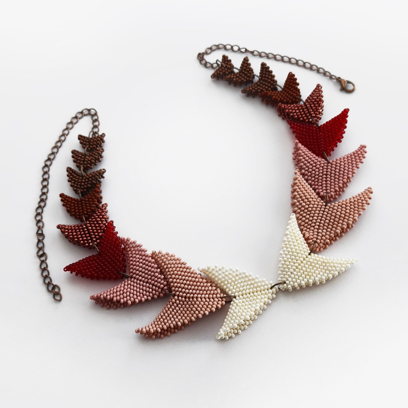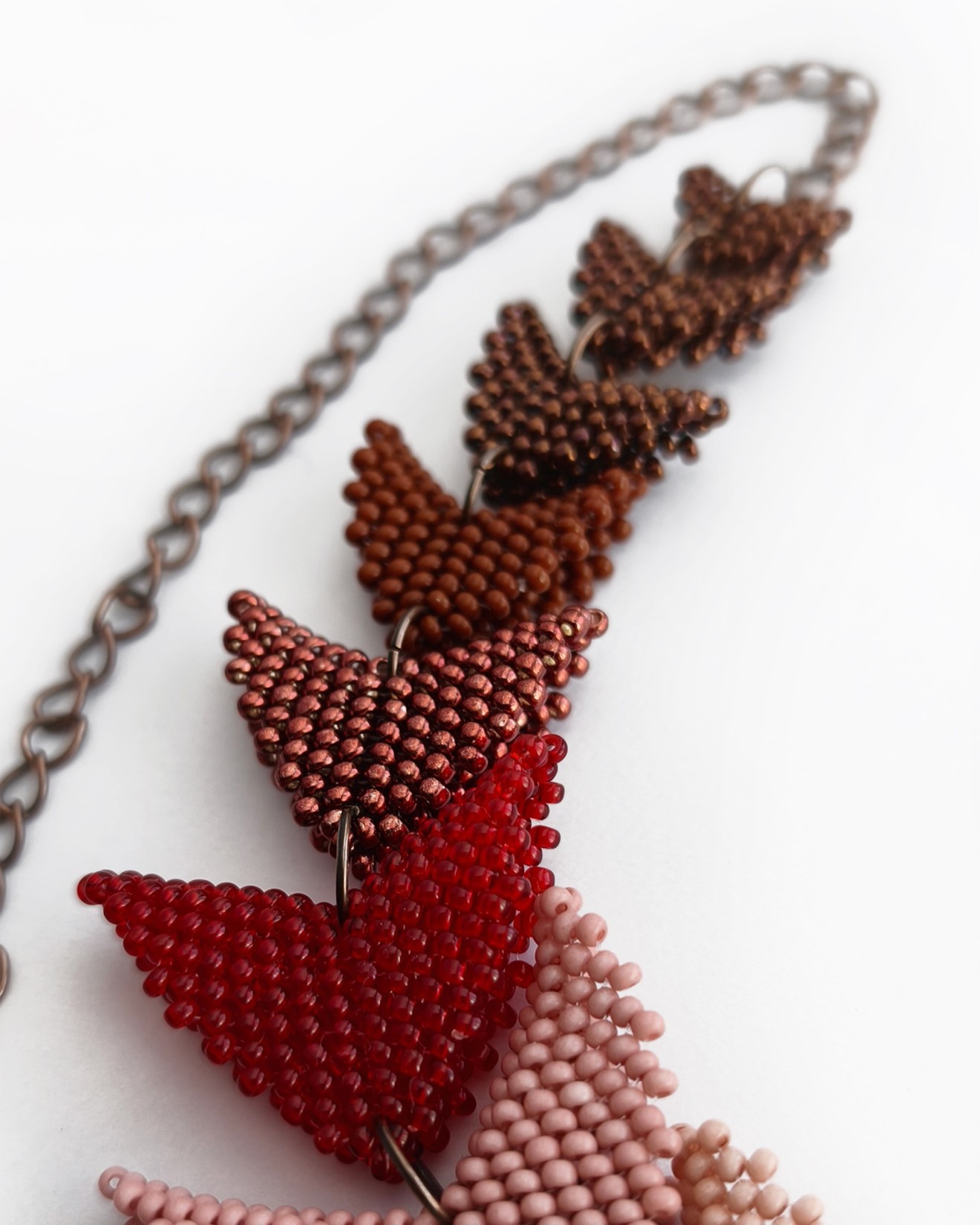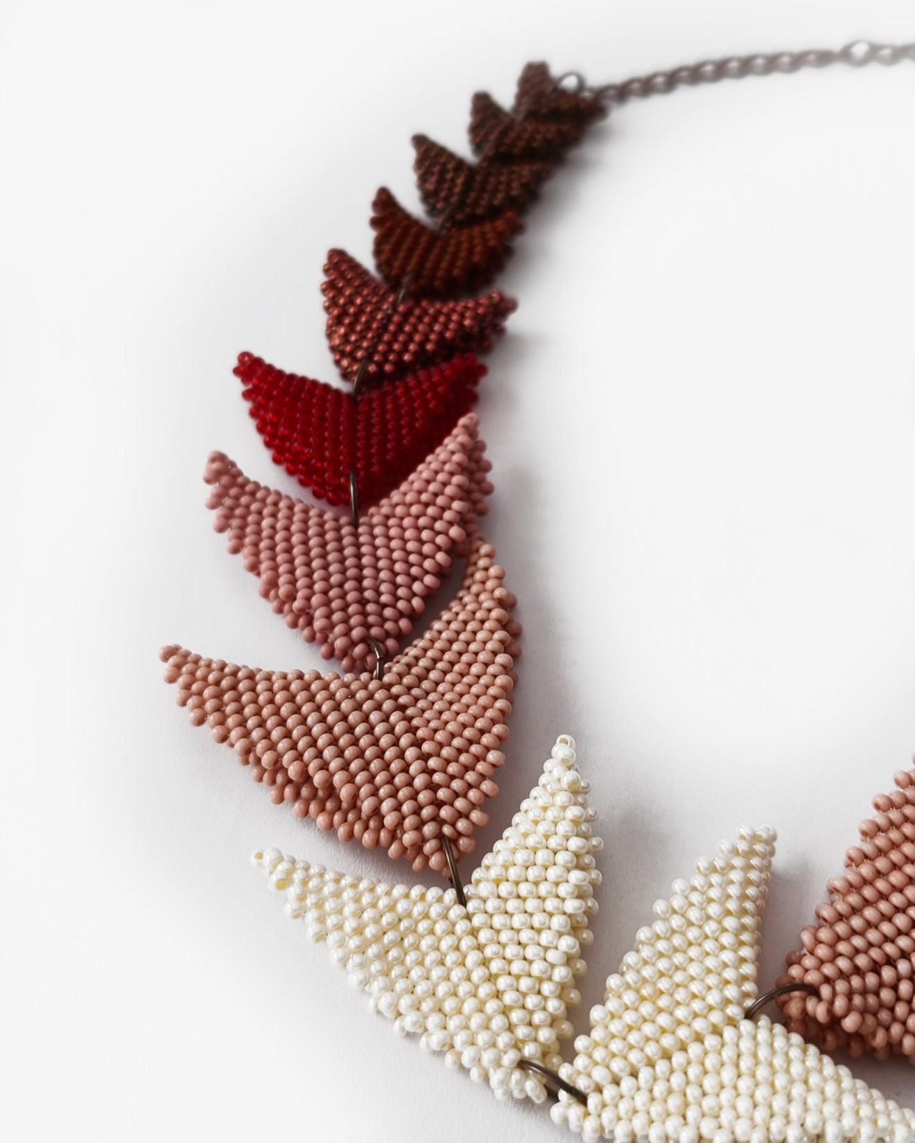 - Мъниста: бежово, нюд, пепел от рози, наситено червено, металик червено, кафяво, бронзово - Дължина на колието: ~43 см + 14 см верижка - Широчина на обемните детайли: 4х3.5 см, 3.5х3.5 см, 3х3.5 см, 3х2.5 см, 2.5х2.5 см, 2х2см, 1.5х2 см, 1.5х1.5 см и 1х1 см - Плетено на ръка Можете да разгледате и други модели във - Фейсбук: collier.jewelry.j.j - Инстаграм: collier.j.j