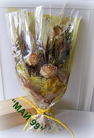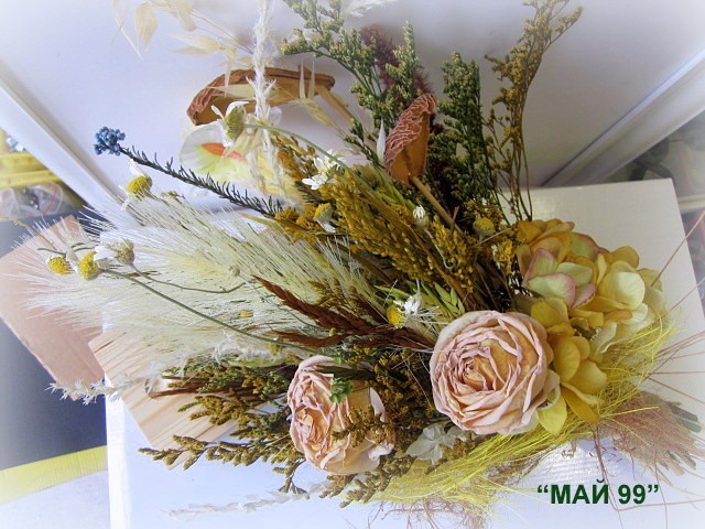 Букет сухи цветя,изсушени рози в опушено жълто,треви и натурални материали,зебло,слама и въже с дължина 40-45 см