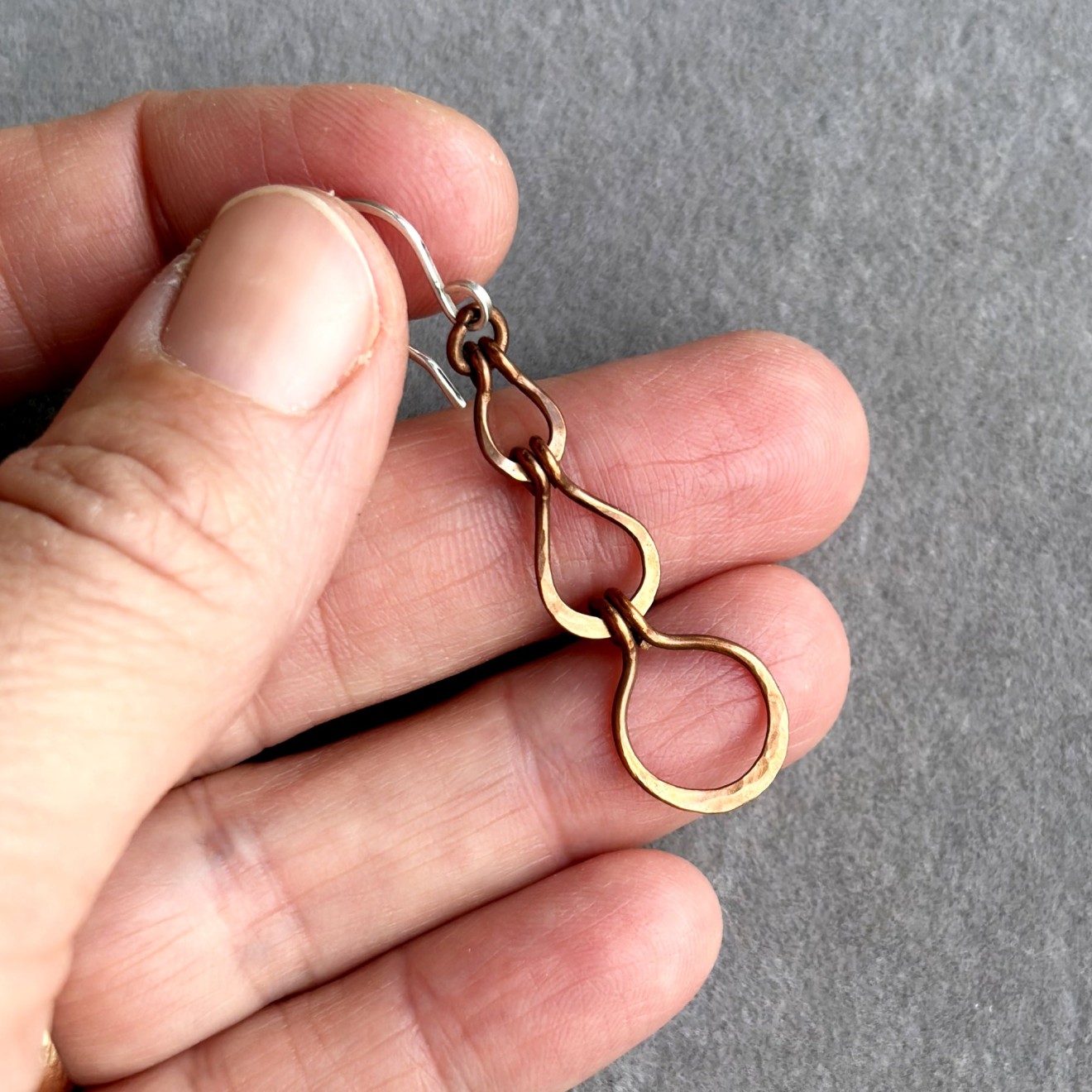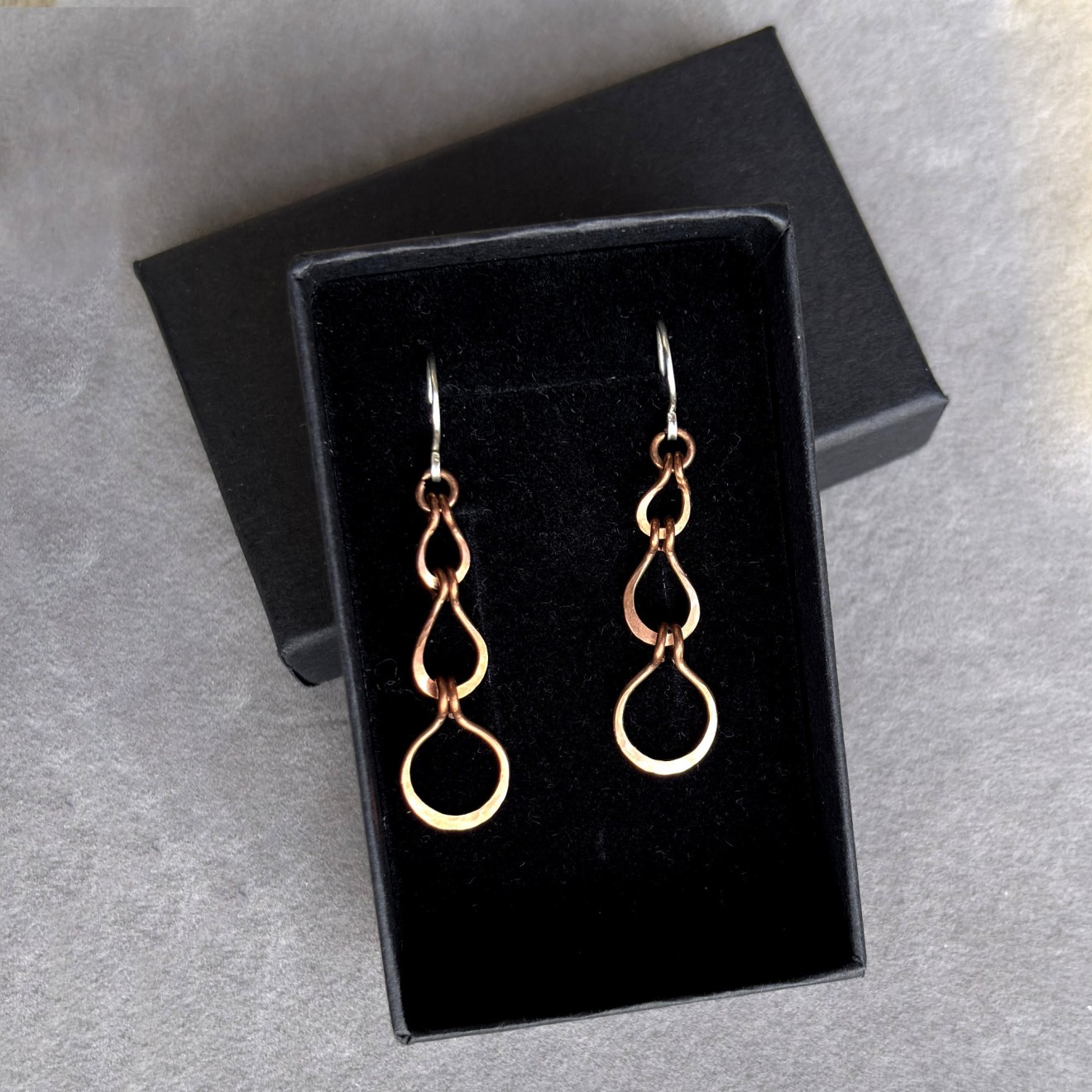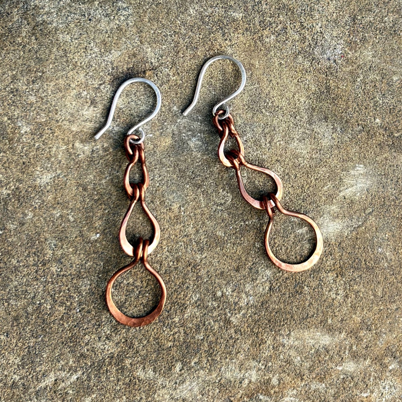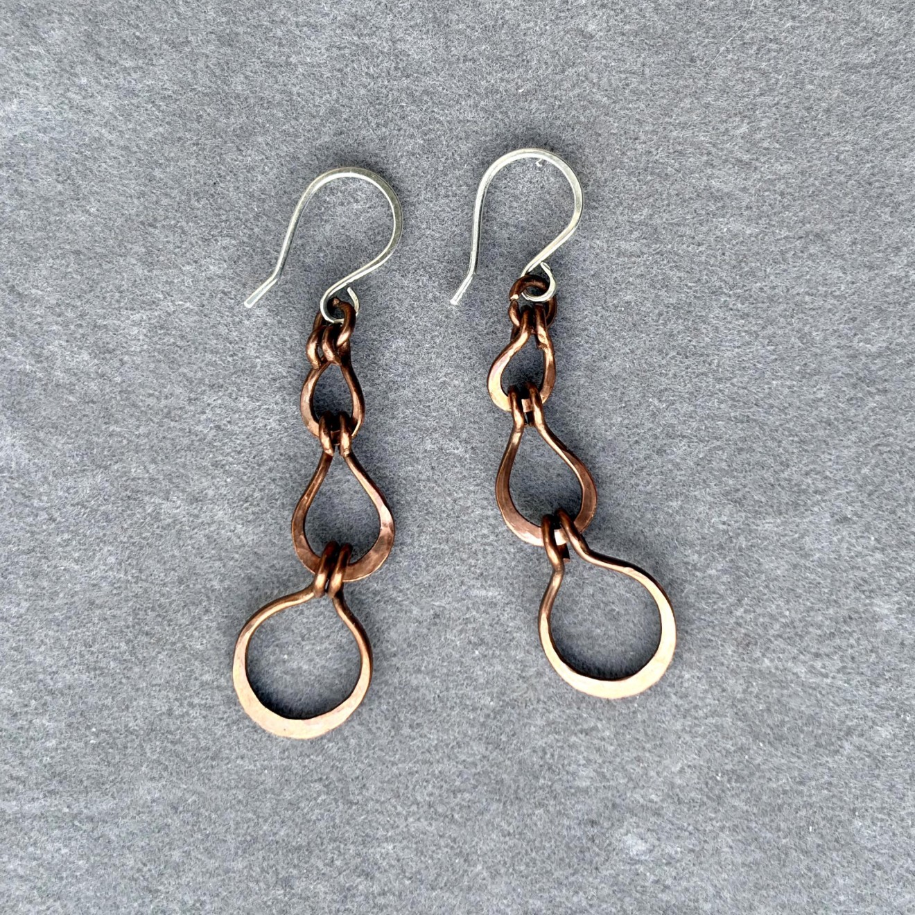 Ръчно изработени дълги обеци от оксидирана мед с три ковани елемента във форма на капки. Топъл, земен цвят и рустик бохо излъчване. Кукичките са от сребро 925, подходящи за чувствителни уши. Леки, ефектни и удобни за ежедневно носене или като оригинален подарък.