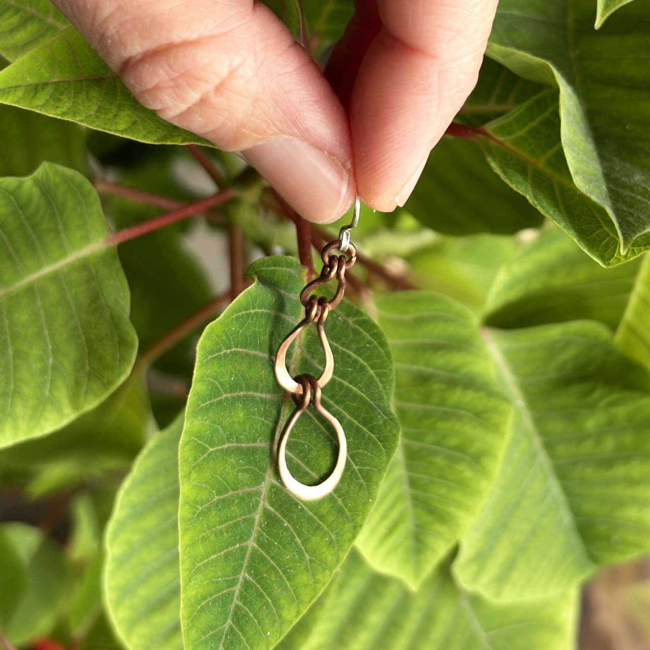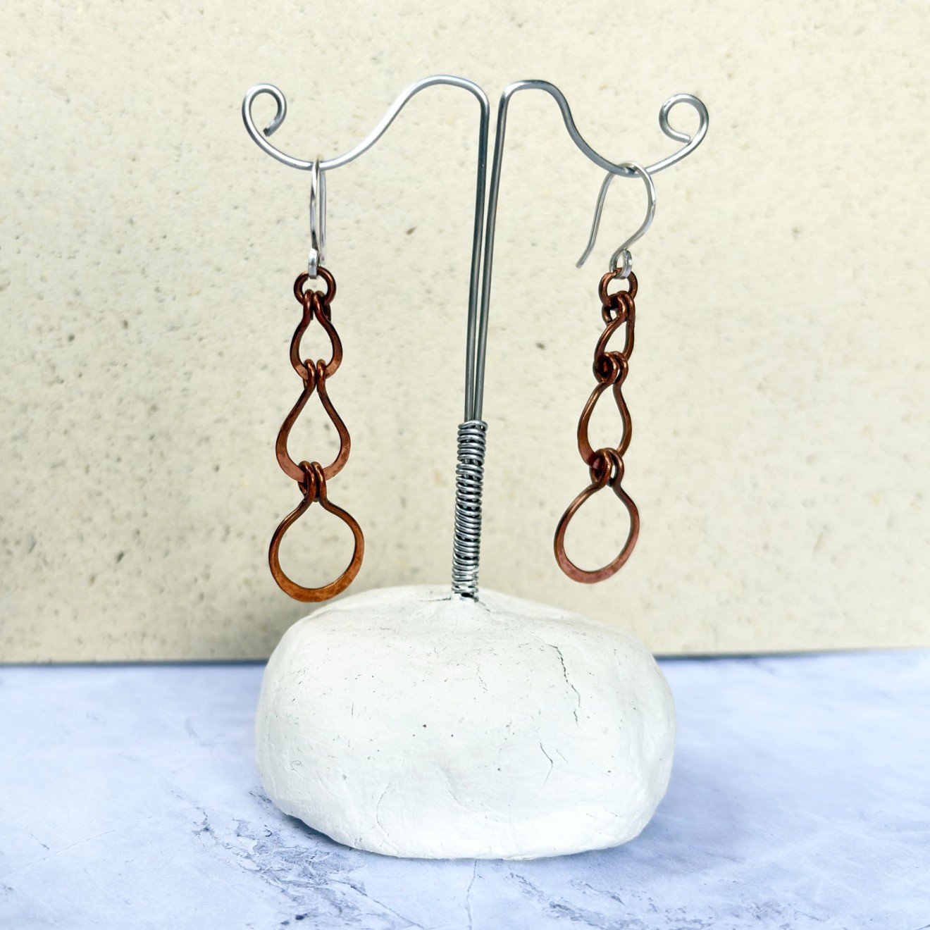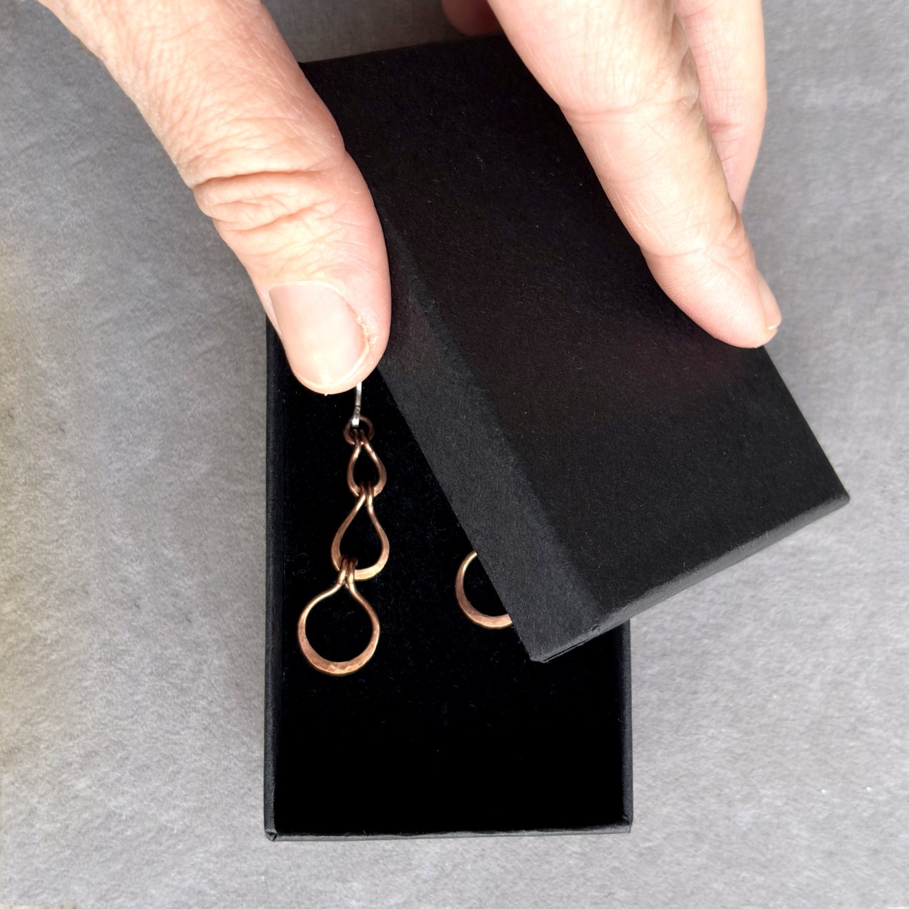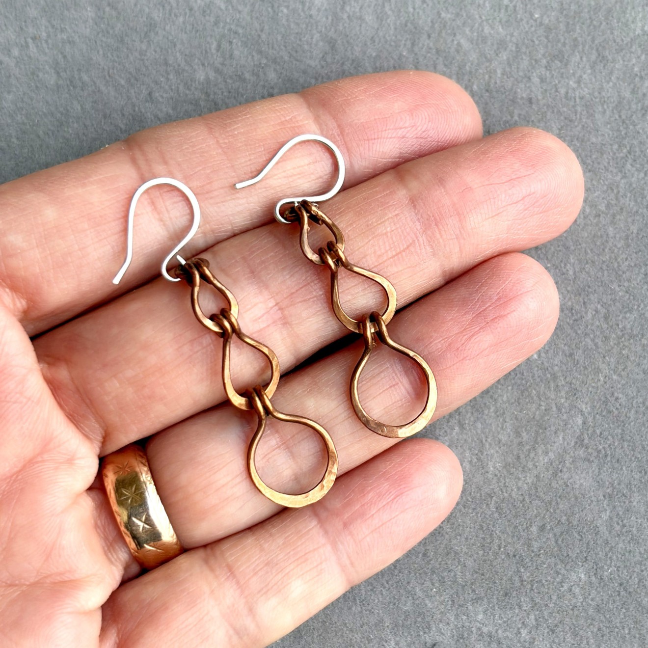 Ръчно изработени дълги обеци от оксидирана мед с три ковани елемента във форма на капки. Топъл, земен цвят и рустик бохо излъчване. Кукичките са от сребро 925, подходящи за чувствителни уши. Леки, ефектни и удобни за ежедневно носене или като оригинален подарък.