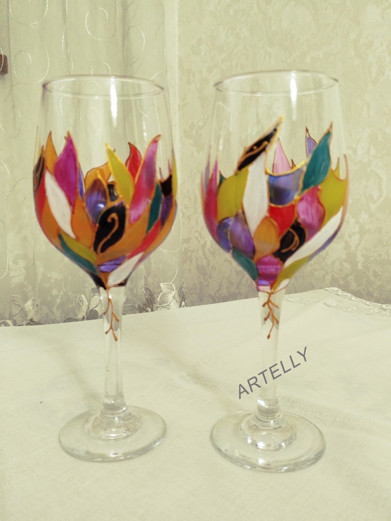 Два броя ръчно рисувани чаши за вино от 370мл - изискан подарък за рожден ден, имен ден, годишнина или друг повод, а защо не и без повод 😉 Възможност за персонализация. Фейсбук страница: https://www.facebook.com/artelly12