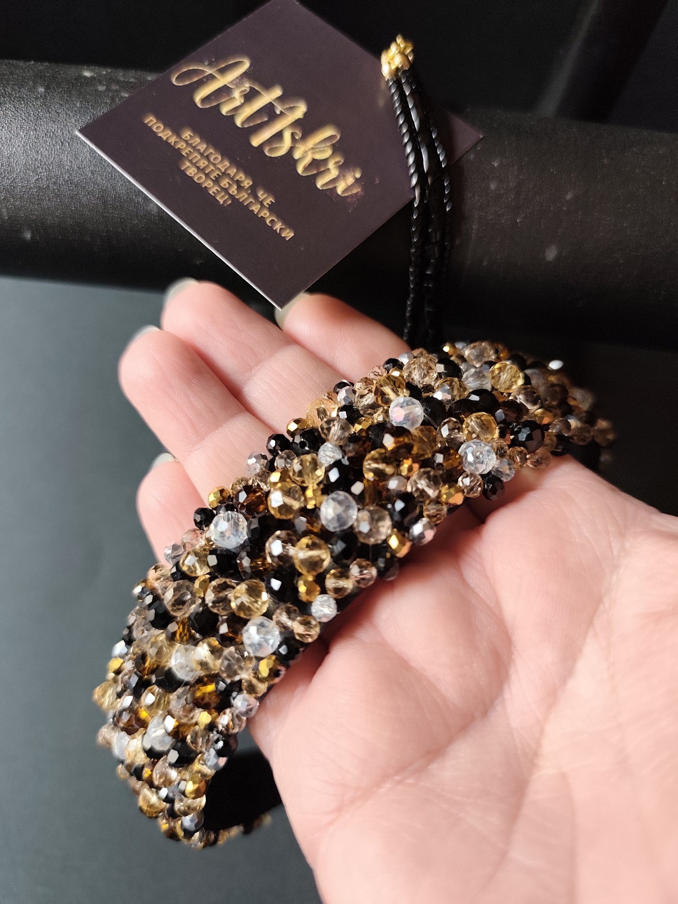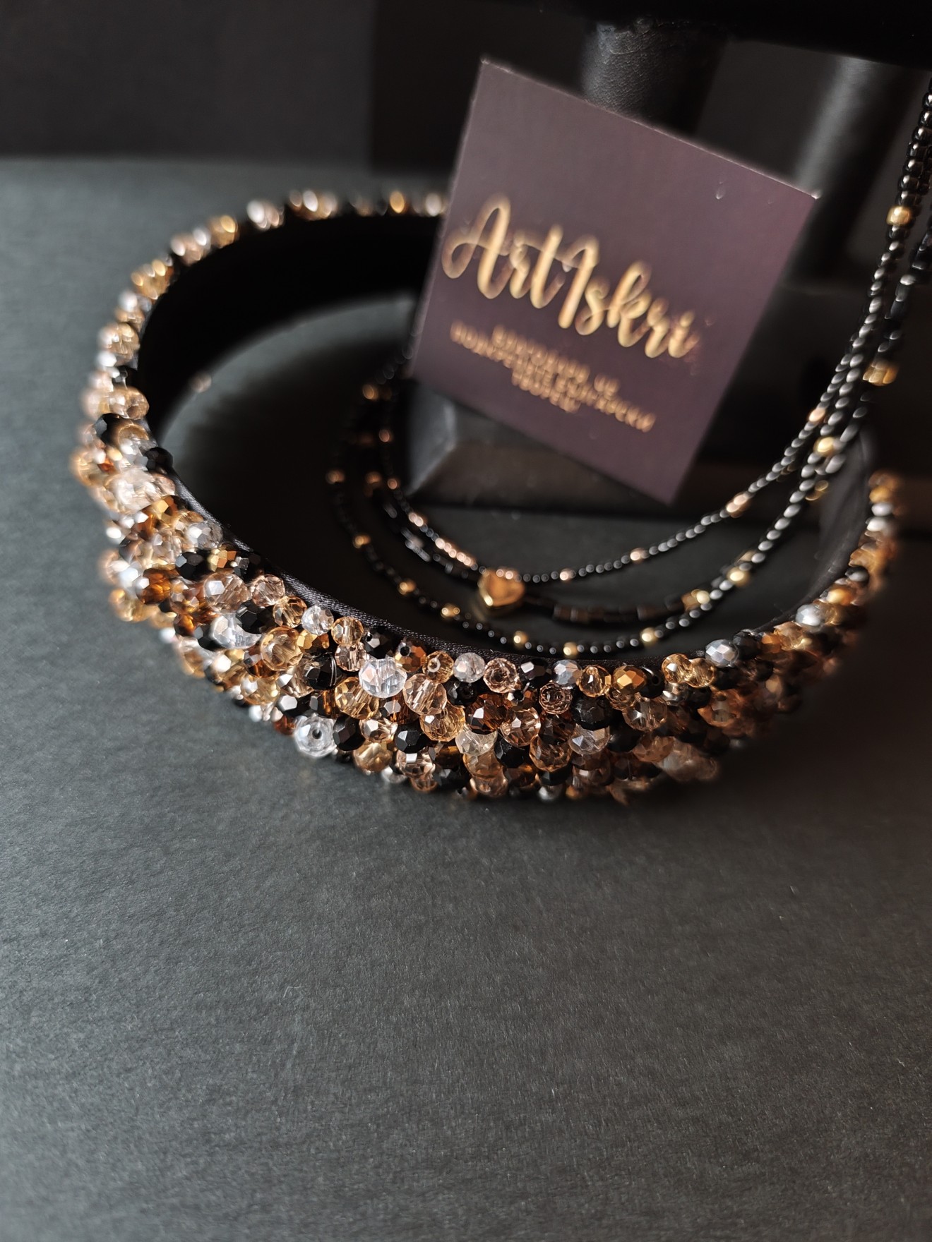✨🖤✨ Елегантност , стил и дискретен блясък в един аксесоар! ✨🖤✨ ✨Диадемата е изработена от стъклени кристали , чрез нашиване върху черна сатенена основа. Цветовата комбинация , прави диадемата подходяща за различни тоалети и поводи . ✨