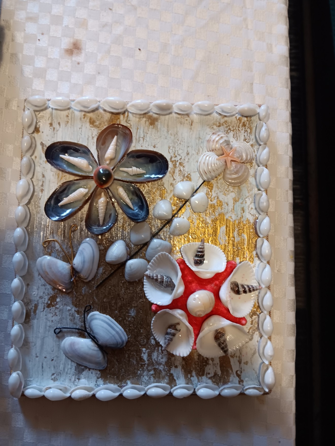 Пано дървена основа с естествени раковини. Използвани са акрилна боя, позлата, акрилен лак.
