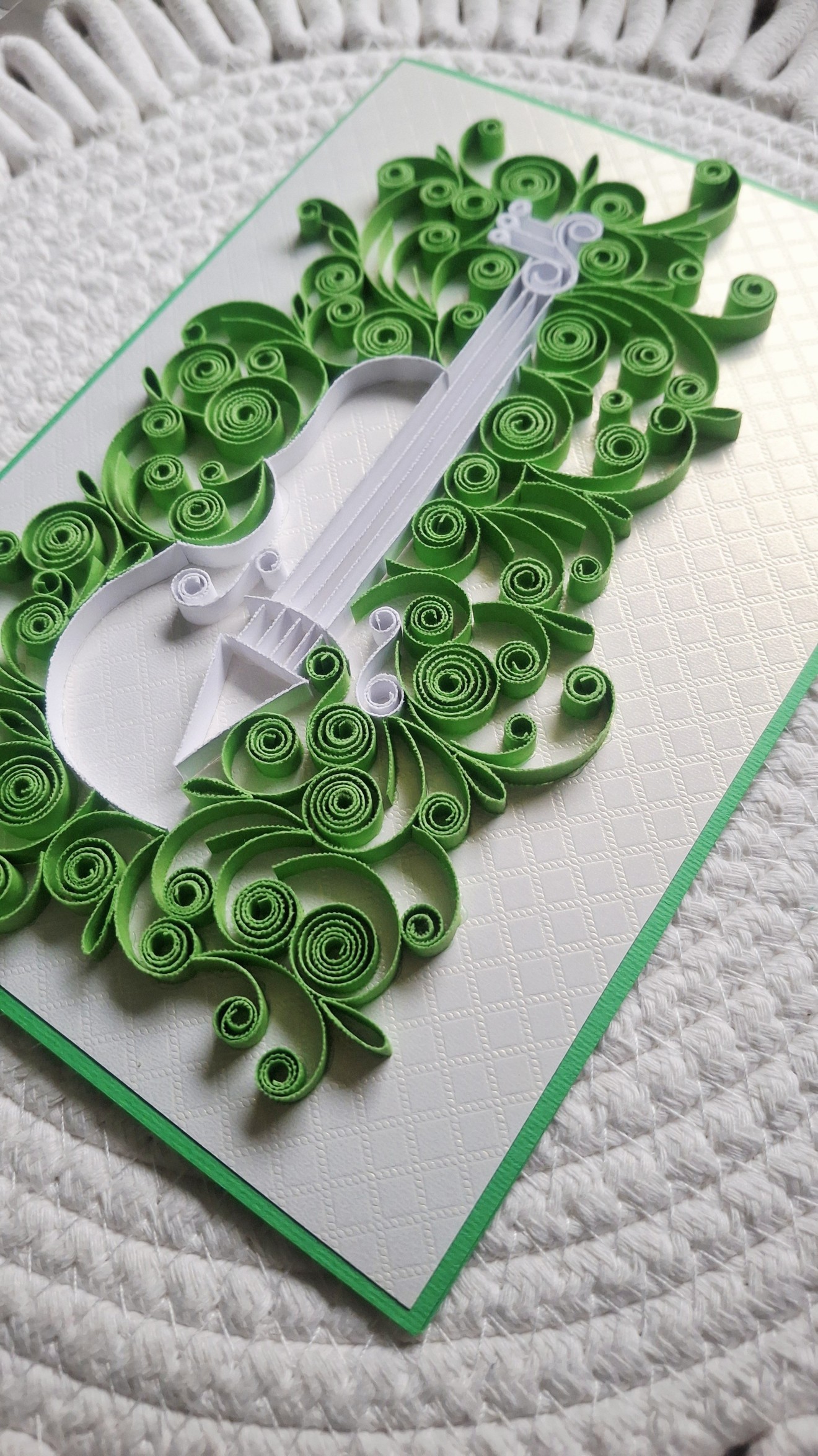 Квилинг картичка с цигулка, направена с внимание към детайла. Не е от онези картички, които просто се дават - по-скоро от тези, които се избират специално. Подходяща е за човек, който обича музиката, свири на цигулка или просто я усеща. За рожден ден, имен ден, юбилей или като малък, но личен жест. Картичката е налична и готова да зарадва някого.