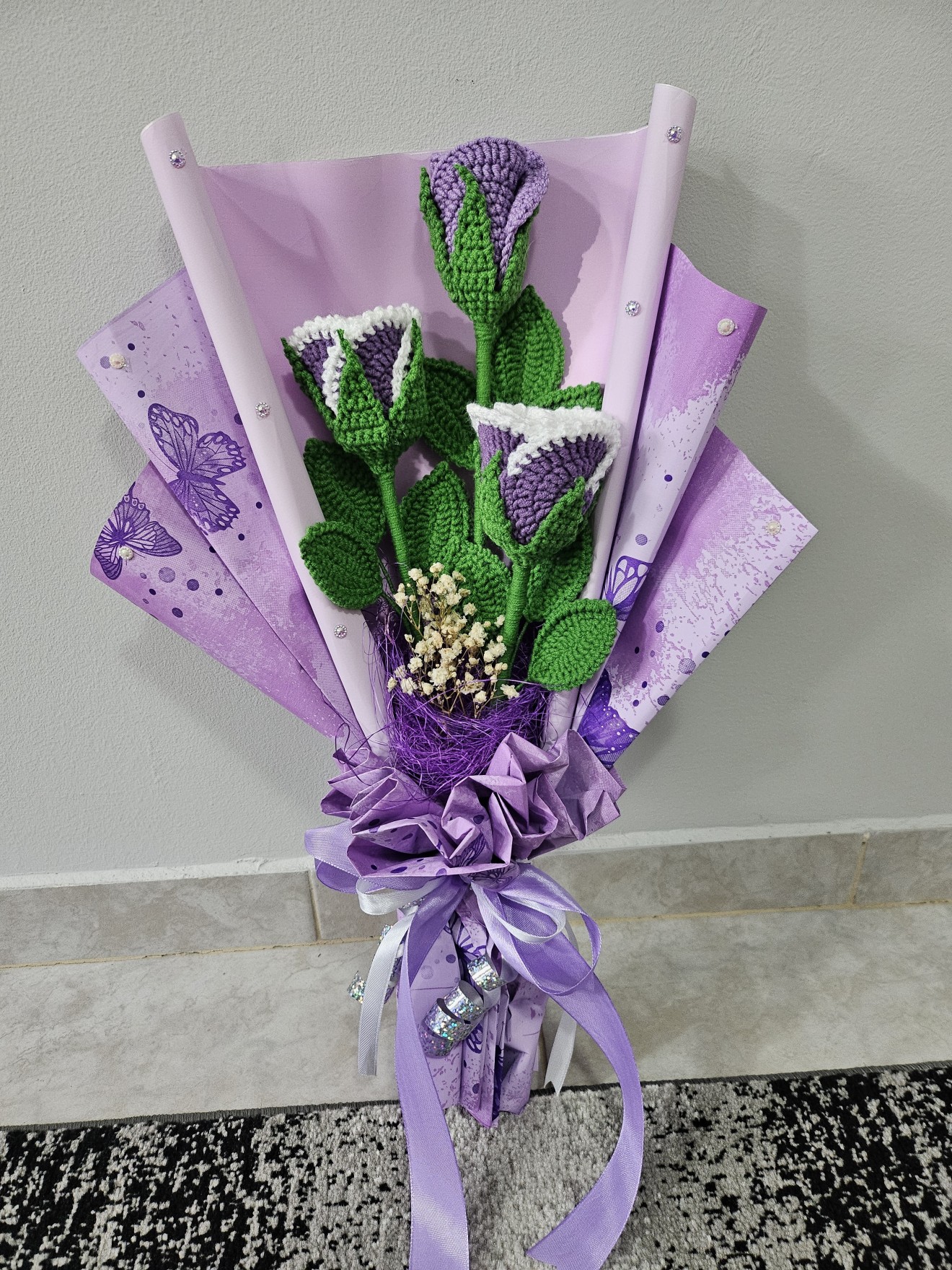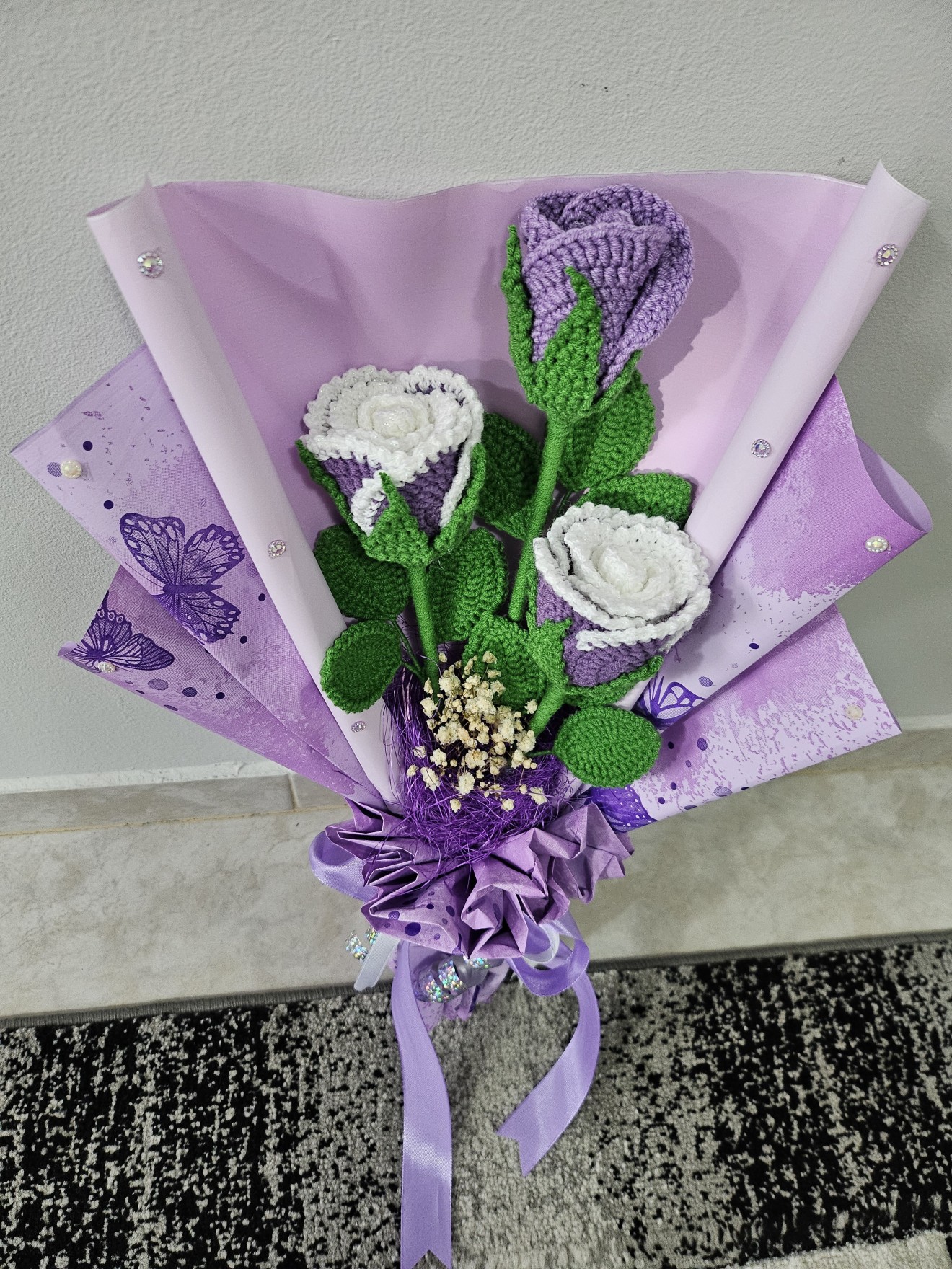 Страхотен букет от ръчно плетени лилави рози. Подходящ за подарък с и без повод. Възможност за изработка в различни цветове. По поръчка.