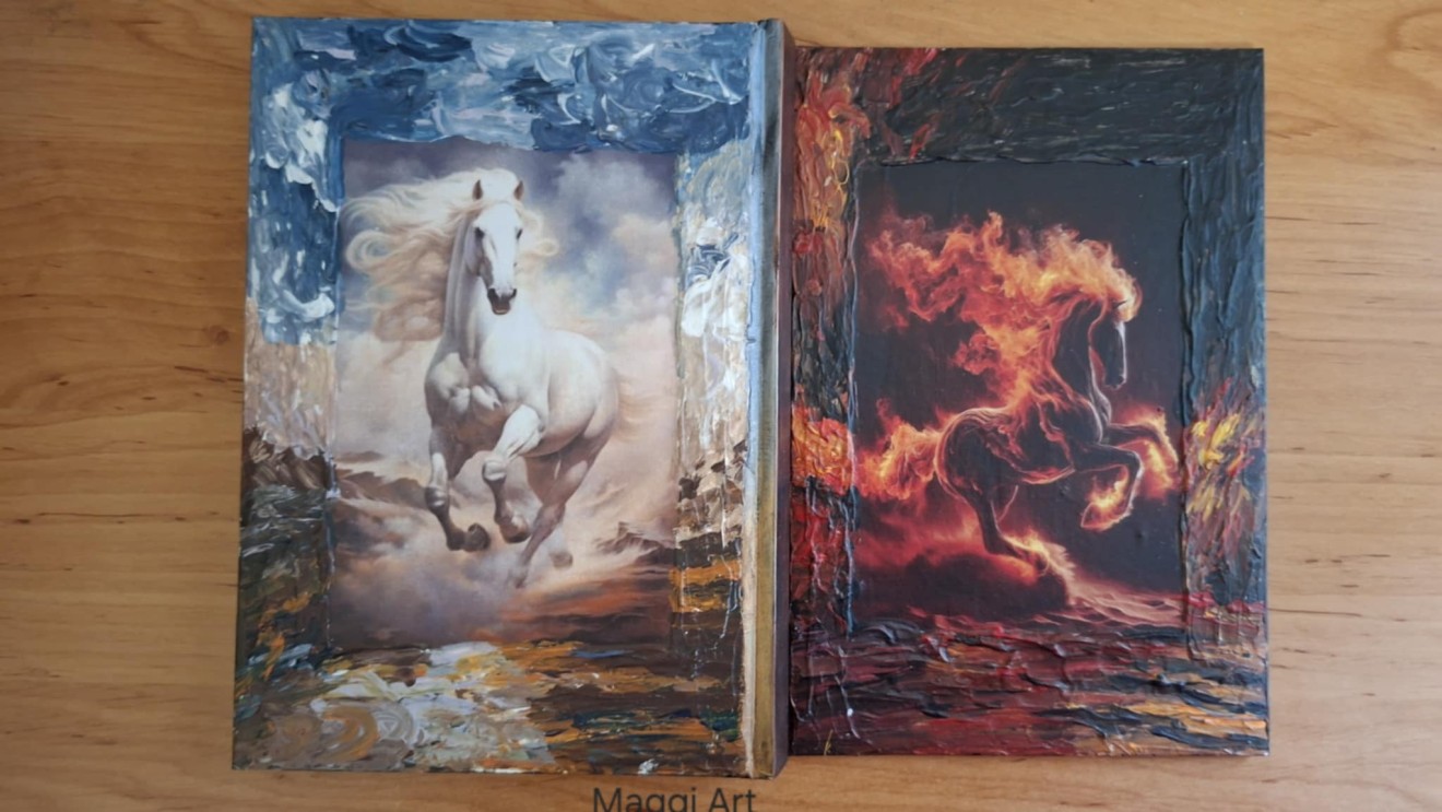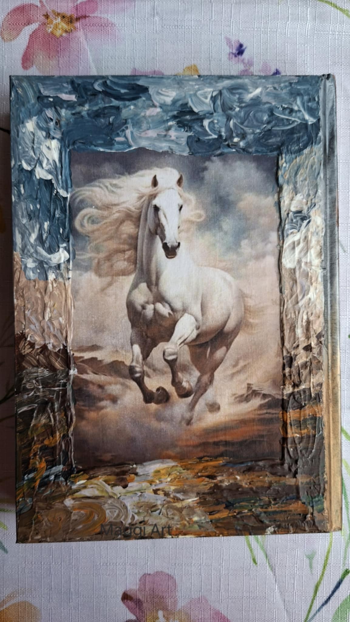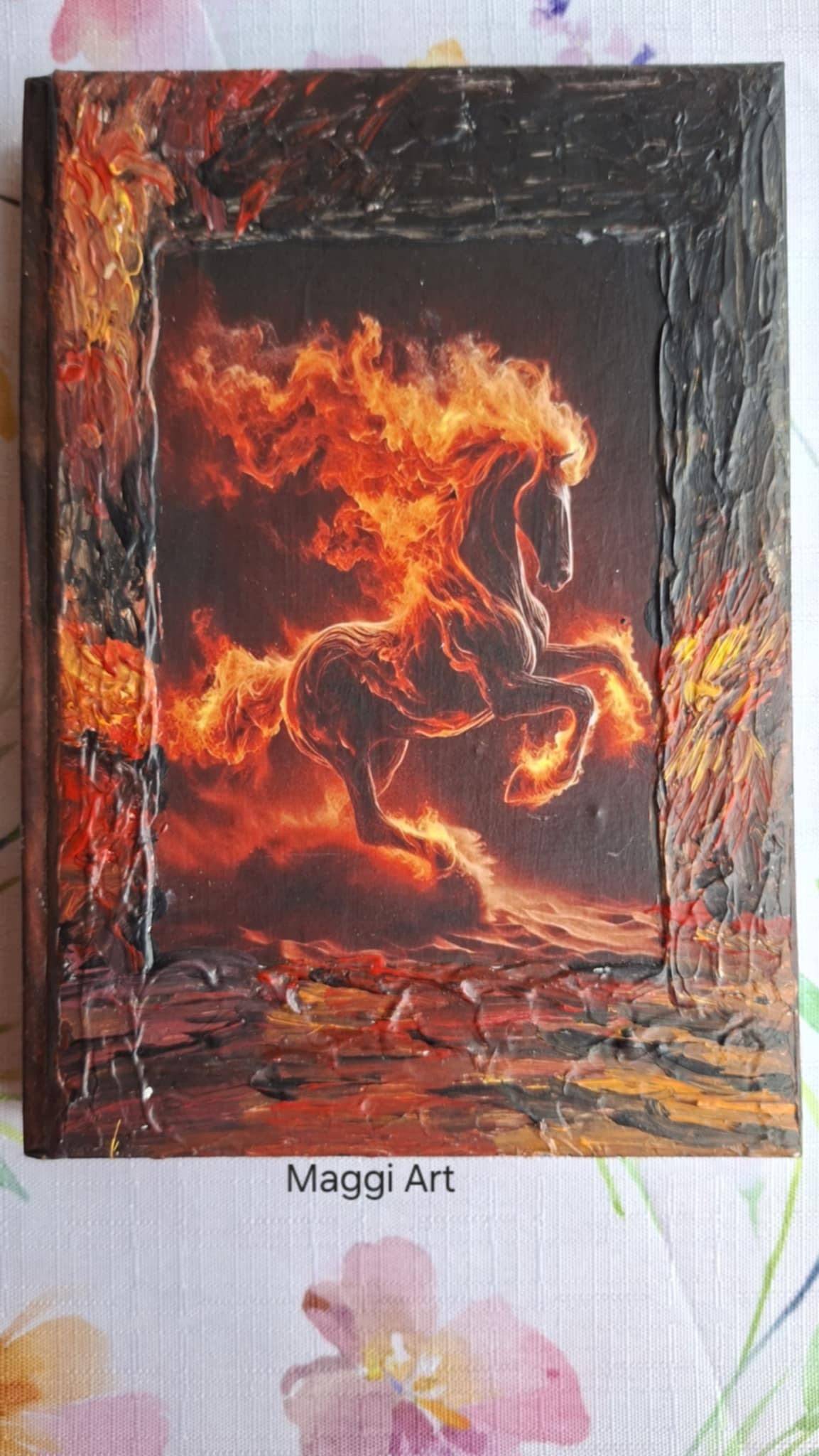 Предстои годината на Огнения кон според Китайският зодиак. Тя носи изключително силна енергия,висок ритъм на живот,страст, свобода и помага на смелите. За късмет и успехи е моят нов тефтер"Огнен кон" изработен с много внимание и в цветовете на новата 2026 година. Тефтерът е размер А5 и има 200 листа за писане,разделител. Изработен с техника художествен декупаж,акрилни бои,структурни и вакс пасти,контури и лак.Кориците върху,които работя са от Еко кожа.
